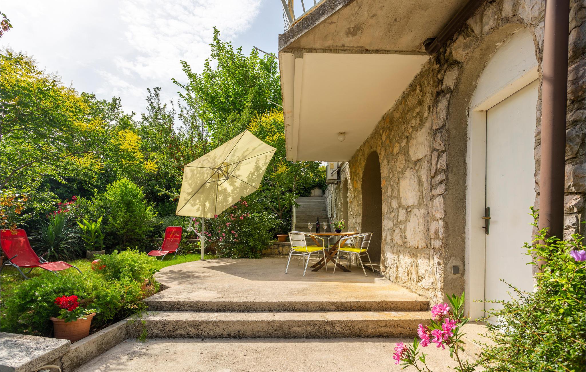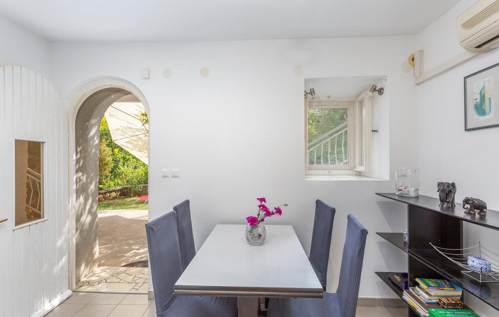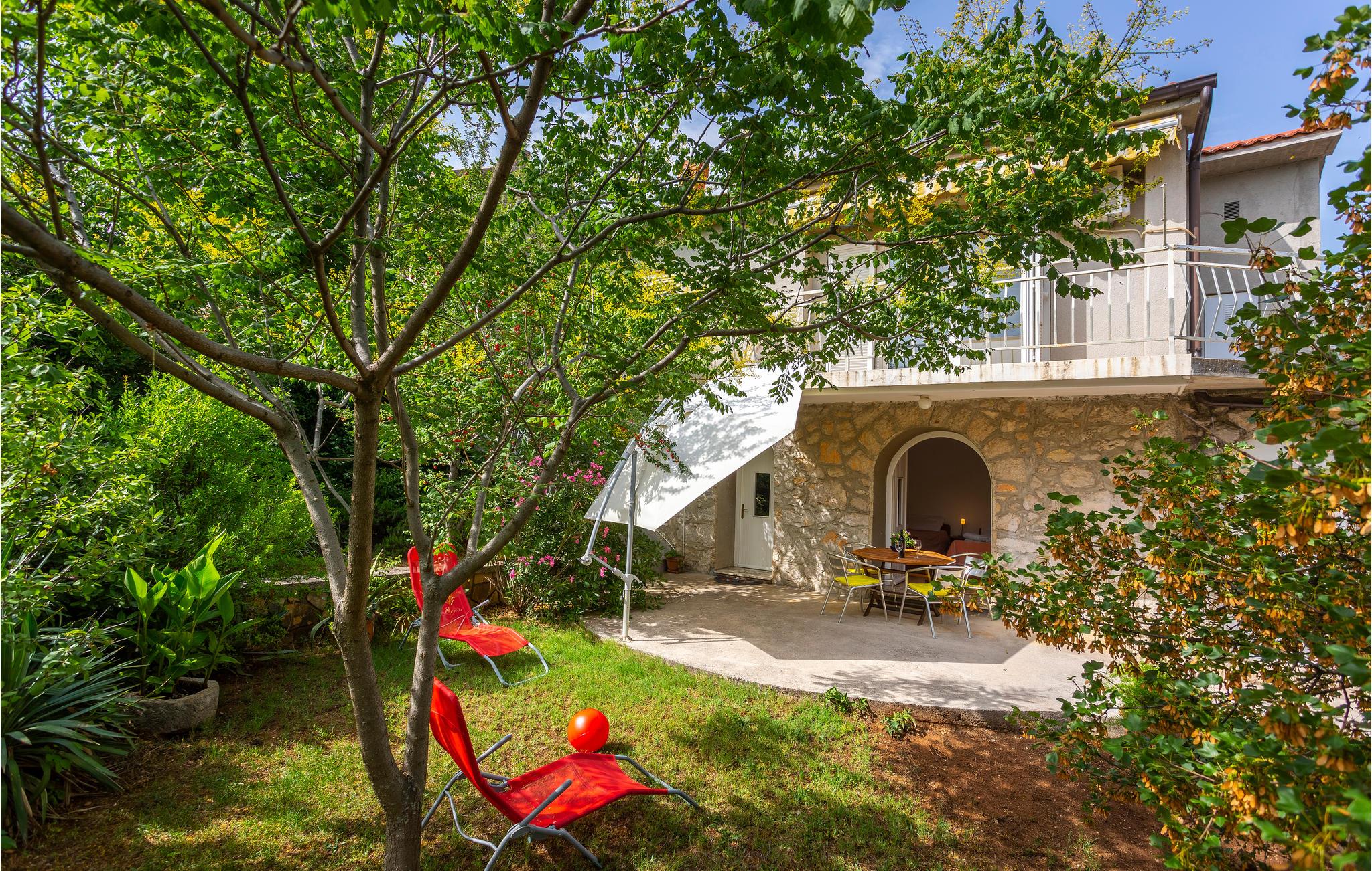 Slapp av i vakre Omialj, på øya Krk, i denne koselige ferieleiligheten som ligger i første etasje. Huset ligger på en høyde, og det er trapper ned til ferieleiligheten. Nyt de varme sommerdagene ute på terrassene, som ligger vakkert innbakt i de grønne omgivelsene. Du kan gå til nærmeste strand, og bilen kan parkeres på parkeringsplassen ved eiendommen. Det milde klimaet, den gunstige geografiske beliggenheten og mangfoldet i det vakre landskapet gjør denne øya til et attraktivt reisemål for mange besøkende.