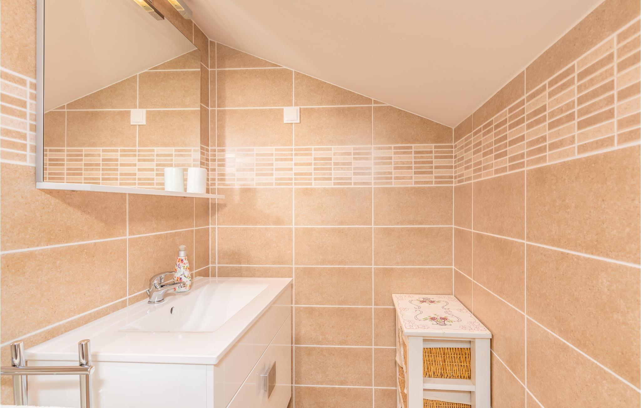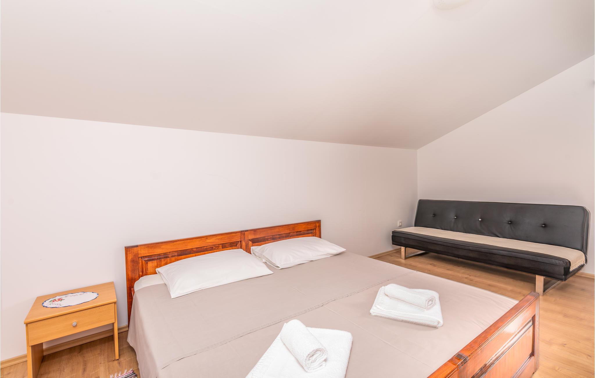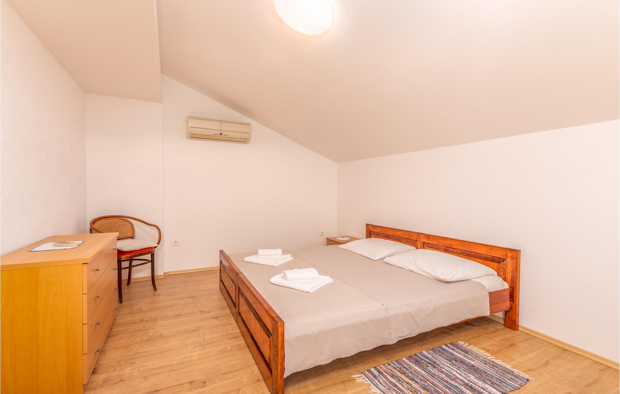 Denne funksjonelt innredede ferieleiligheten ligger i Omisalj på øya Krk. Leiligheten har to etasjer og strekker seg fra første etasje til loftet, hvor den laveste takhøyden er 110 cm. Den vakre terrassen gir deg utsikt over havet og det omkringliggende fredelige landskapet. Parkeringsplassen som tilhører leiligheten ligger på den lukkede eiendommen. En veldig kort spasertur nedover fører deg direkte til stranden. Omisalj er en historisk by som er veldig livlig i sommermånedene. Øya Krk er perfekt for aktive ferierende som ønsker å gå fotturer, sykle og wakeboard. Omisalj er hjem til den eneste internasjonale flyplassen i regionen.