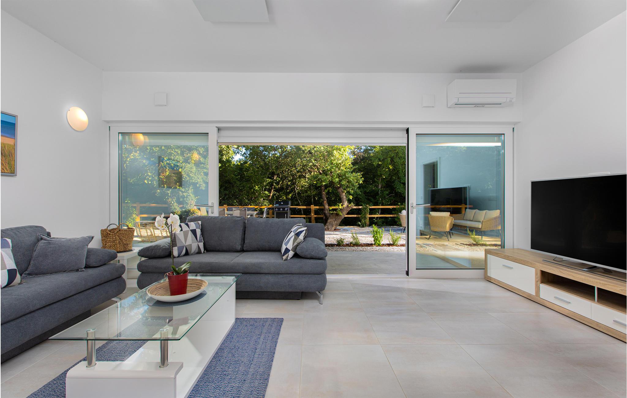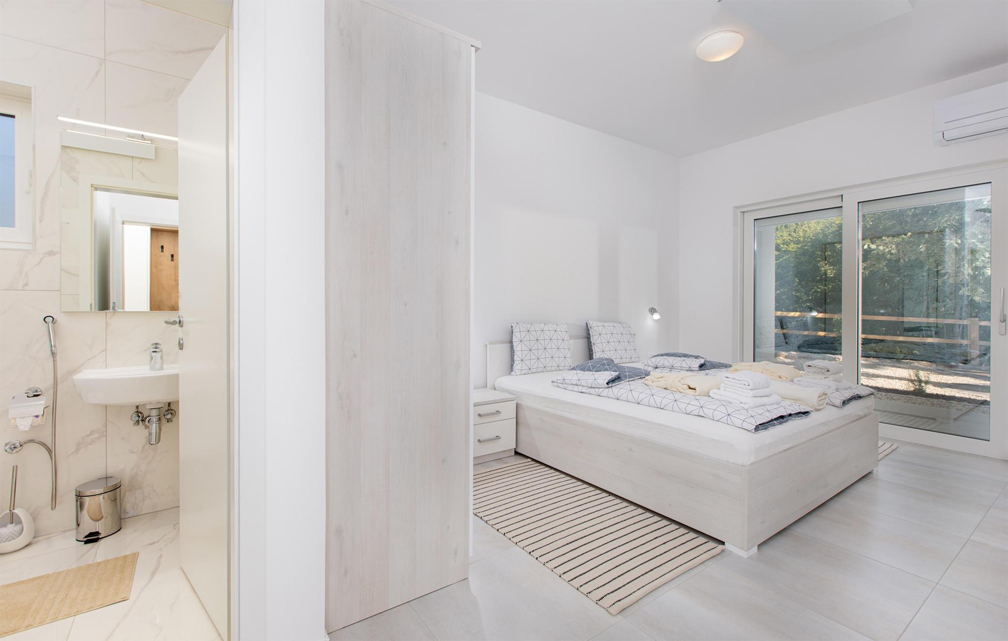 Interiøret er vakkert og romslig, stuen og kjøkkenet er fullt utstyrt med alt du trenger. Soverommene har eget bad, slik at alle gjester kan nyte sin egen komfortable plass. Huset har en veldig rolig beliggenhet omgitt av vakker natur, men det er likevel butikker, restauranter og vakre strender i nærheten.