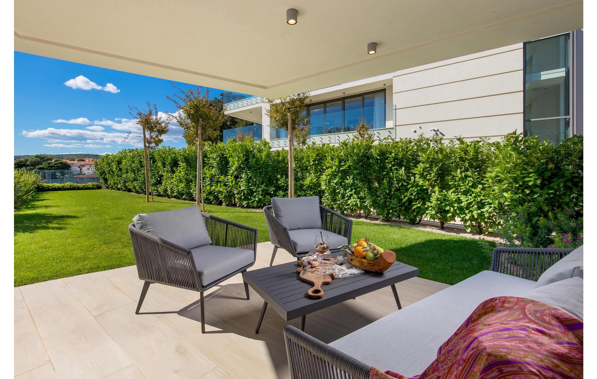 Leiligheten har flere felles fasiliteter, så du vil ikke mangle noe. Forfrisk deg i det store utendørsbassenget, slapp av på solterrassen og bruk salongen med minibar, dusj og omkledningsrom. Det er også en felles badstue til din bruk. Denne leiligheten ligger i første etasje og har egen inngjerdet hage.