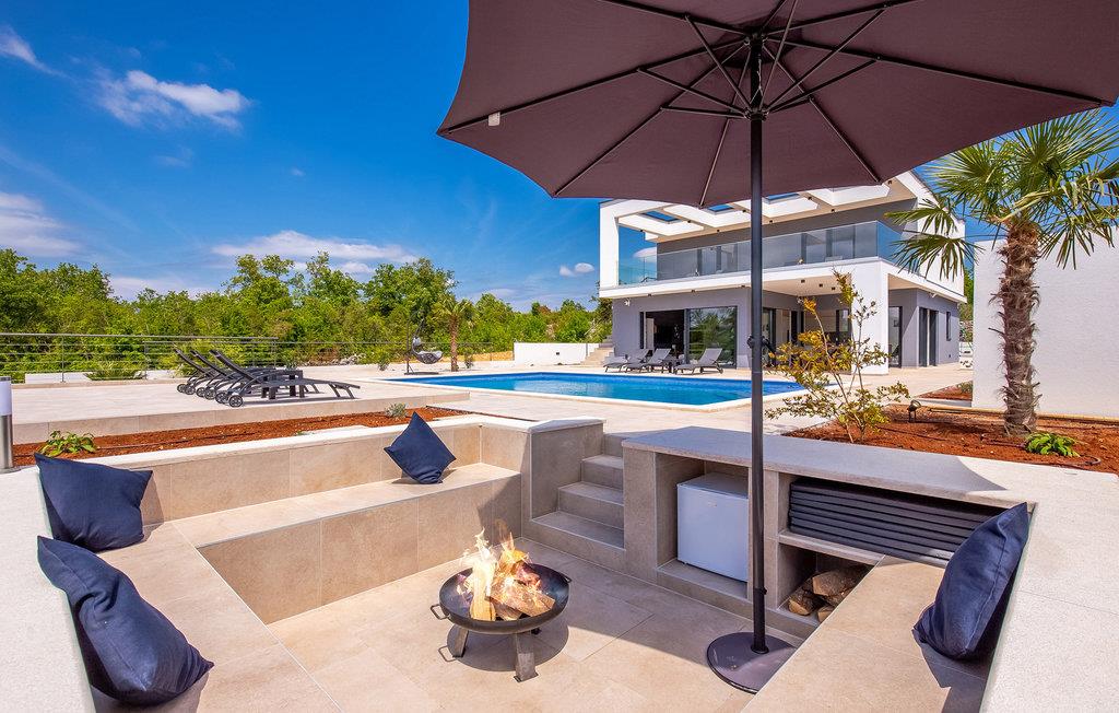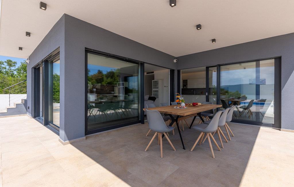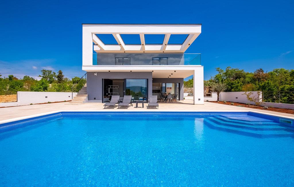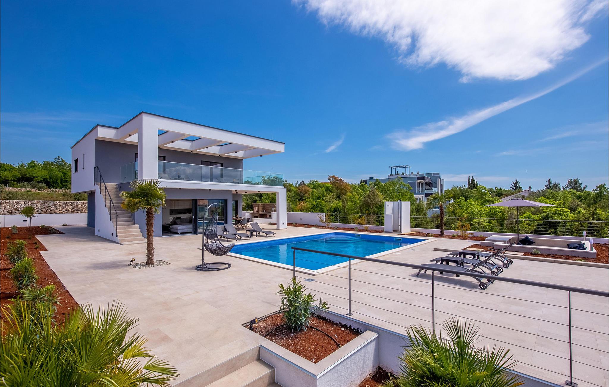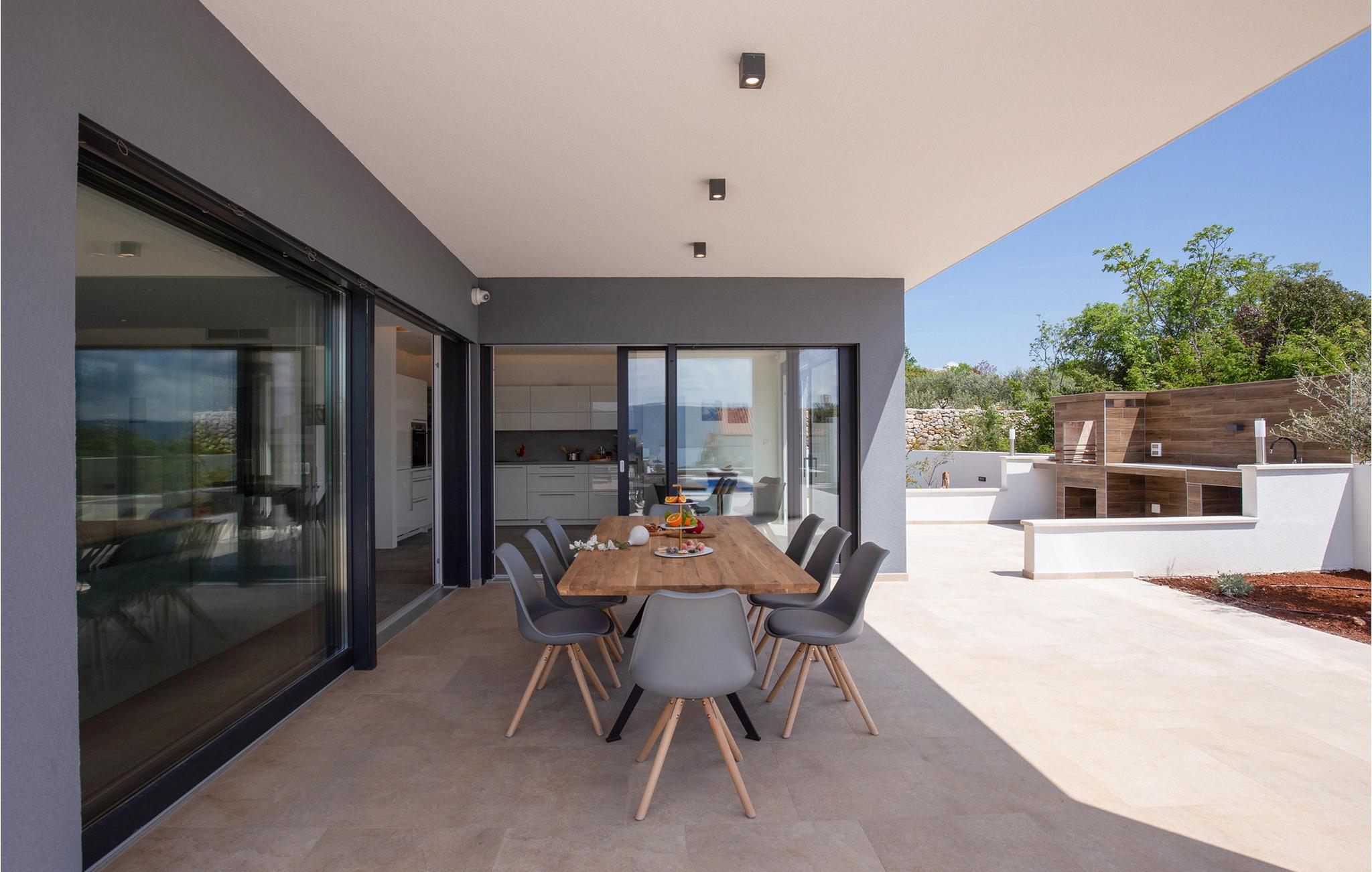 På den vakre øya Krk, i landsbyen Pinezi?i, finner du den moderne Villa Quadra. Villa Quadra ligger bare 500 meter fra sjøen, og er et ideelt sted for deg som ønsker å tilbringe en aktiv ferie på en av de største og vakreste øyene i Adriaterhavet. Den vakkert innredede Villa Quadra har 200 m2 med plass til 10 personer fordelt på 5 moderne designede soverom og 4 bad. I villaens første etasje finner du et soverom og et bad. Det eksklusivt innredede kjøkkenet og spisestuen er det perfekte stedet for et familiemåltid, mens du kan slappe av fra sommervarmen i den vakre salongen med aircondition. I første etasje finner du også et separat toalett, bod, vaskerom og en trapp opp til andre etasje. I andre etasje finner du 3 flotte soverom, alle med eget bad, og et barnerom med køyesenger. På gårdsplassen til villaen er det et vakkert 54 m² stort basseng omgitt av 10 solsenger. I den inngjerdede hagen er det også en utendørs grill som gir gjestene privatliv. Villaen har også underholdningsfasiliteter som lekeplass, smart-TV, fotballutstyr (lite mål) og en plen hvor du kan sole deg. Øya Krk har vært et populært turistmål siden 1800-tallet. Utvalget av overnattingssteder og tilretteleggingen av vakre strandturer blir stadig forbedret på øya, noe som beskytter miljøet og gjør den til et svært ettertraktet turistmål. Det finnes et stort utvalg av leiligheter, rom og luksuriøse villaer på øya Krk. 14 vakre strender bærer det blå flagget og er et eksempel på hvor rent havet og kysten er. Byen Pinezi?i er kjent for kirken Sveta Fuska og kapellet St. Marina i Skrpcica. I dag er innbyggerne svært stolte av arven fra oliven- og vindyrking, som gir lokale druer og olje av høy kvalitet. Oppskriftene stammer fra forfedrenes tid, da de var beskyttere og gjetere i dette området. Kjæledyr er tillatt på dette overnattingsstedet etter eierens skjønn eller mot et gebyr.