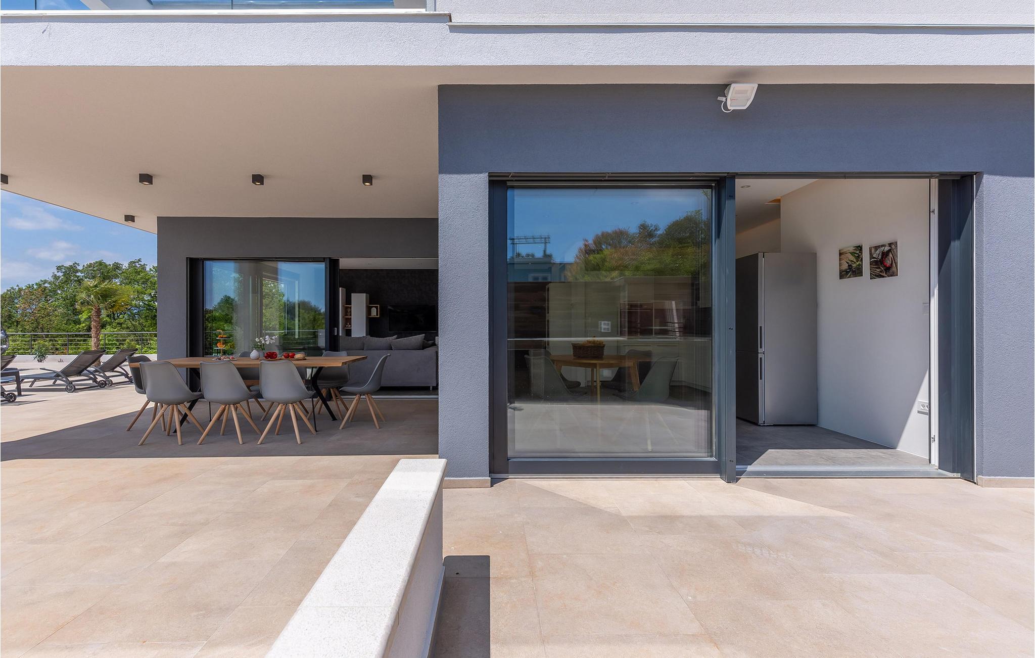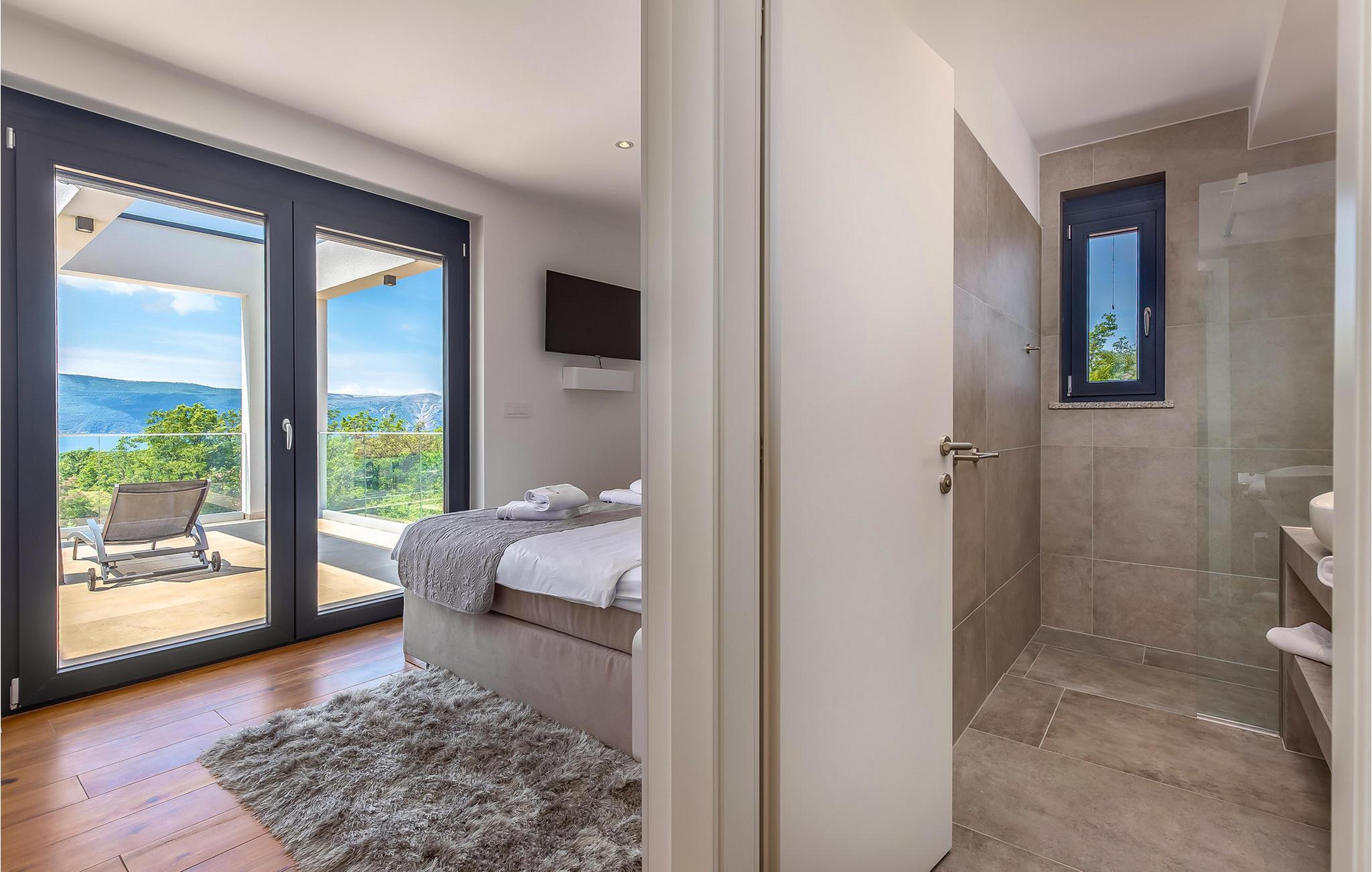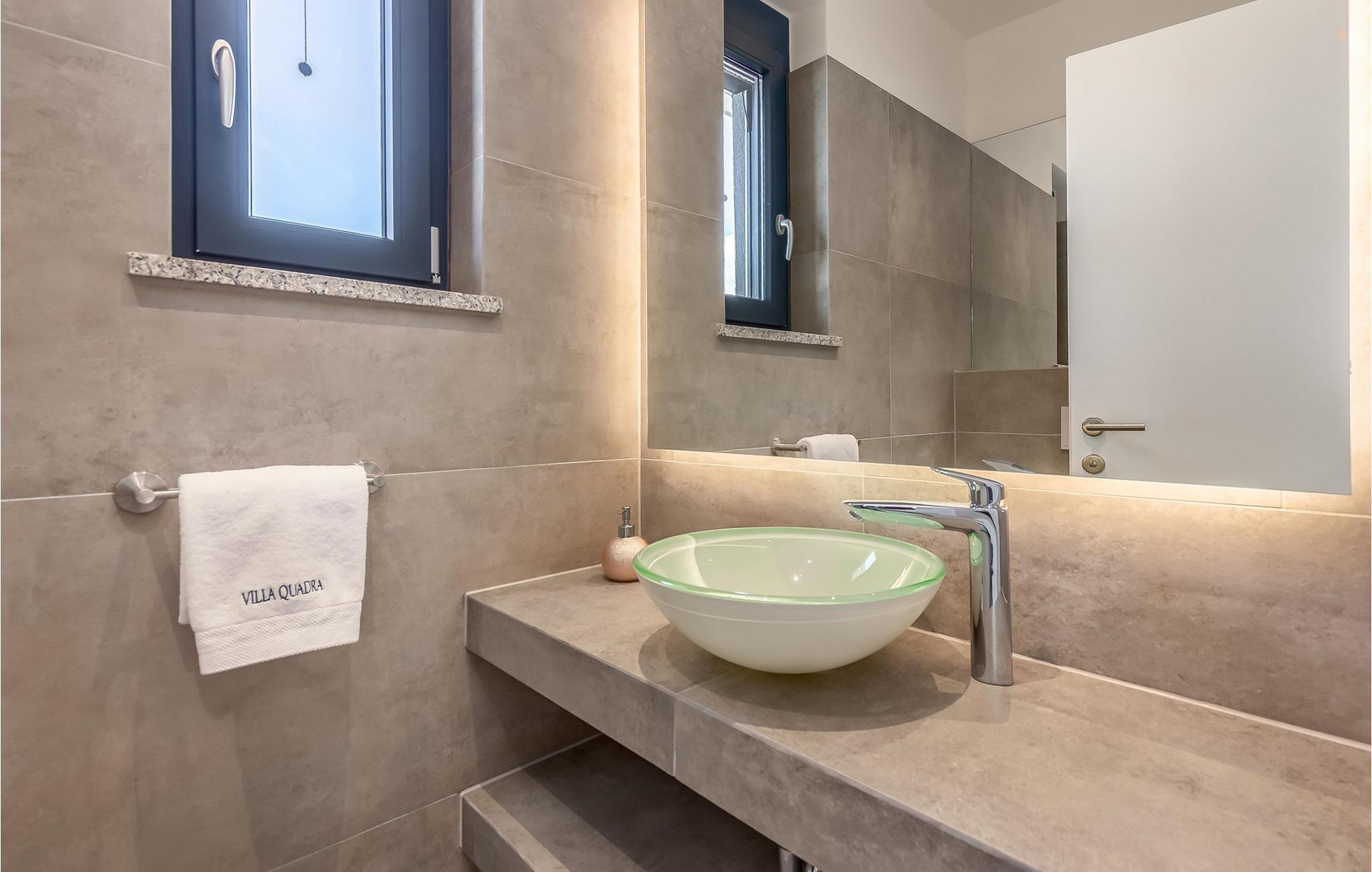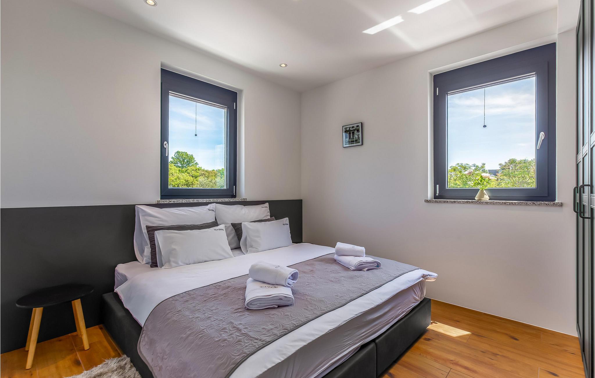 På den vakre øya Krk, i landsbyen Pinezi?i, finner du den moderne Villa Quadra. Villa Quadra ligger bare 500 meter fra sjøen, og er et ideelt sted for deg som ønsker å tilbringe en aktiv ferie på en av de største og vakreste øyene i Adriaterhavet. Den vakkert innredede Villa Quadra har 200 m2 med plass til 10 personer fordelt på 5 moderne designede soverom og 4 bad. I villaens første etasje finner du et soverom og et bad. Det eksklusivt innredede kjøkkenet og spisestuen er det perfekte stedet for et familiemåltid, mens du kan slappe av fra sommervarmen i den vakre salongen med aircondition. I første etasje finner du også et separat toalett, bod, vaskerom og en trapp opp til andre etasje. I andre etasje finner du 3 flotte soverom, alle med eget bad, og et barnerom med køyesenger. På gårdsplassen til villaen er det et vakkert 54 m² stort basseng omgitt av 10 solsenger. I den inngjerdede hagen er det også en utendørs grill som gir gjestene privatliv. Villaen har også underholdningsfasiliteter som lekeplass, smart-TV, fotballutstyr (lite mål) og en plen hvor du kan sole deg. Øya Krk har vært et populært turistmål siden 1800-tallet. Utvalget av overnattingssteder og tilretteleggingen av vakre strandturer blir stadig forbedret på øya, noe som beskytter miljøet og gjør den til et svært ettertraktet turistmål. Det finnes et stort utvalg av leiligheter, rom og luksuriøse villaer på øya Krk. 14 vakre strender bærer det blå flagget og er et eksempel på hvor rent havet og kysten er. Byen Pinezi?i er kjent for kirken Sveta Fuska og kapellet St. Marina i Skrpcica. I dag er innbyggerne svært stolte av arven fra oliven- og vindyrking, som gir lokale druer og olje av høy kvalitet. Oppskriftene stammer fra forfedrenes tid, da de var beskyttere og gjetere i dette området. Kjæledyr er tillatt på dette overnattingsstedet etter eierens skjønn eller mot et gebyr.