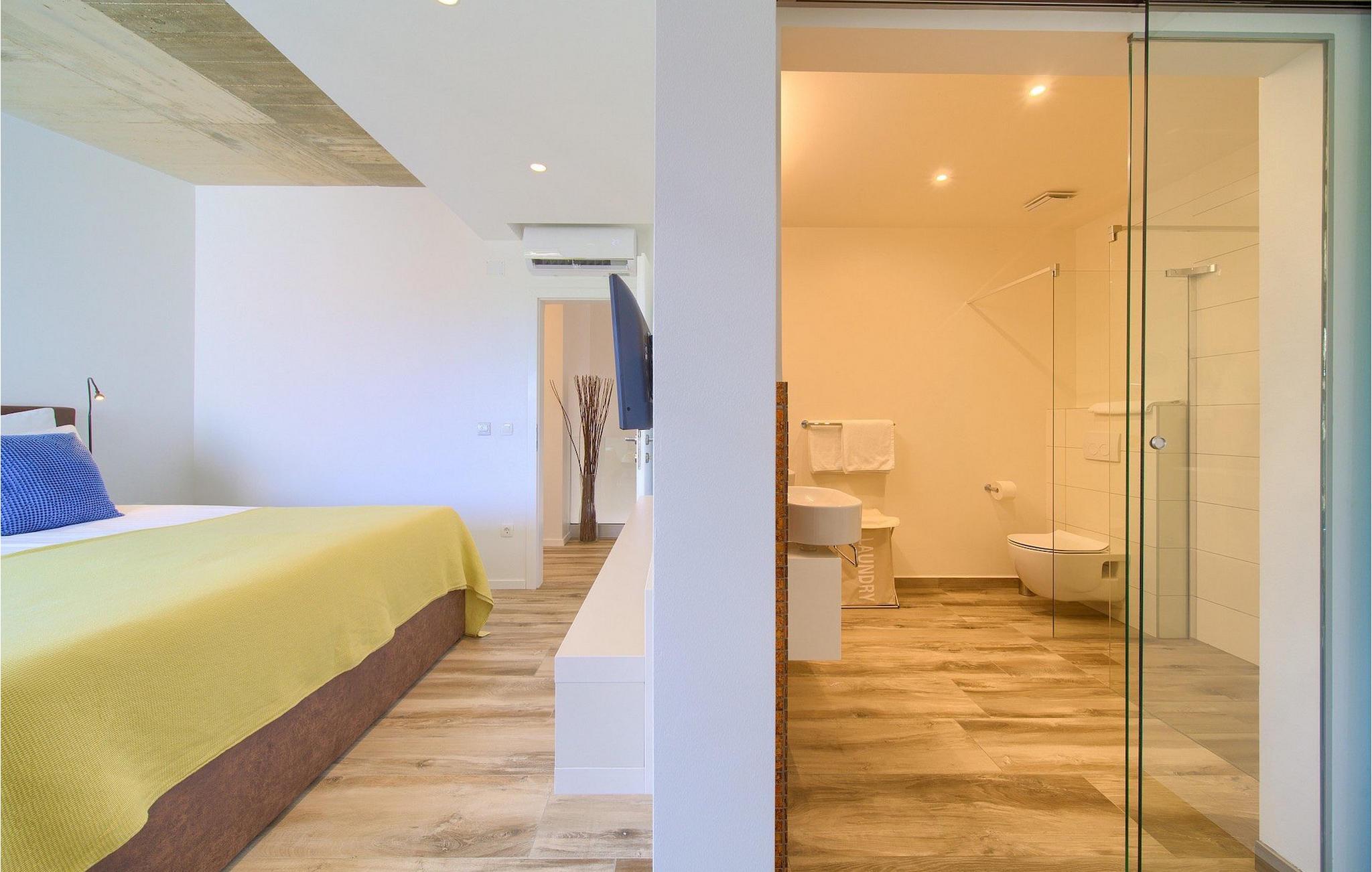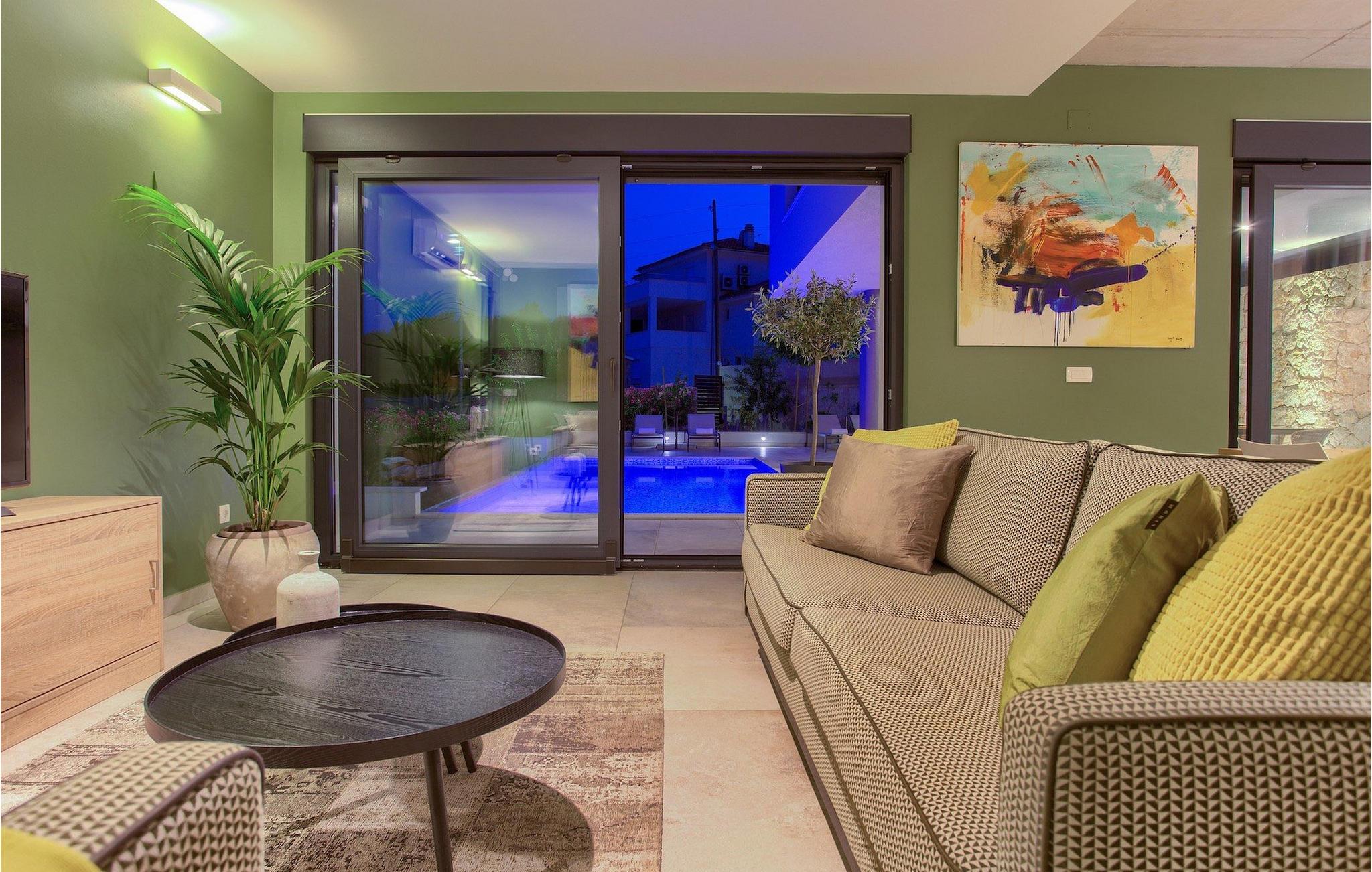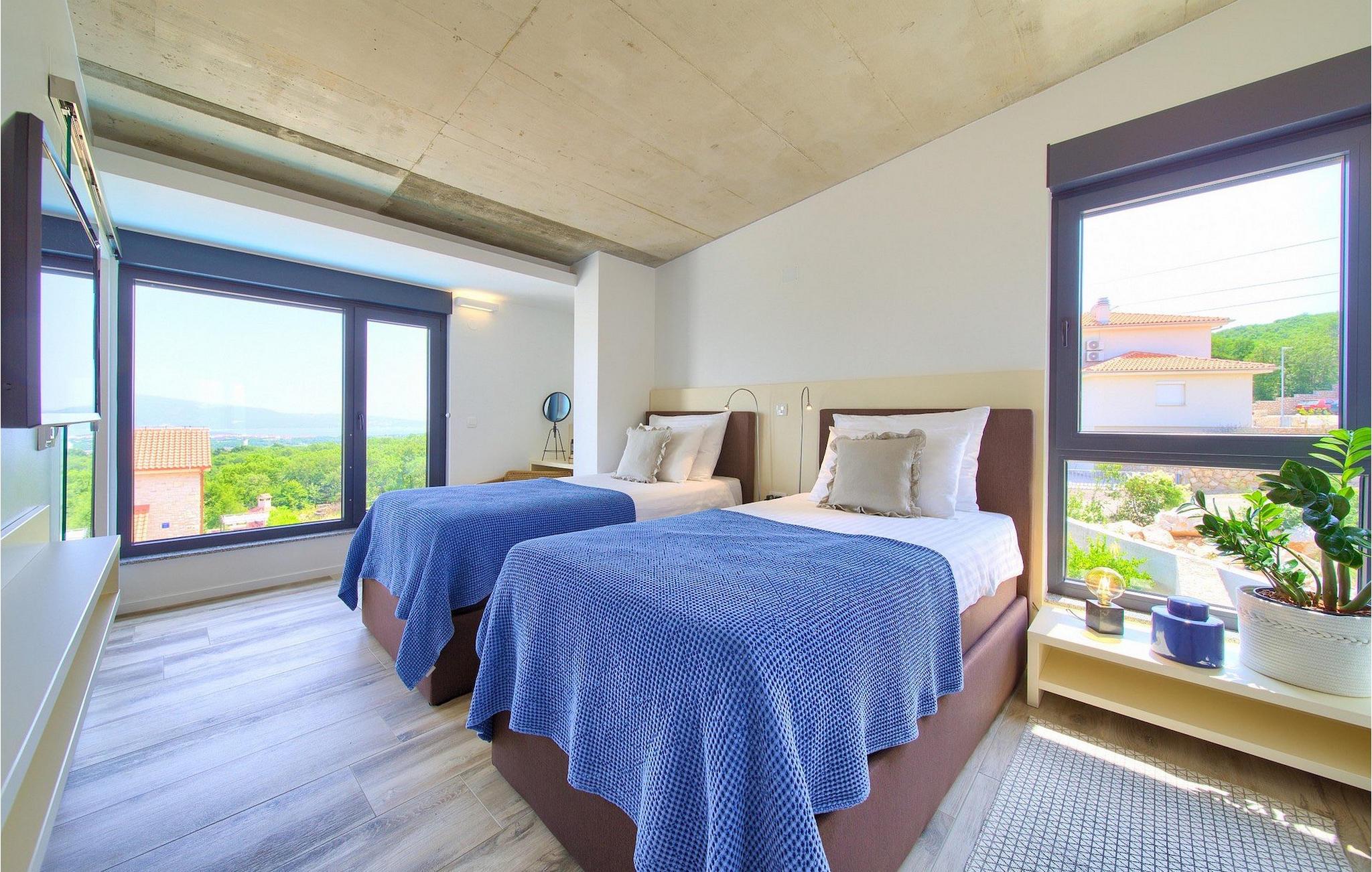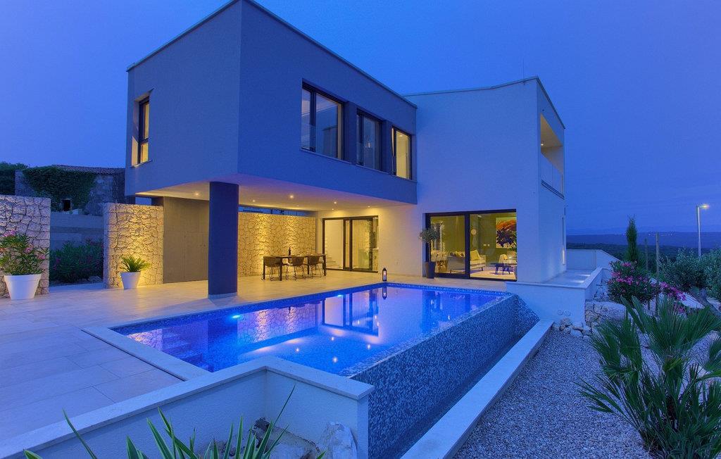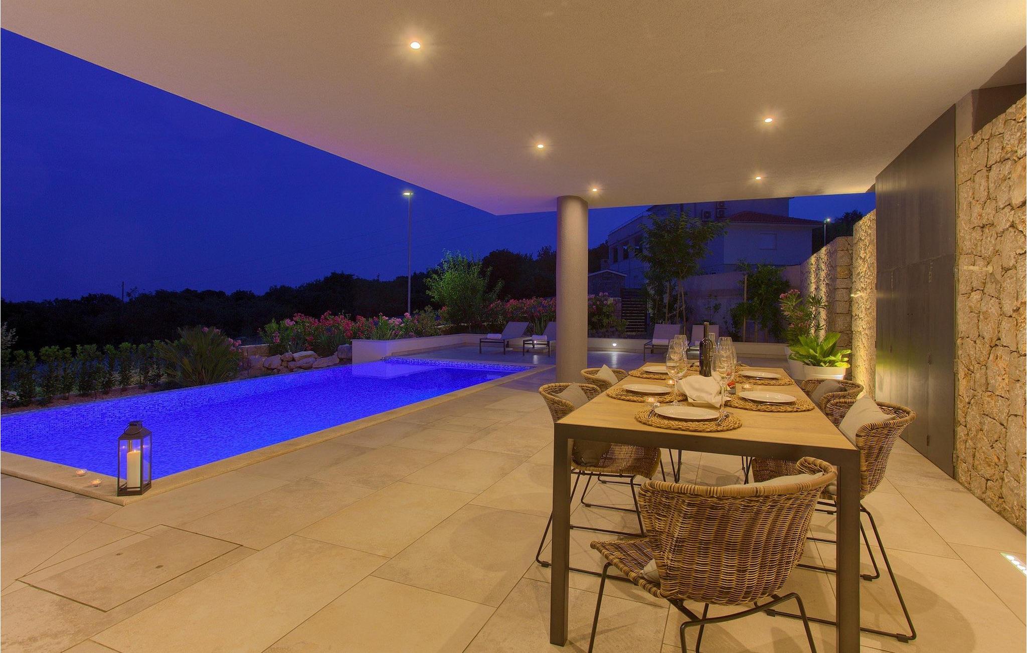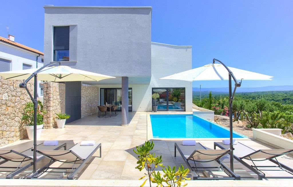 Denne utsøkte villaen ligger på øya Krk i Kvarner-regionen. Huset er perfekt for opptil 6 gjester. Villa Silente er innredet og dekorert med høy standard for å gi gjestene en uforglemmelig ferie. Villaen består av en romslig stue/spisestue i første etasje, som er utstyrt med møbler og materialer av høy kvalitet. Så hvis du vil ha følelsen av å bo i et designerutstillingslokale som bare er for deg, er dette stedet for deg! Første etasje er forbeholdt avslapning og en god natts søvn, for her finner du kun de komfortable soverommene. Det er totalt tre soverom, to med dobbeltsenger og ett med to enkeltsenger, alle med TV, klimaanlegg og eget bad. Første etasje er forbeholdt sammenkomster for hele familien eller vennegjengen, med et vakkert, moderne og fullt utstyrt kjøkken og en koselig stue. Mens interiøret byr på fullstendig avslapning i det stilfullt innredede arkitektoniske mesterverket, byr utsiden på et innbydende basseng og bassengområde samt en uteservering hvor du kan nyte middelhavsklimaet til fulle. Villaen har aircondition, Wi-Fi og en privat parkeringsplass for opptil 4 biler.øya Krk er den nordligste øya i Kroatia. Den ligger i Kvarnerbukten og er anerkjent som et av de mest organiserte og attraktive reisemålene i Adriaterhavet. Gode forbindelser til innlandet, gode turiststrukturer, en variert kystlinje full av små bukter med utsikt over det krystallklare havet og vakker natur, en rekke muligheter for moro og avslapning er grunnen til at Krk er et av de mest interessante turistmålene. Krk er en spesiell øy, en verden i seg selv, unik i fred og renhet, som er lett tilgjengelig fordi den er forbundet med fastlandet via Krk-broen og har sin egen flyplass, ca. 30 kilometer fra Rijeka.
