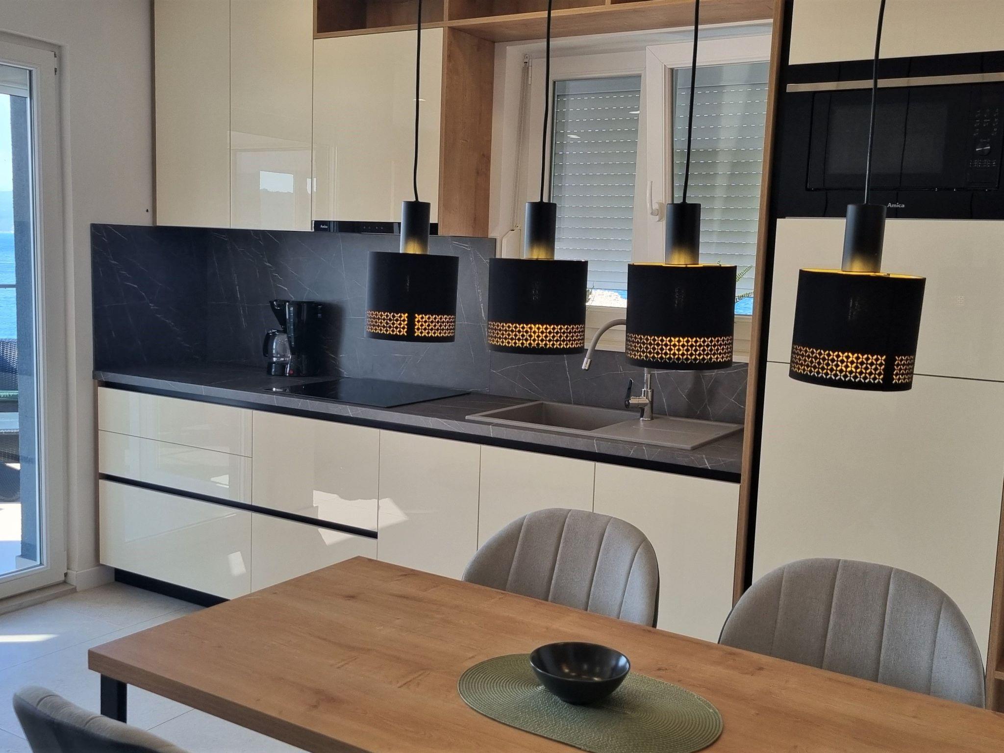 This luxurious and modern flat is located in a quiet apartment complex just 30 metres from the sea, surrounded by nature, many bays, pebble beaches and hiking trails. It offers a communal saltwater pool (36 m2), which is open from May to October and whose temperatures usually reach 20-26 °C. The flat is located on the 2nd floor and has a bedroom with a double bed, a modern kitchen with induction hob, fridge-freezer, kettle, coffee machine, toaster, microwave and dishwasher. The bathroom has a shower and toilet. The dining area and living room offer a cosy space with a sofa and smart TV, while free WiFi is available throughout the building.