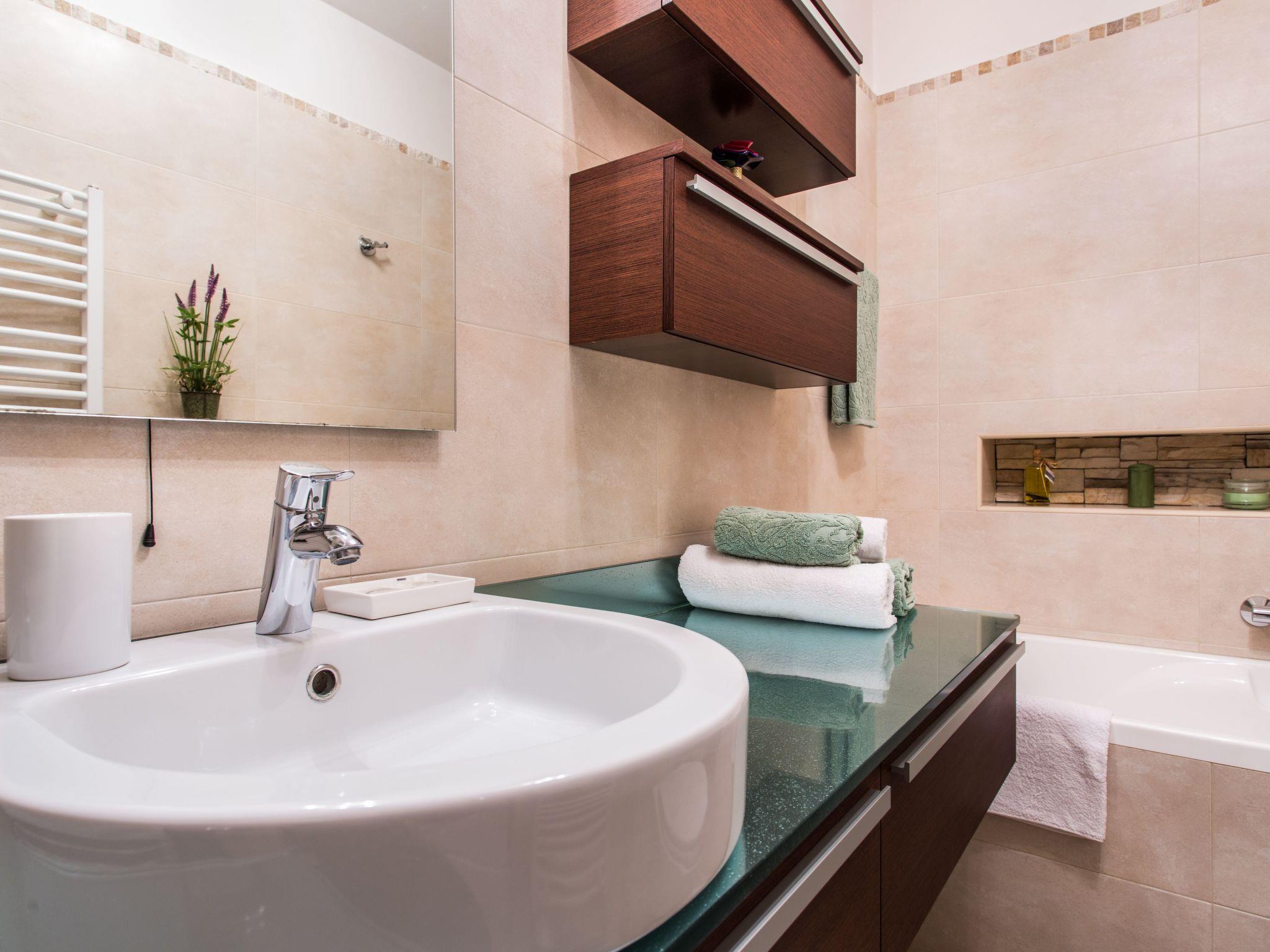 The apartment also has a balcony with seating, deckchairs and a beautiful view of the sea. In the garden on the ground floor there is a shared sunbathing area with deckchairs and a beautiful heated swimming pool.