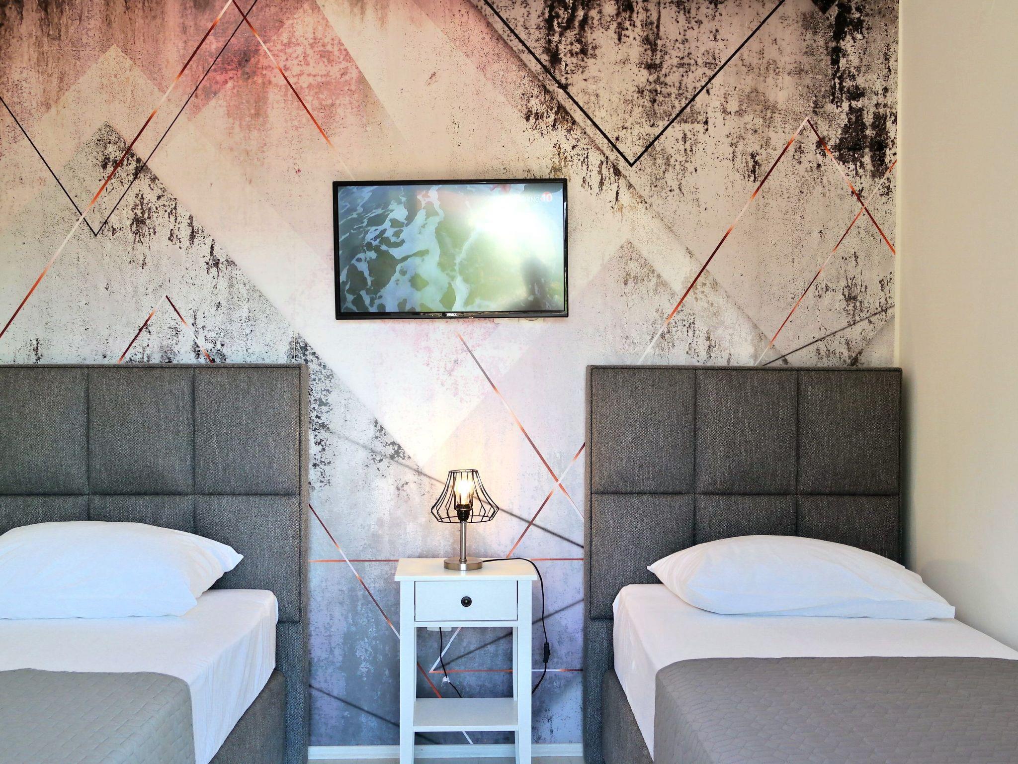 • Bedroom 2: Two single beds (90x200 cm), satellite TV, air-conditioning, and access to the balcony.