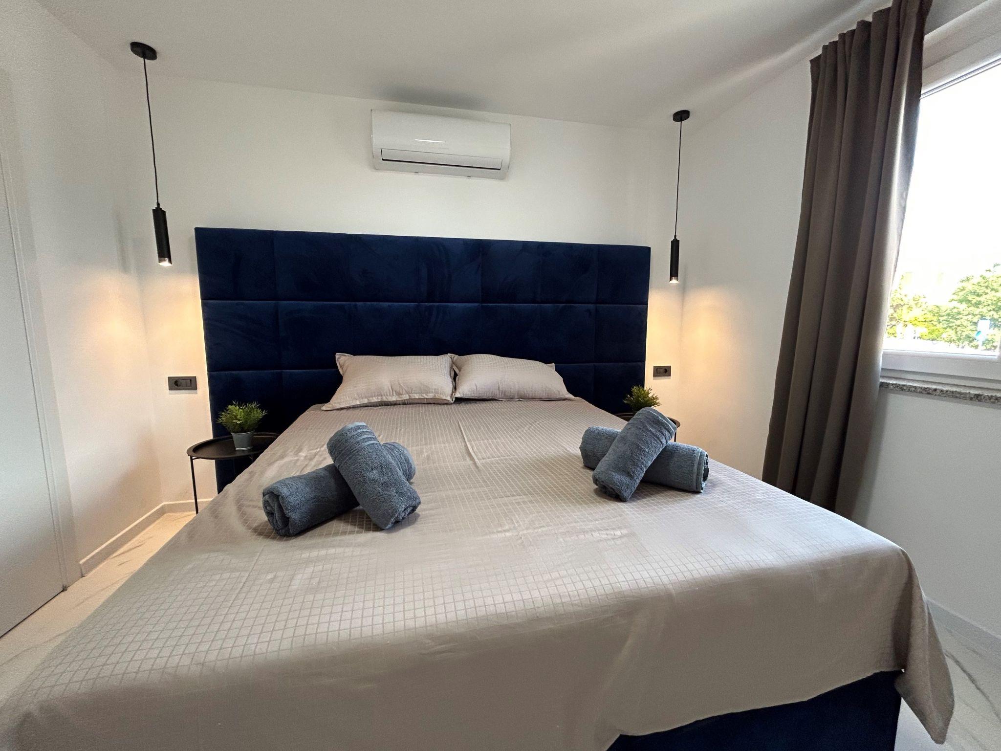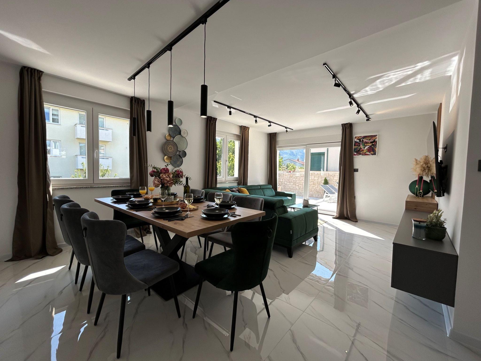 This beautiful and modern Villa Velvet is located in the center of Baška, small, remote and charming place on island Krk. Villa Velvet is cosy and spacious, and can accomodate up to 8 people. It consists of 4 bedrooms, 4 bathrooms and separeted toilet, large living and dining area and well equiped kitchen. You can enjoy summer nights with your family in the backyard of this Villa where you can find pool and BBQ. Villa is airconditioned, has wi-fi, washing machine and dishwasher.In this Villa you can come with your pet with prior notice and for extra surcharge.