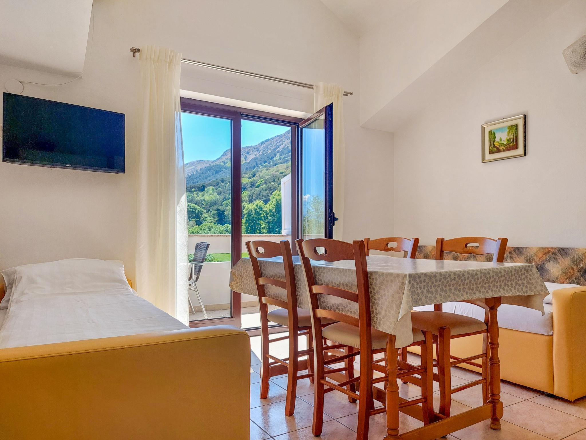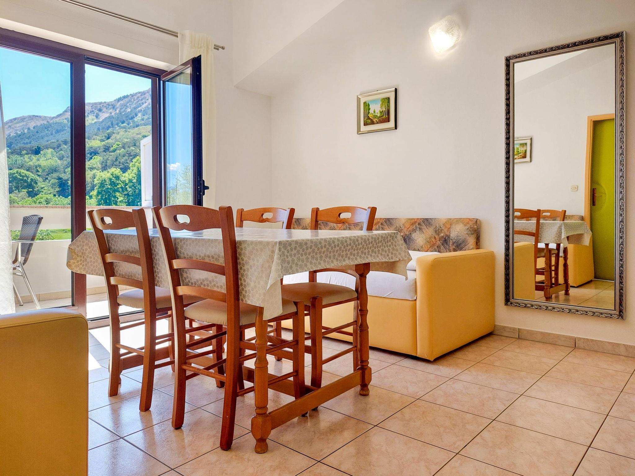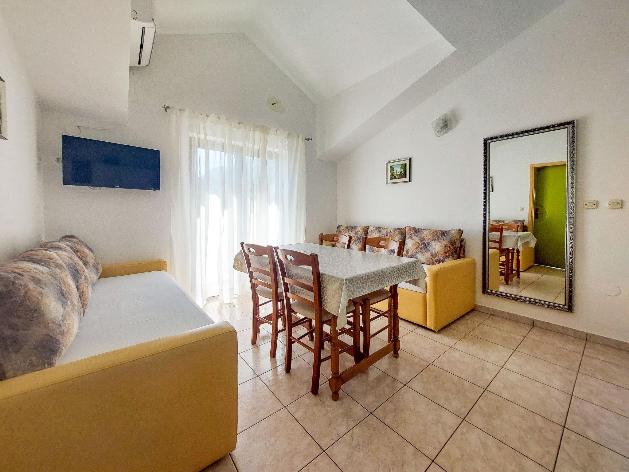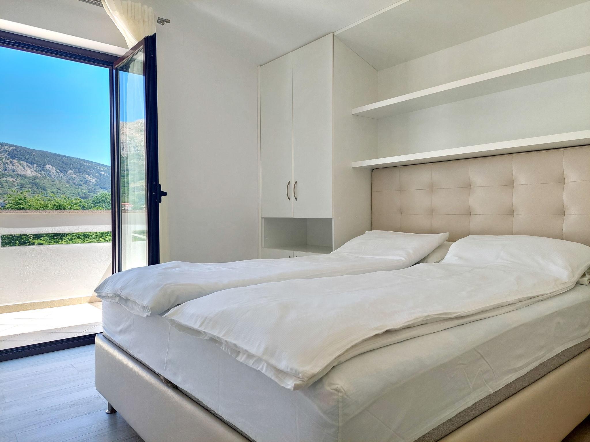"Marija", 2-room apartment 39 m2 on 2nd floor. Living/dining room with 2 sofabeds (80 cm, length 200 cm), satellite TV and air conditioning. Exit to the balcony. 1 room with 1 french bed (160 cm, length 200 cm). Exit to the balcony. Open kitchen (4 hot plates, oven, dishwasher, toaster, kettle, freezer, electric coffee machine). Bath/WC. Forced-air heating. Balcony 3 m2, balcony 6 m2. Balcony furniture. Facilities: washing machine. Internet (WiFi, free). Please note: non-smoking house. Maximum 2 pets/ dogs allowed.