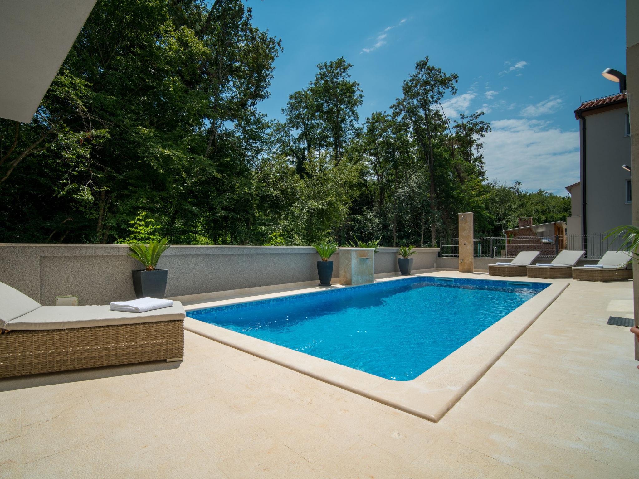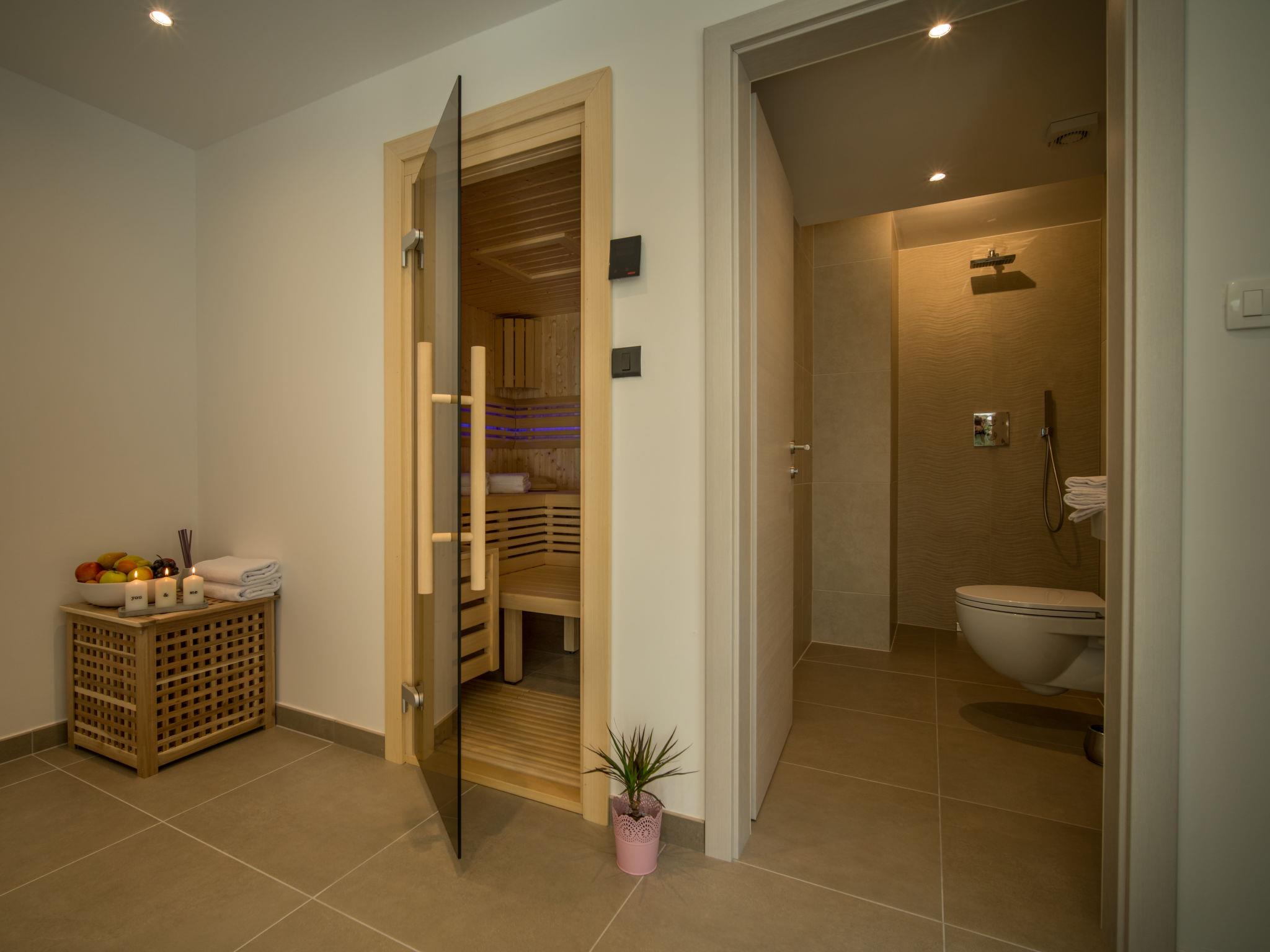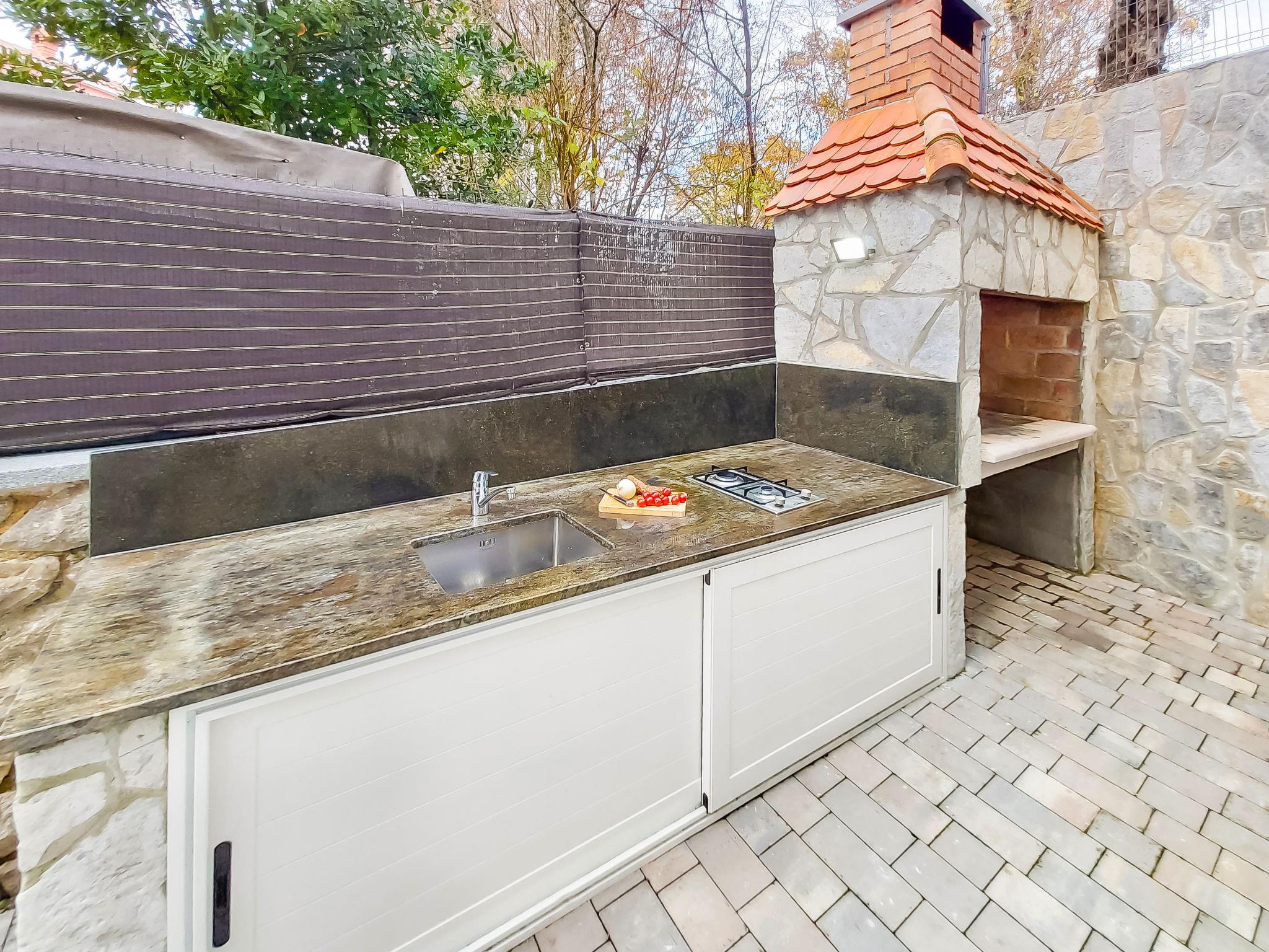 Gornja Hlapa 2 km from Dobrinj: Single-family house "Andela", 3 storeys, built in 2018. 3 km from the centre of Solin, 4 km from the centre of Klimno, 12.5 km from the centre of Malinska, in a quiet, sunny position, 2.5 km from the sea, 2.5 km from the beach, in a cul-de-sac. Private: property 570 m2 (fenced) with lawn 22 m2 wildlife garden, swimming pool angular (9 x 4 m, depth 140 cm, seasonal availability: 01.May. - 15.Oct.) with internal staircase. Outdoor shower, hot tub, barbecue. In the house: internet access, sauna, fitness room, burglar alarm system, washing machine. Parking (for 3 cars) at the house on the premises. Shop 950 m, supermarket 11 km, restaurant 950 m, bus stop 5.2 km, pebble beach 2.5 km, concrete beach 2.5 km. Groups of teenagers on request only. By groups of young people double deposit is requested on arrival.