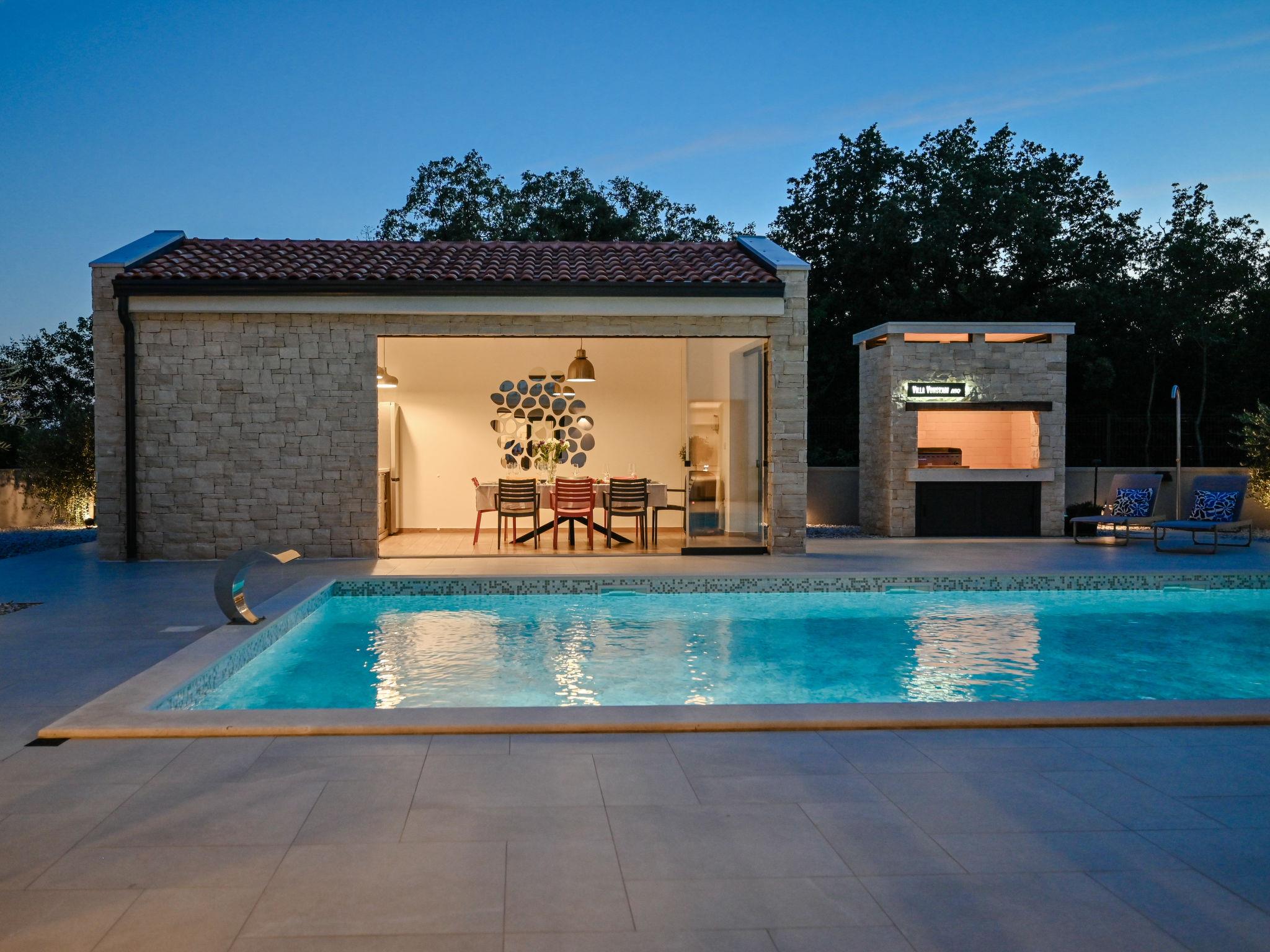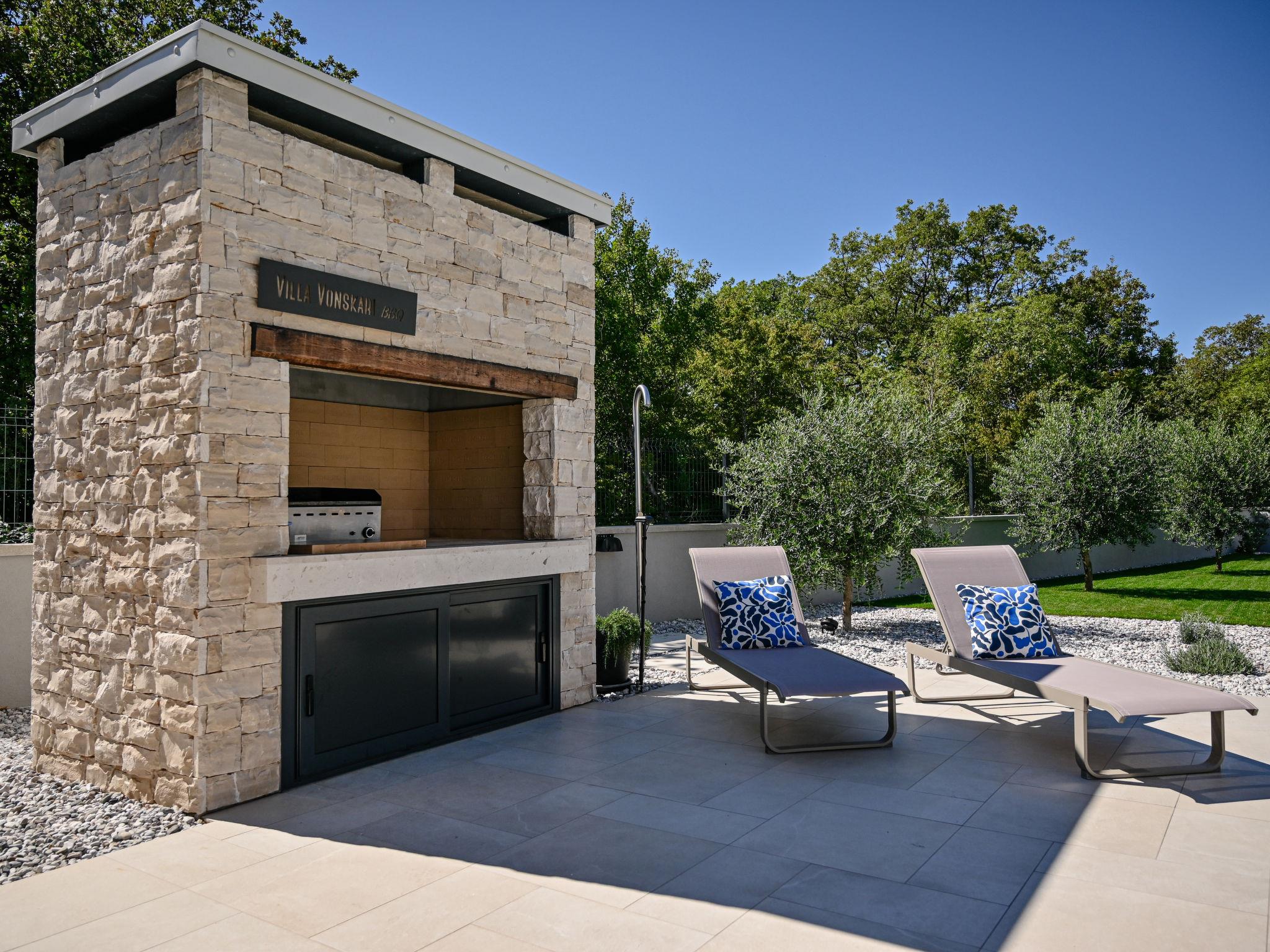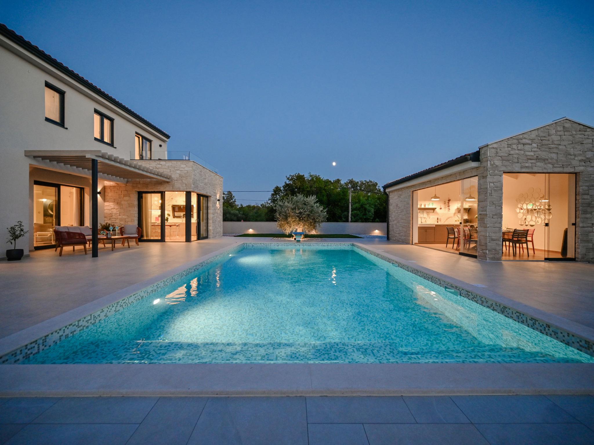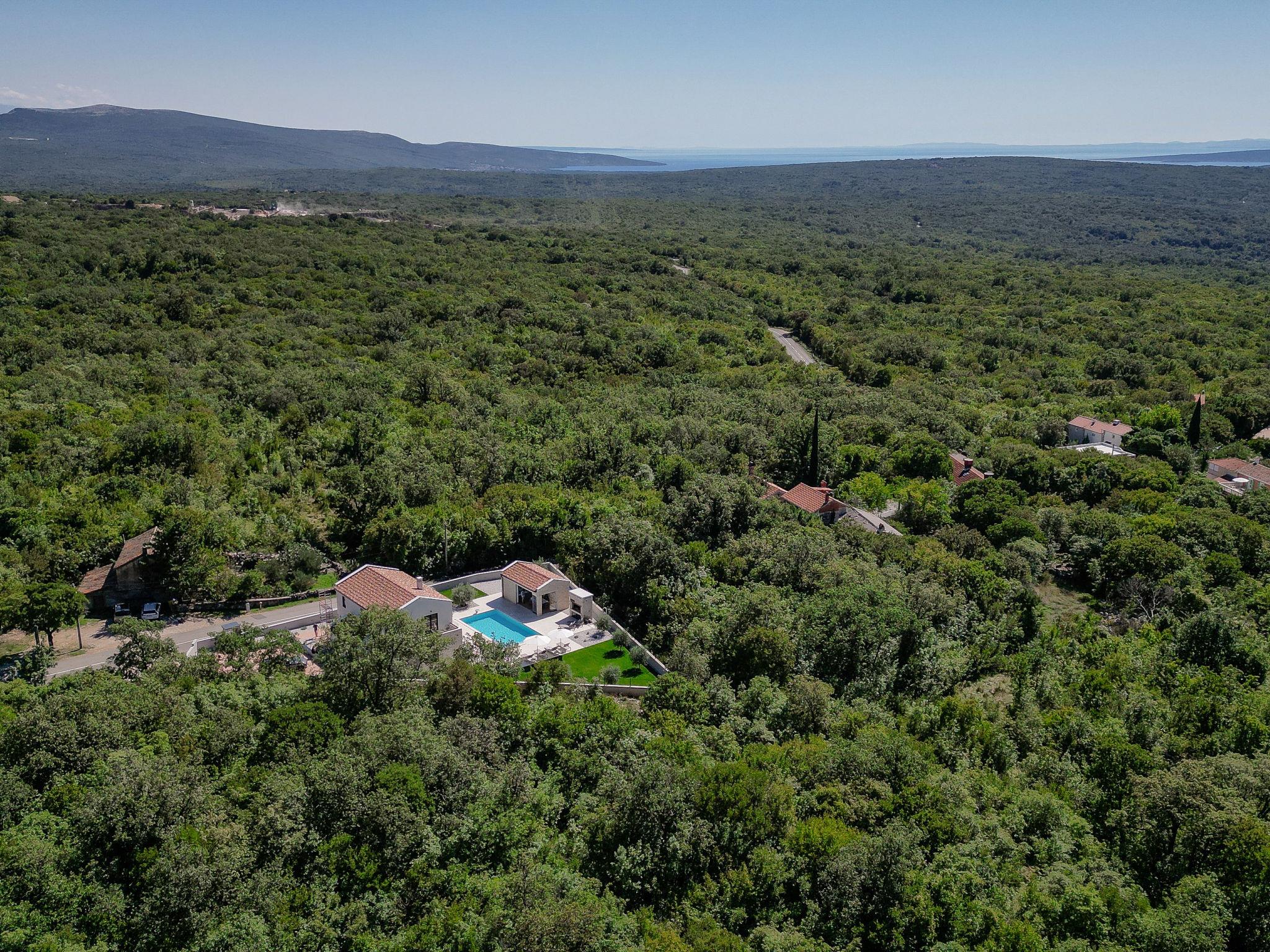 Kras: Modern, luxurious villa "Vonskari", 2 storeys, built in 2025. 3.5 km from the centre of Dobrinj, 7 km from the centre of Malinska, 8 km from the centre of Krk, 6 km from the sea, 6 km from the beach, in the countryside. Private: property 1'177 m2 (fenced), well-kept garden with lawn, swimming pool angular, heated (50 m2, depth 140 cm, seasonal availability: 25.Apr. - 01.Oct.) with internal staircase and salt-electrolysis pool-cleaning system. WC in the pool area, outdoor shower, pool house with fridge, WC and cooking stove, garden furniture, barbecue, pool maintenance by the owner/gardener. In the house: internet access, air conditioning, washing machine. Parking (for 3 cars) at the house on the premises. E-charging station. Shop 500 m, supermarket 5 km, bus stop 500 m, pebble beach 6 km. Please note: airfield 20 km from the property.
