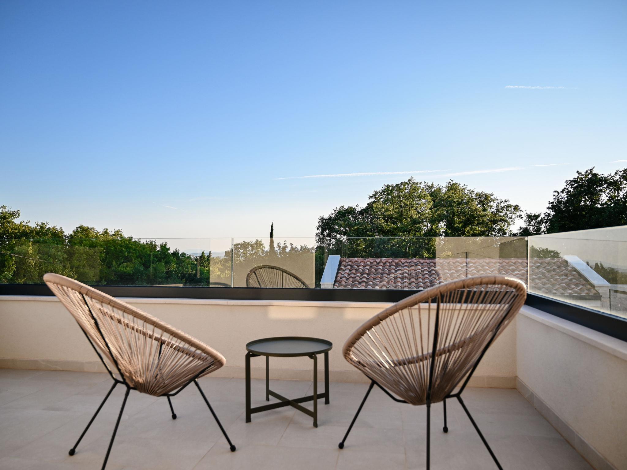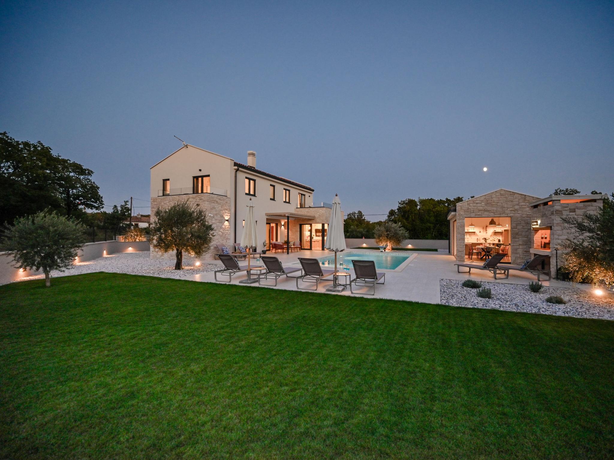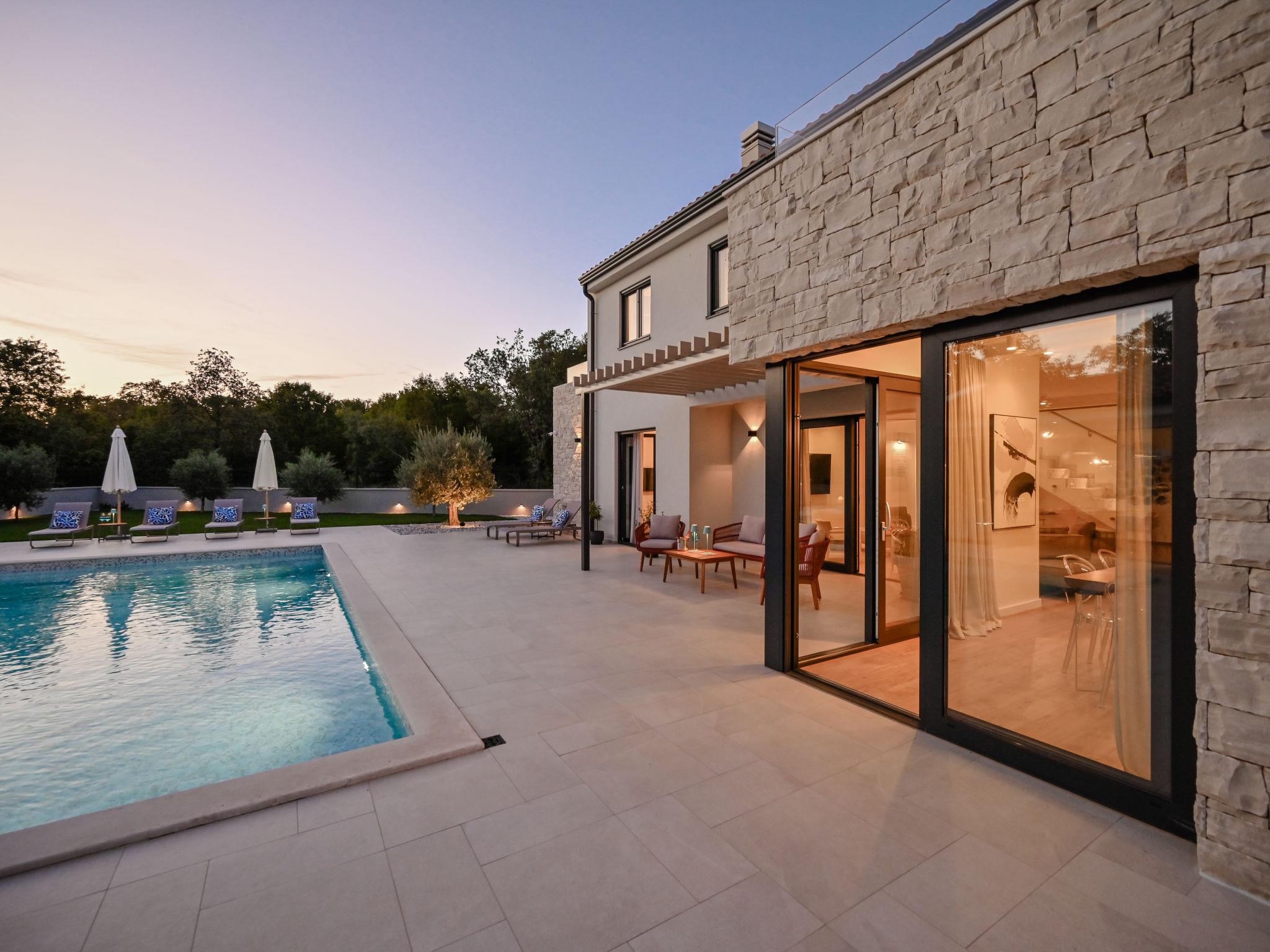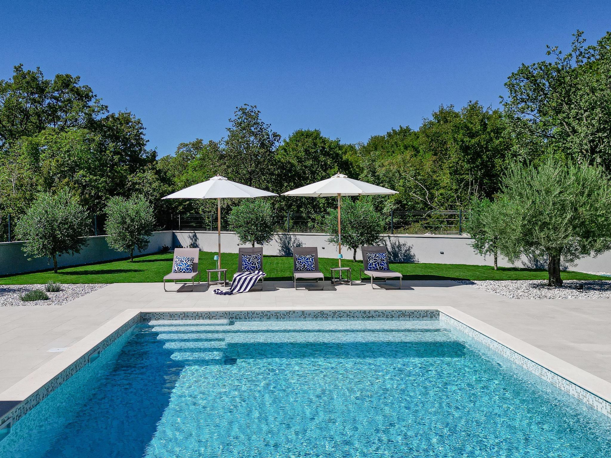 Kras: Modern, luxurious villa "Vonskari", 2 storeys, built in 2025. 3.5 km from the centre of Dobrinj, 7 km from the centre of Malinska, 8 km from the centre of Krk, 6 km from the sea, 6 km from the beach, in the countryside. Private: property 1'177 m2 (fenced), well-kept garden with lawn, swimming pool angular, heated (50 m2, depth 140 cm, seasonal availability: 25.Apr. - 01.Oct.) with internal staircase and salt-electrolysis pool-cleaning system. WC in the pool area, outdoor shower, pool house with fridge, WC and cooking stove, garden furniture, barbecue, pool maintenance by the owner/gardener. In the house: internet access, air conditioning, washing machine. Parking (for 3 cars) at the house on the premises. E-charging station. Shop 500 m, supermarket 5 km, bus stop 500 m, pebble beach 6 km. Please note: airfield 20 km from the property.