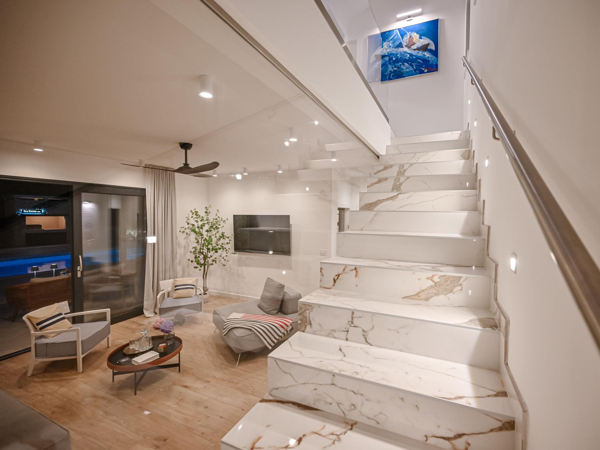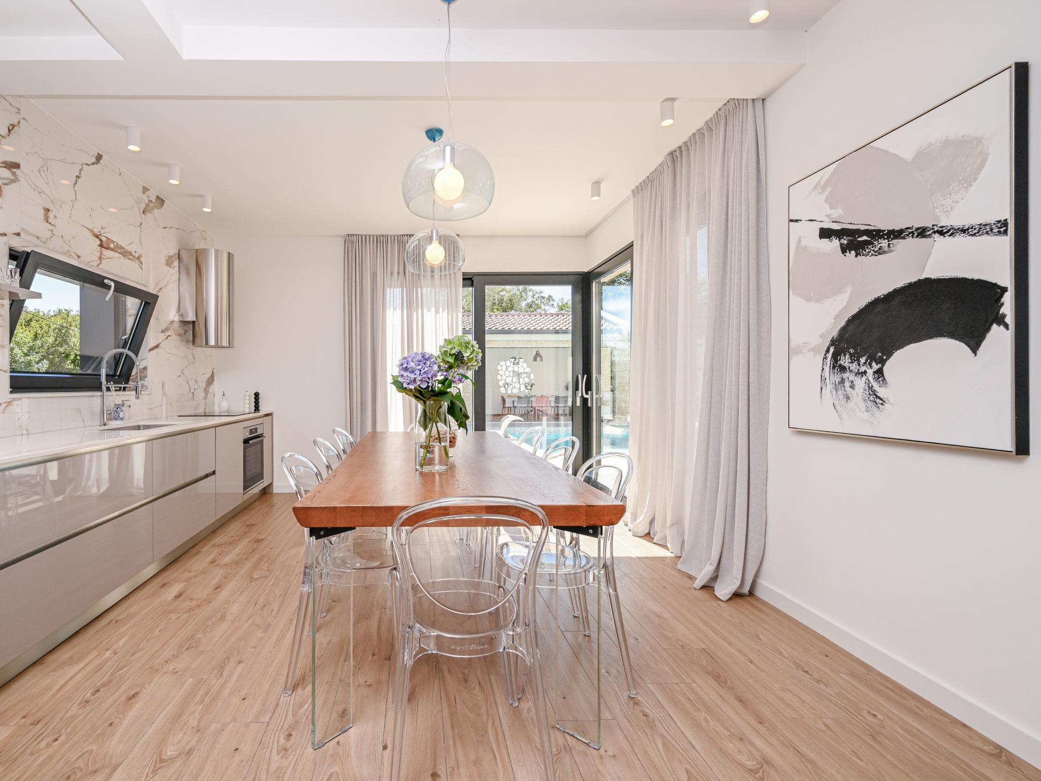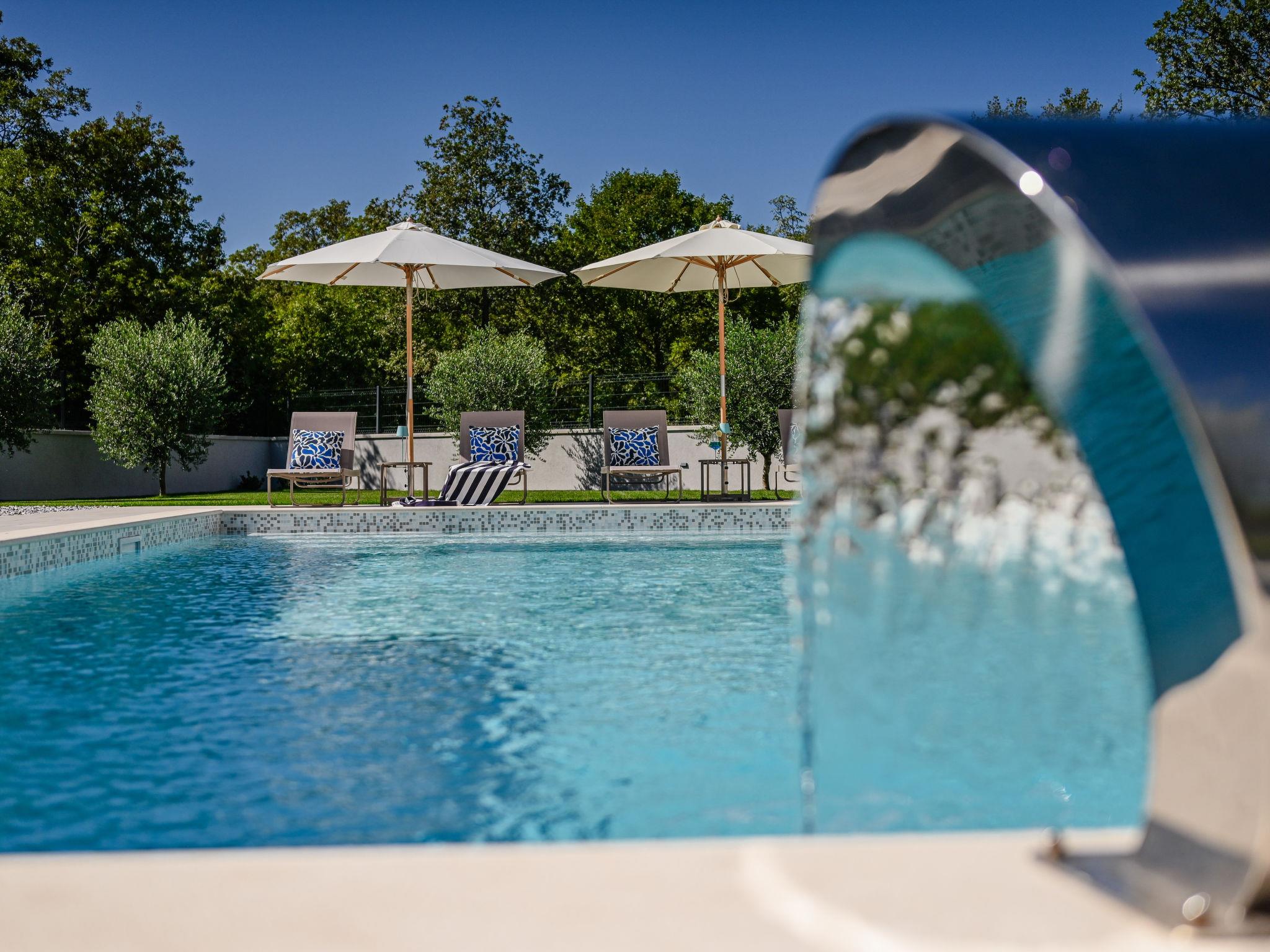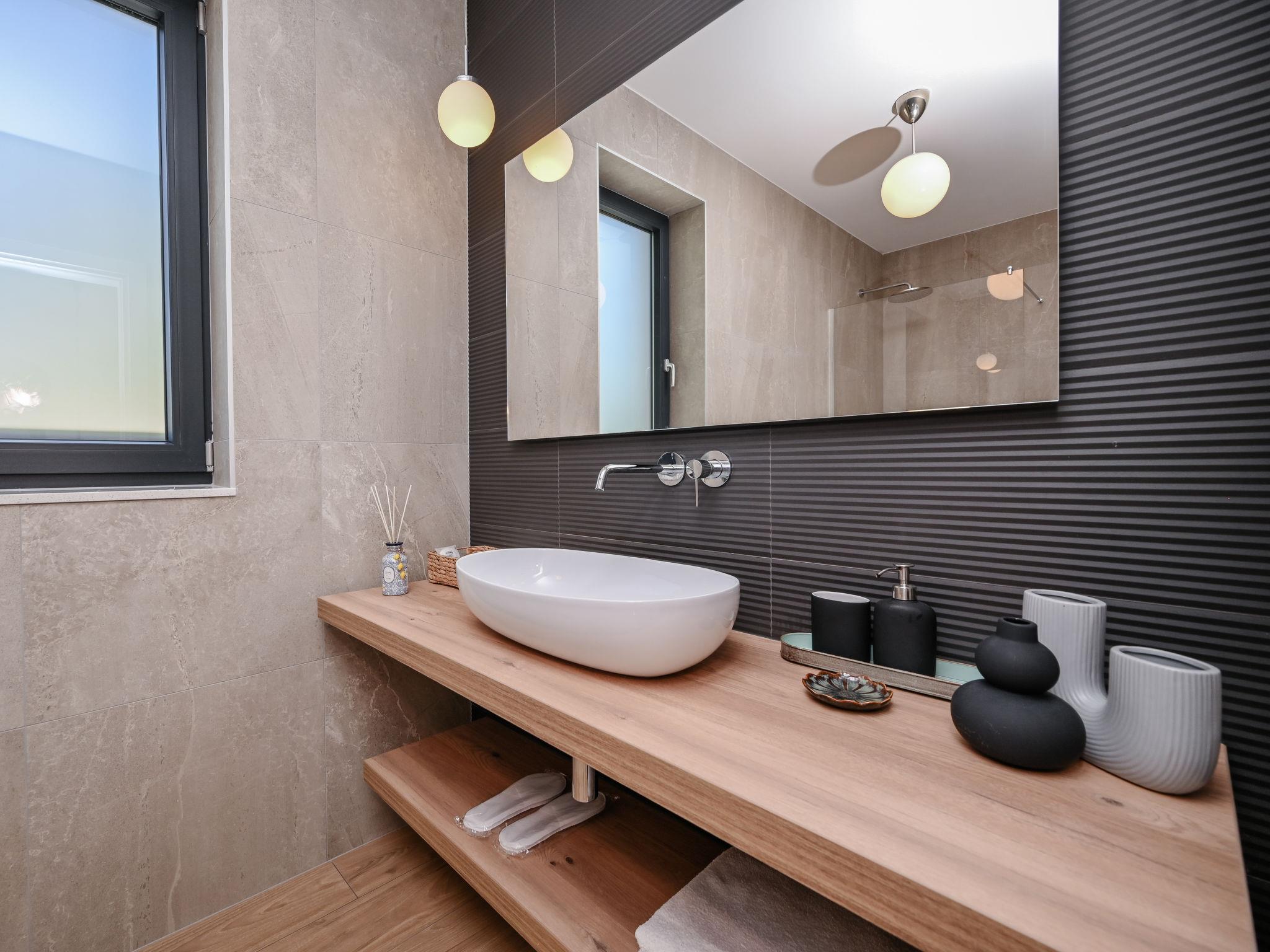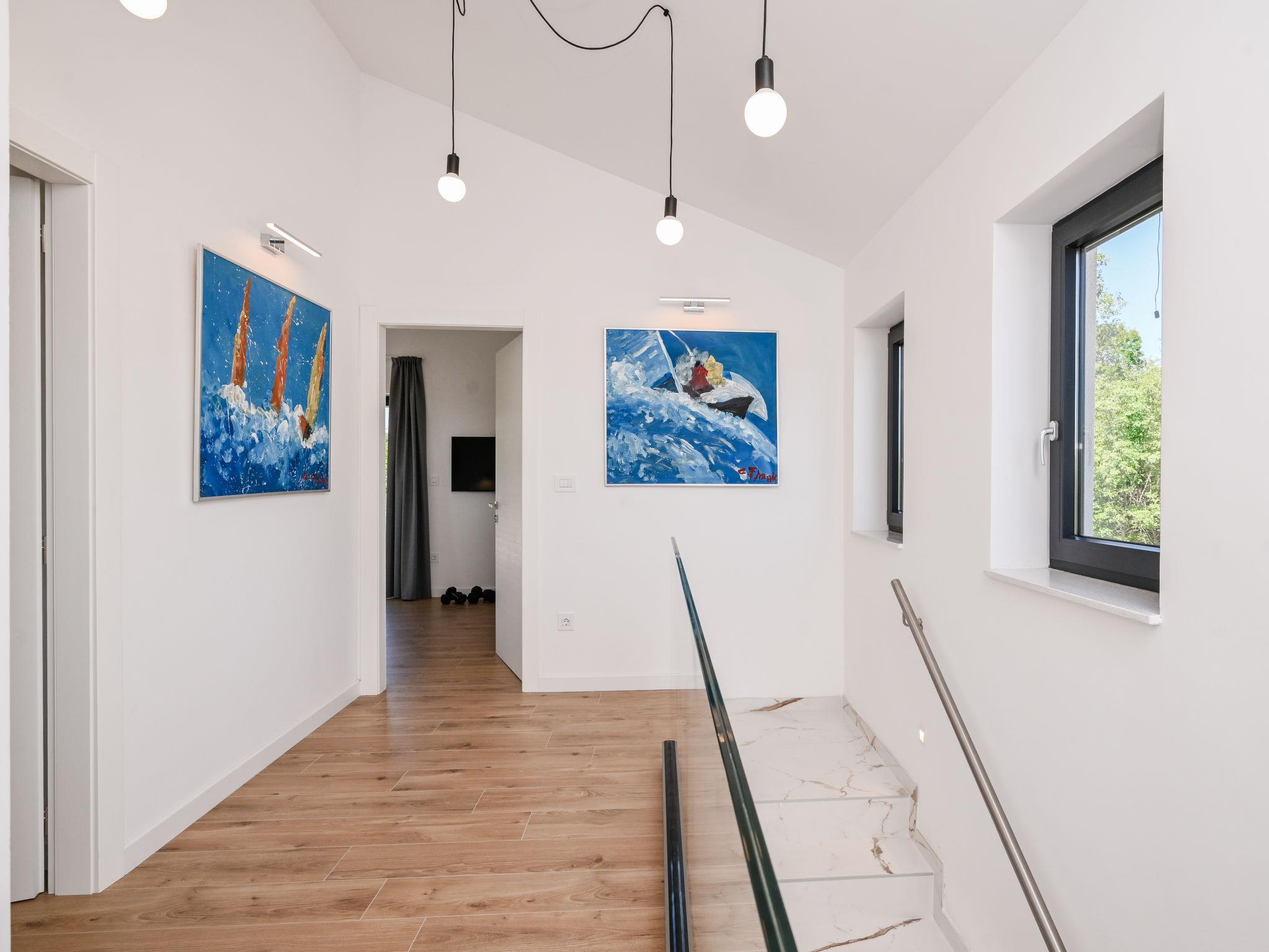 Kras: Modern, luxurious villa "Vonskari", 2 storeys, built in 2025. 3.5 km from the centre of Dobrinj, 7 km from the centre of Malinska, 8 km from the centre of Krk, 6 km from the sea, 6 km from the beach, in the countryside. Private: property 1'177 m2 (fenced), well-kept garden with lawn, swimming pool angular, heated (50 m2, depth 140 cm, seasonal availability: 25.Apr. - 01.Oct.) with internal staircase and salt-electrolysis pool-cleaning system. WC in the pool area, outdoor shower, pool house with fridge, WC and cooking stove, garden furniture, barbecue, pool maintenance by the owner/gardener. In the house: internet access, air conditioning, washing machine. Parking (for 3 cars) at the house on the premises. E-charging station. Shop 500 m, supermarket 5 km, bus stop 500 m, pebble beach 6 km. Please note: airfield 20 km from the property.