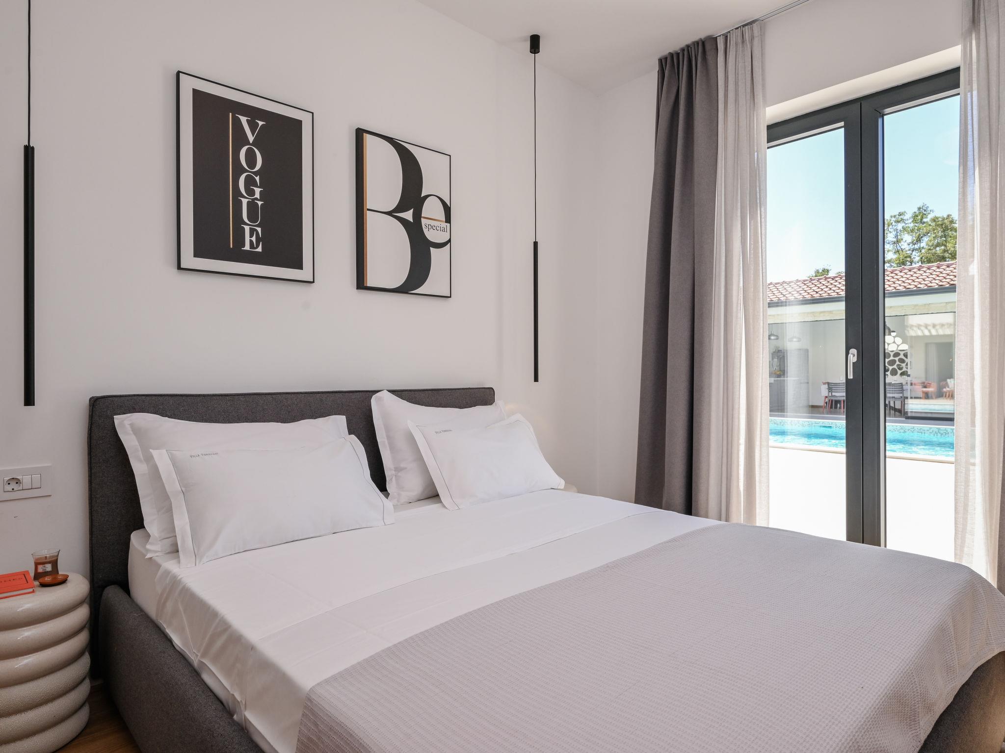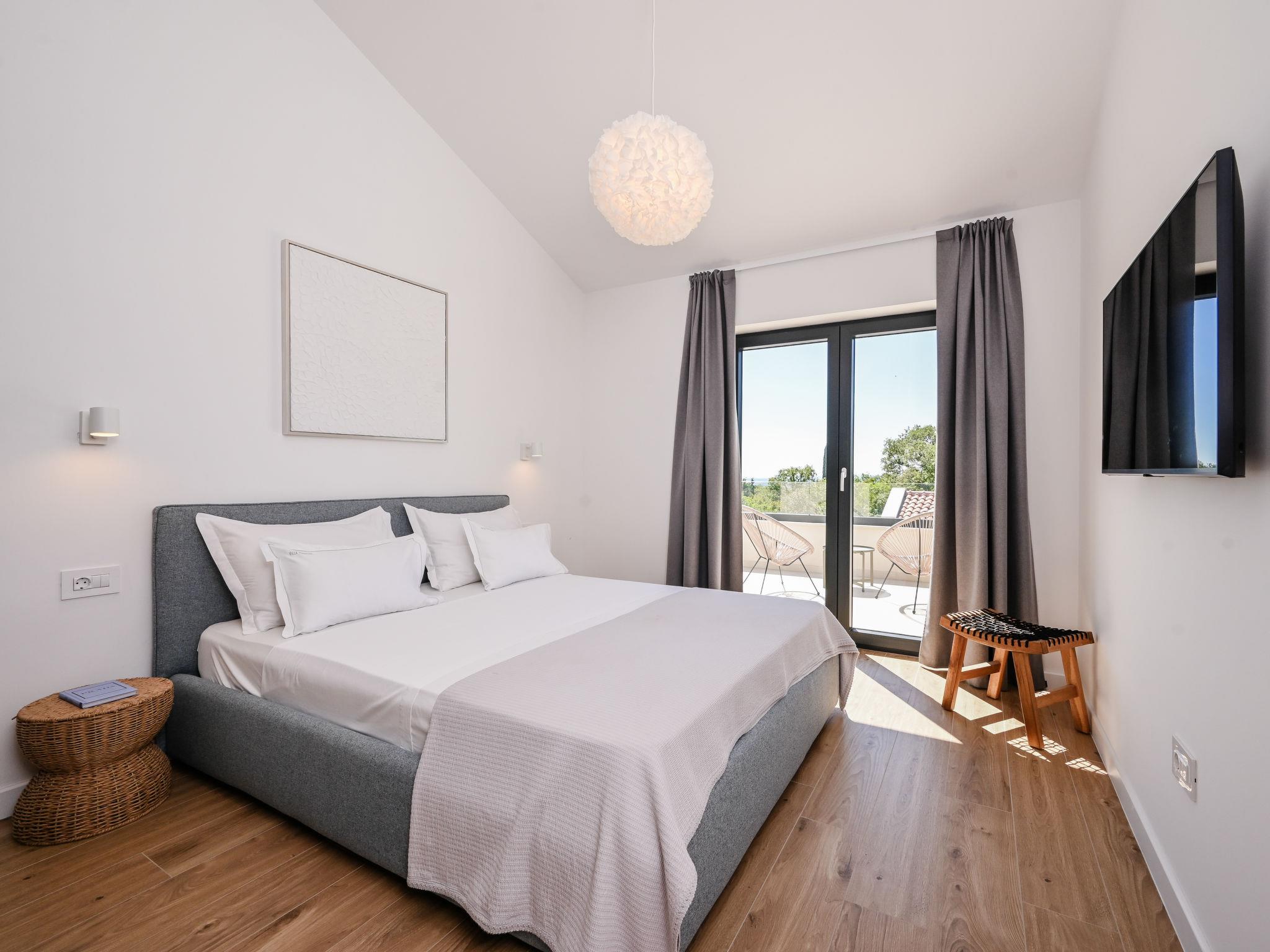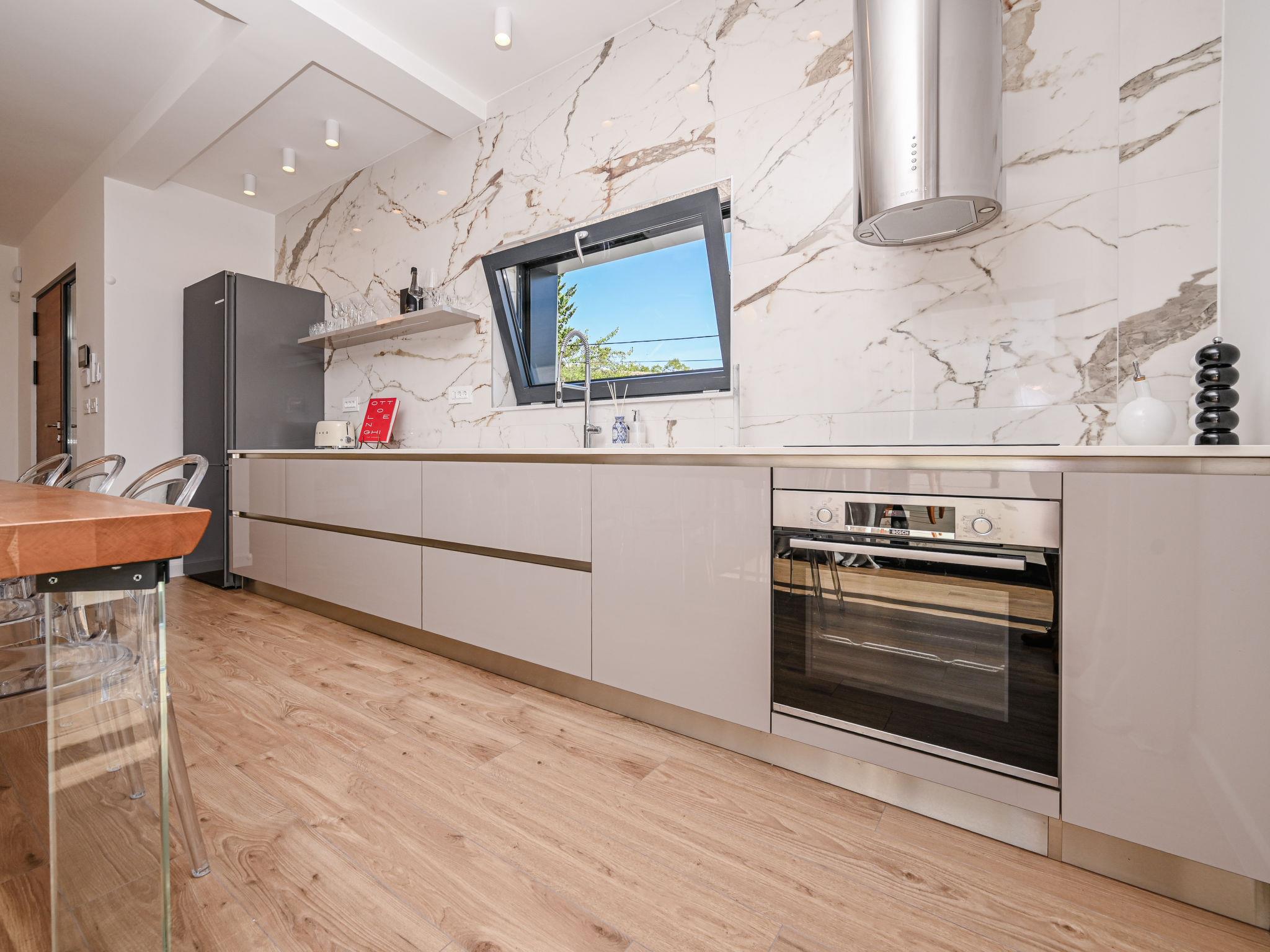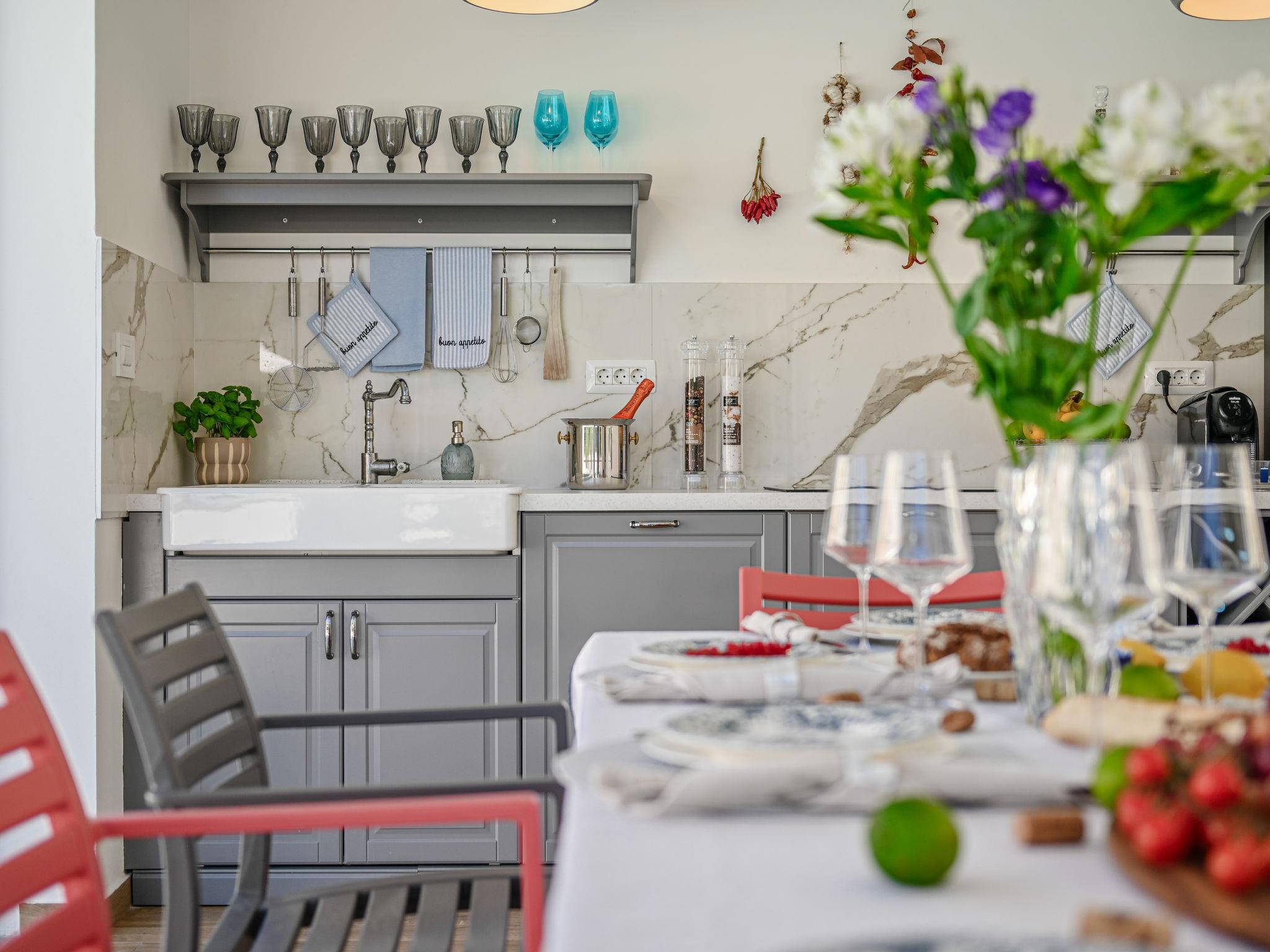 Kras: Modern, luxurious villa "Vonskari", 2 storeys, built in 2025. 3.5 km from the centre of Dobrinj, 7 km from the centre of Malinska, 8 km from the centre of Krk, 6 km from the sea, 6 km from the beach, in the countryside. Private: property 1'177 m2 (fenced), well-kept garden with lawn, swimming pool angular, heated (50 m2, depth 140 cm, seasonal availability: 25.Apr. - 01.Oct.) with internal staircase and salt-electrolysis pool-cleaning system. WC in the pool area, outdoor shower, pool house with fridge, WC and cooking stove, garden furniture, barbecue, pool maintenance by the owner/gardener. In the house: internet access, air conditioning, washing machine. Parking (for 3 cars) at the house on the premises. E-charging station. Shop 500 m, supermarket 5 km, bus stop 500 m, pebble beach 6 km. Please note: airfield 20 km from the property.