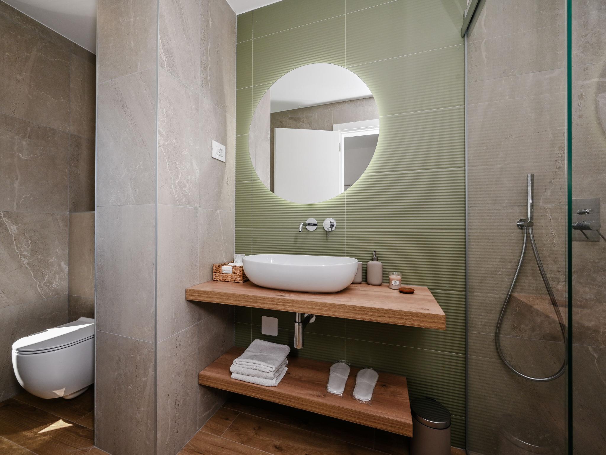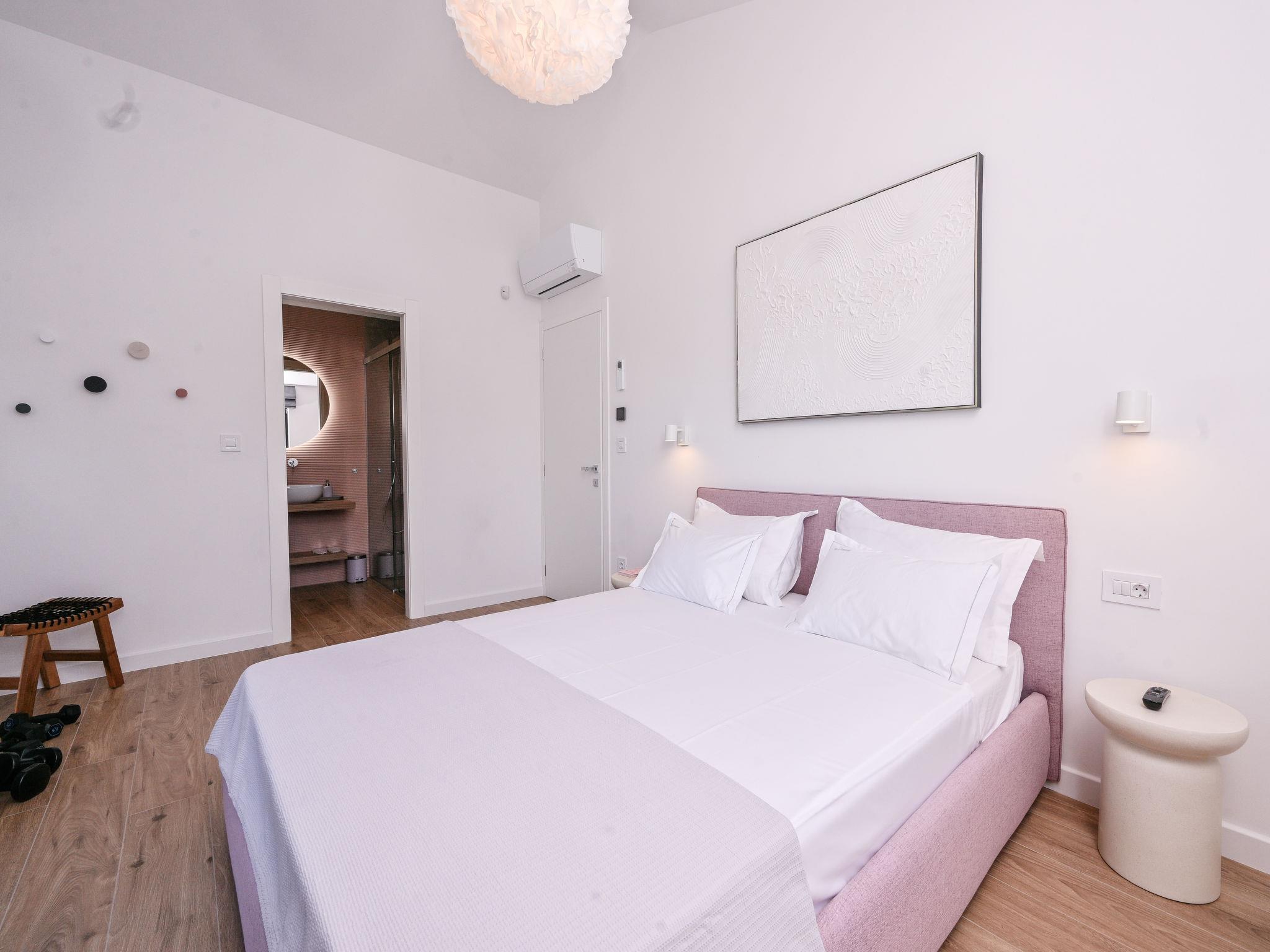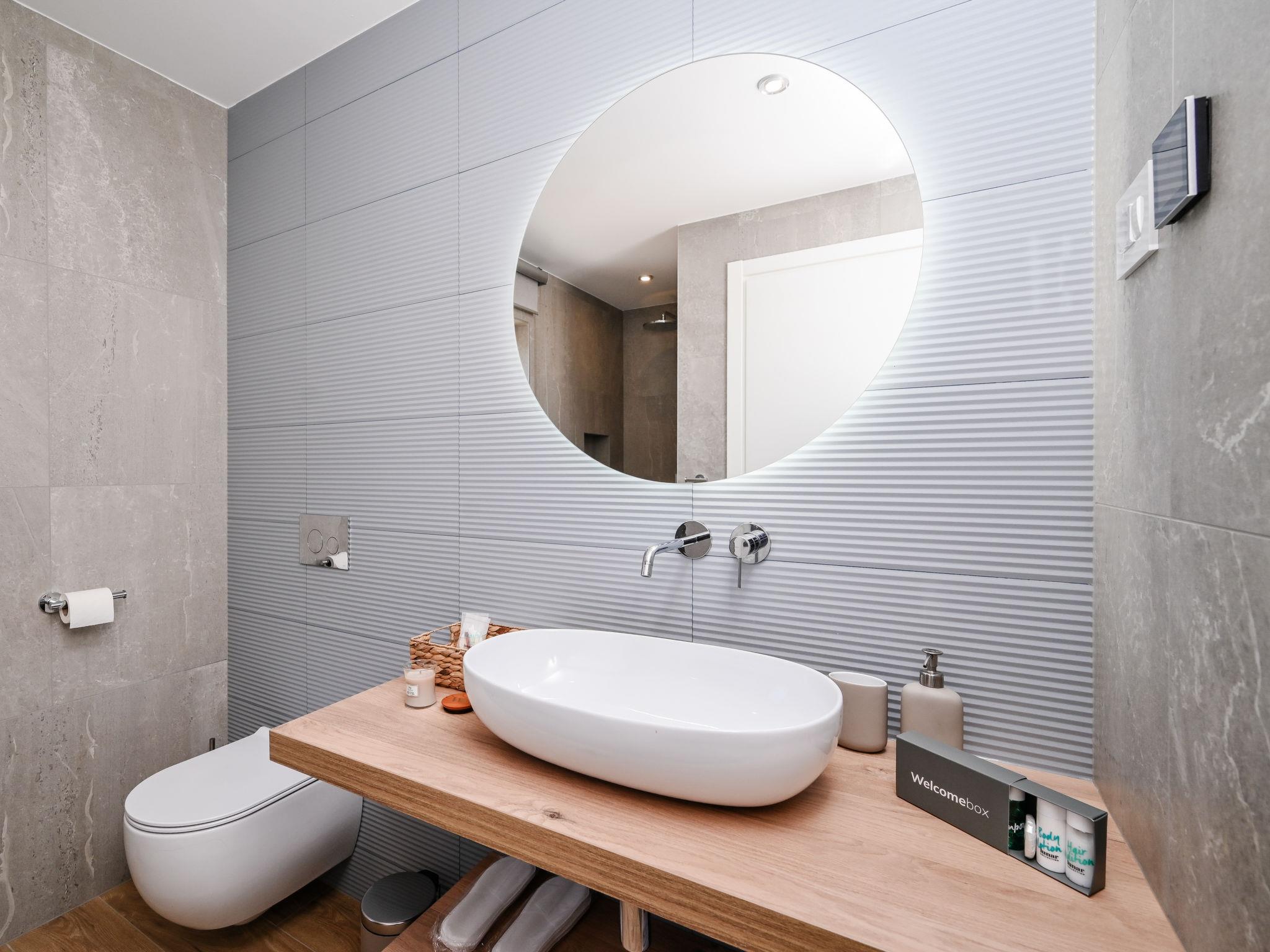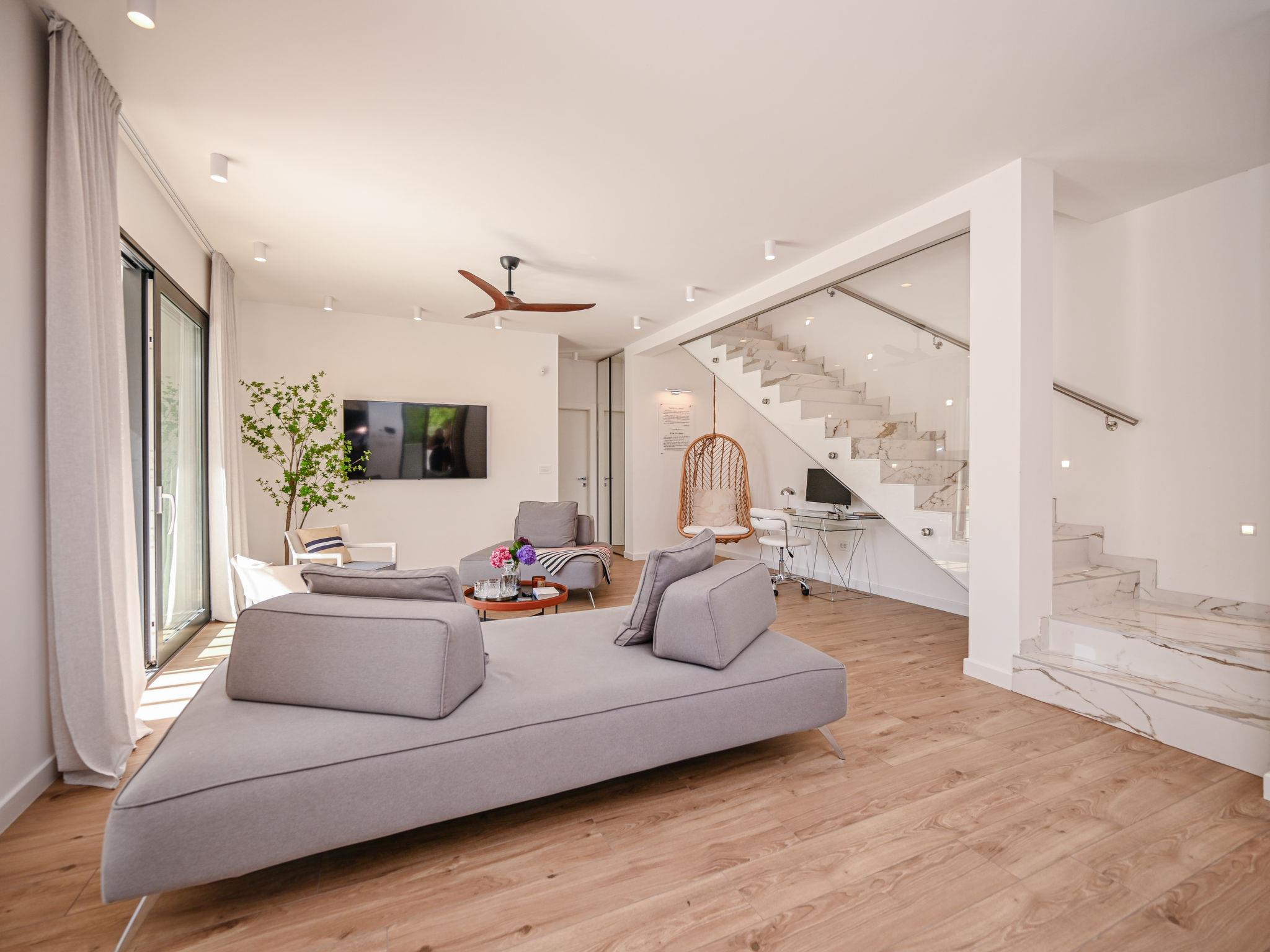 Kras: Modern, luxurious villa "Vonskari", 2 storeys, built in 2025. 3.5 km from the centre of Dobrinj, 7 km from the centre of Malinska, 8 km from the centre of Krk, 6 km from the sea, 6 km from the beach, in the countryside. Private: property 1'177 m2 (fenced), well-kept garden with lawn, swimming pool angular, heated (50 m2, depth 140 cm, seasonal availability: 25.Apr. - 01.Oct.) with internal staircase and salt-electrolysis pool-cleaning system. WC in the pool area, outdoor shower, pool house with fridge, WC and cooking stove, garden furniture, barbecue, pool maintenance by the owner/gardener. In the house: internet access, air conditioning, washing machine. Parking (for 3 cars) at the house on the premises. E-charging station. Shop 500 m, supermarket 5 km, bus stop 500 m, pebble beach 6 km. Please note: airfield 20 km from the property.