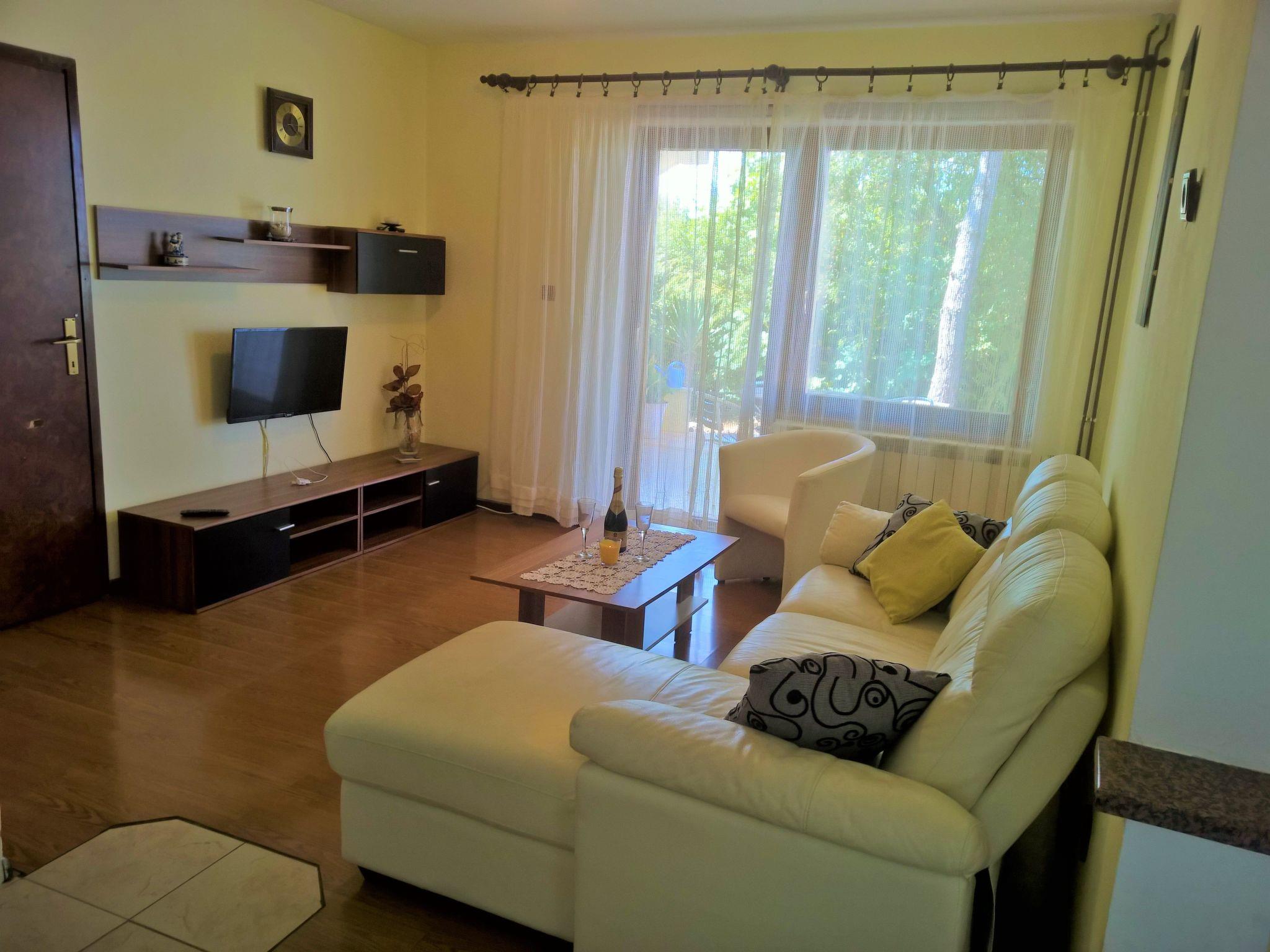 The apartment is about 60 m² in size and has a living room with a flat-screen smart TV, a sofa and a dining area, two bedrooms, a kitchen and a bathroom. One bedroom has a double bed (160 x 200 cm), and the other has two single beds (90 x 200 cm) that can be joined into a double bed. The kitchen is equipped with a stove, microwave, coffee maker, and the bathroom has a sink, bathtub, shower, and bidet.
