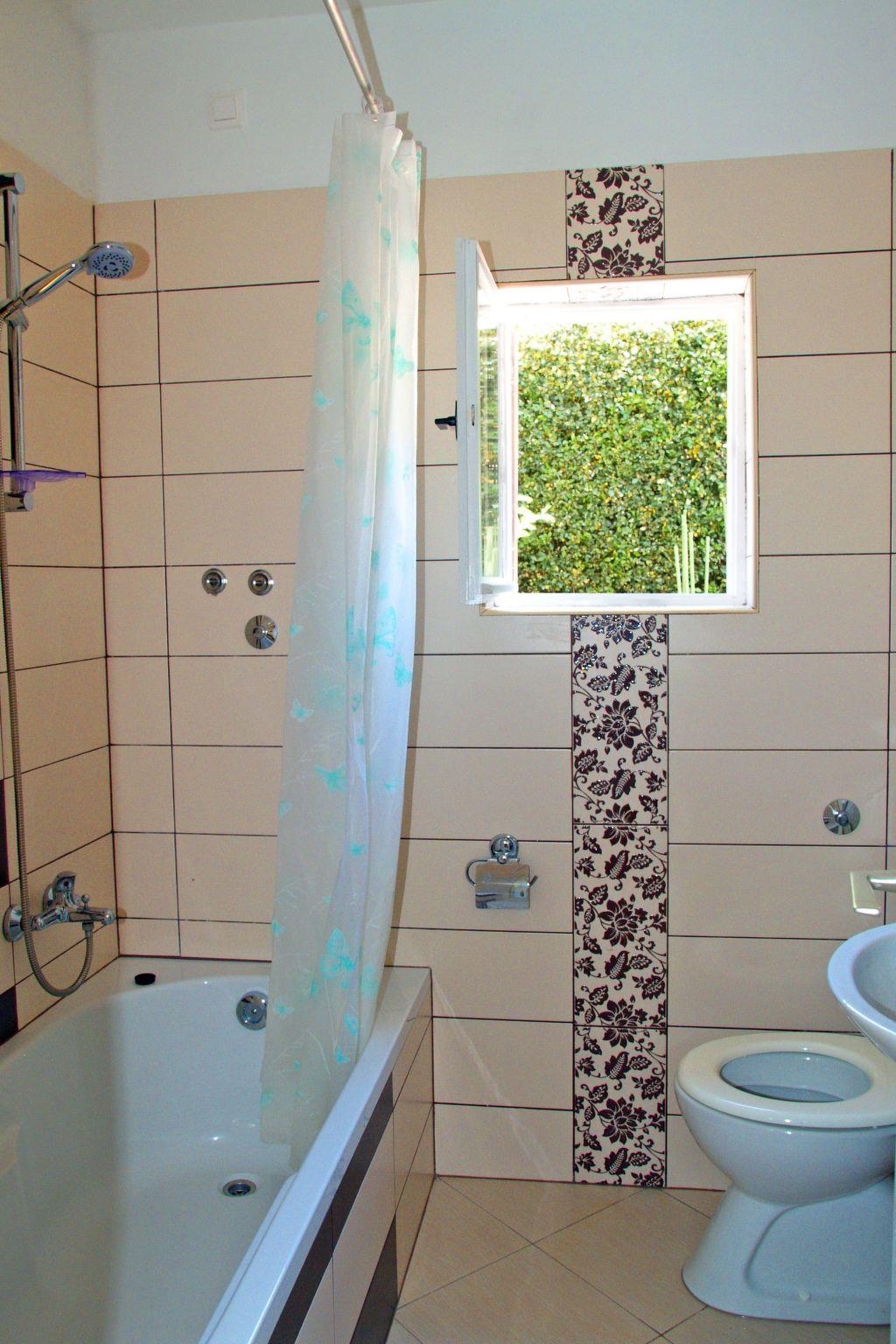 Step outside onto the spacious, roofed terrace and you’ll find yourself in a serene outdoor haven, perfect for dining al fresco or simply relaxing in the shade provided by the awning. The terrace is furnished with a dining table and six chairs, inviting guests to enjoy their meals amidst the gentle breezes and the soothing sounds of nature that define Njivice.