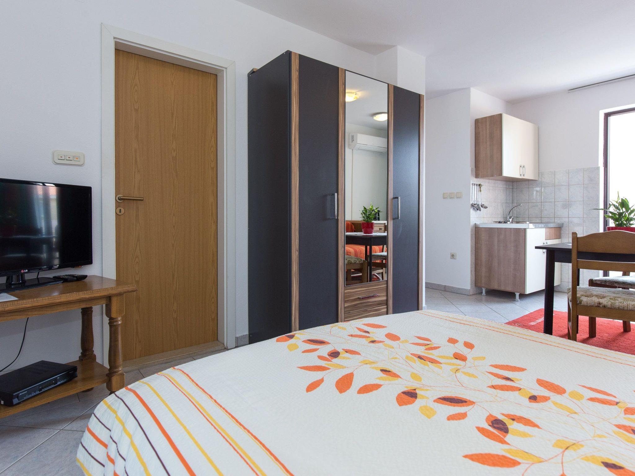 The interior of the studio apartment is characterized by a spacious room that offers everything you need for your stay. Air conditioning is included for your maximum comfort throughout the day, guaranteeing a wonderful night's sleep regardless of the outside temperature. For your personal needs, the apartment is equipped with a coffee machine and a kettle, allowing you to start each morning with an aromatic cup of coffee or tea.