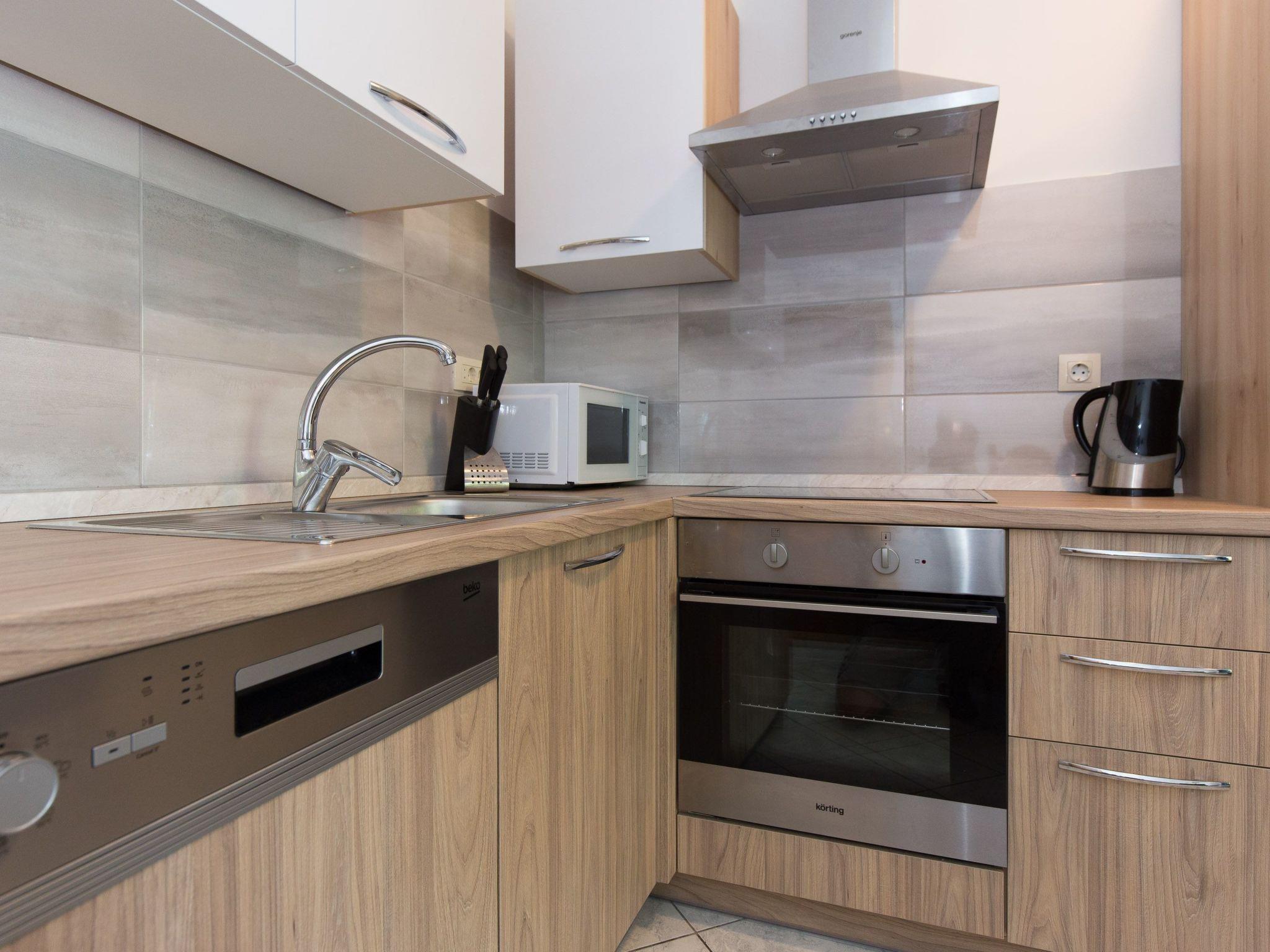 A kitchen with a dishwasher with a dining area and a living room with access to the terrace! The living room has air conditioning, satellite TV and Wi-Fi. The maximum capacity is 5 people.