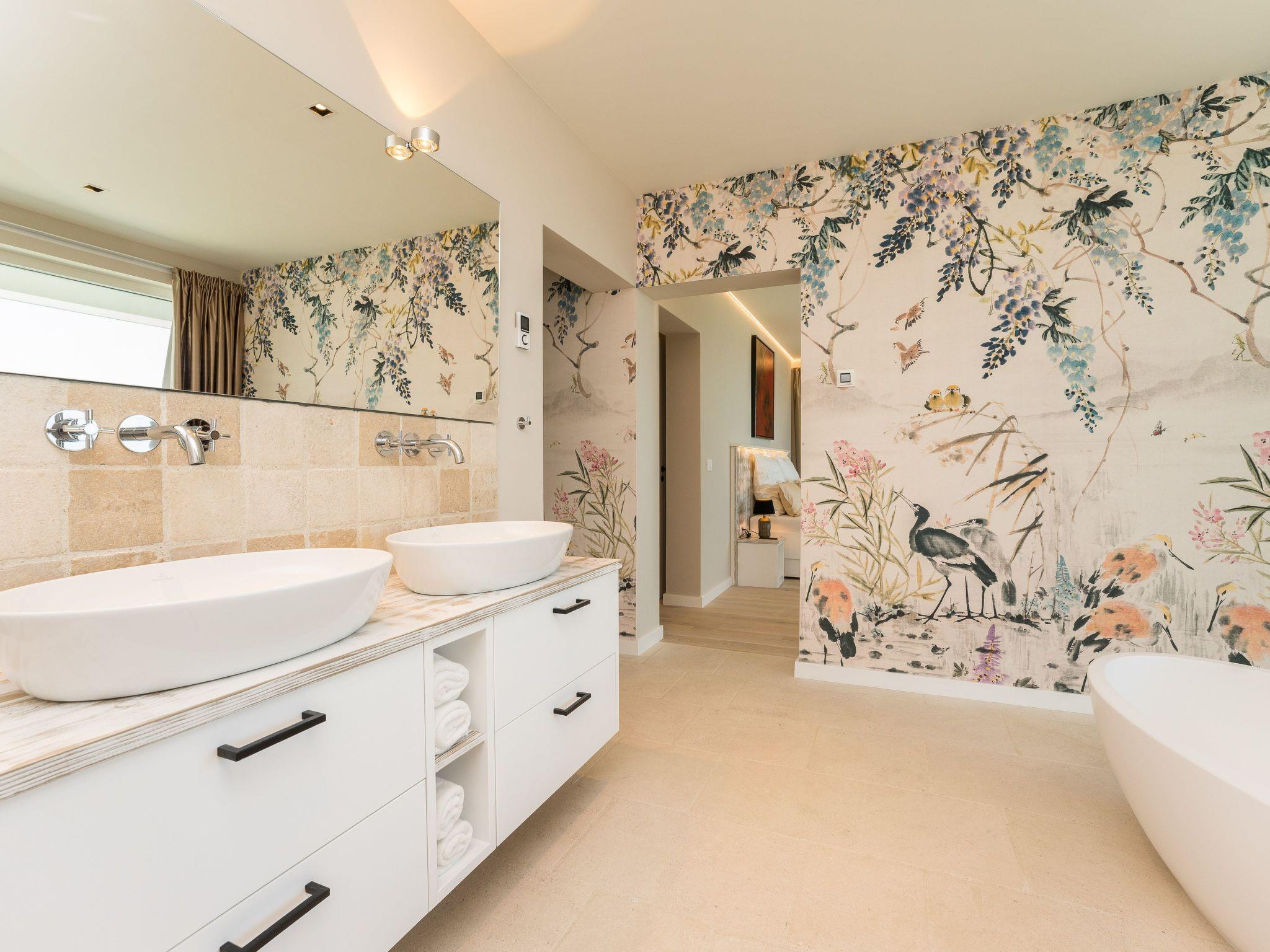 High-quality "Antique Burgundy Pavers" natural stone flooring from France was laid in all the bathrooms. The showers are made of "Antique Grimaud Limestone" natural stone, also from France.