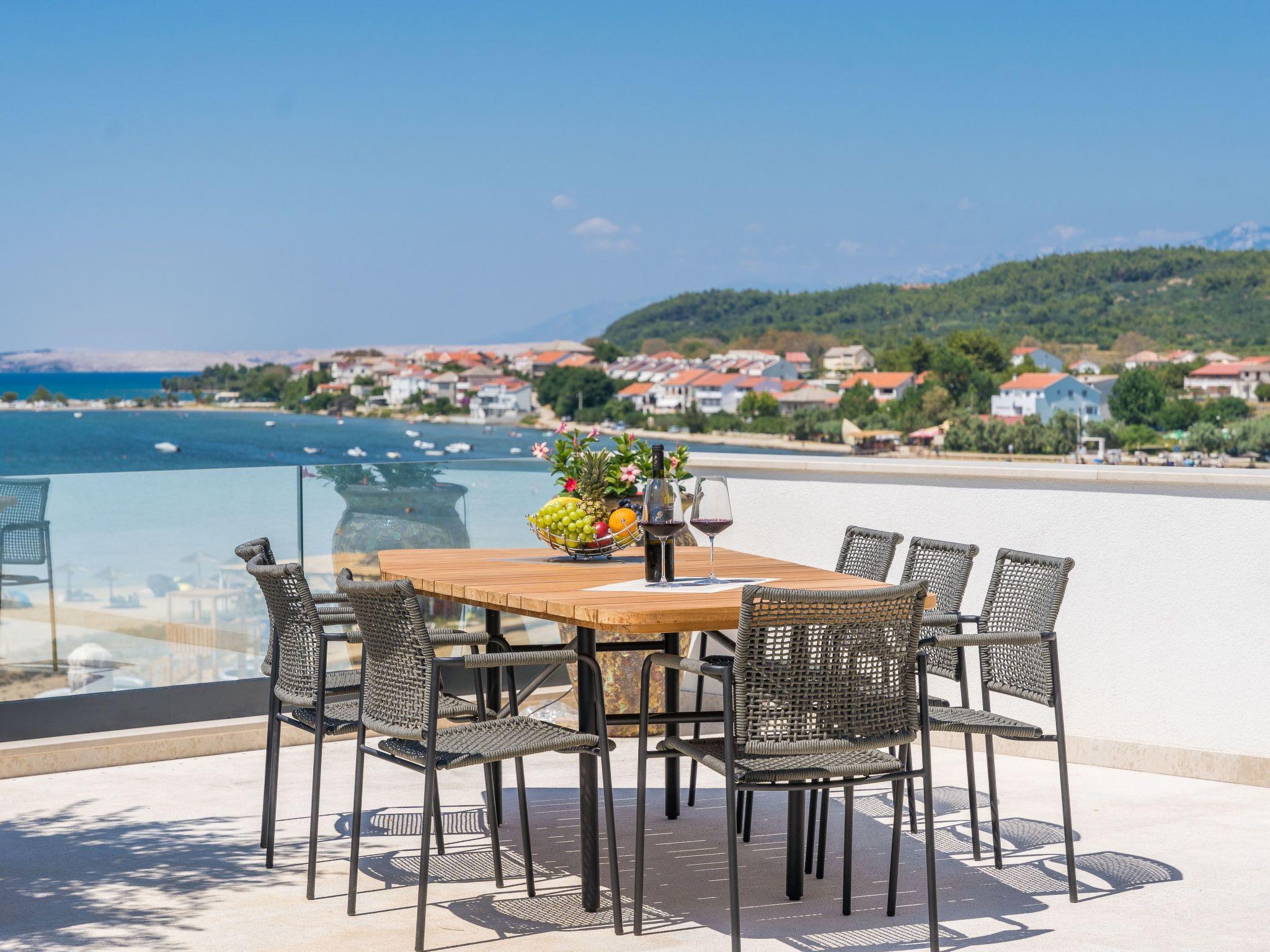 On the first floor, on a 110 square metre roof terrace, there is a wellness area with a bath, sauna, whirlpool, outdoor shower and luxurious lounge furniture as well as an outdoor kitchen with a dining area for 10 people; from there (9 metres above the ground) you can enjoy a unique view of the Velebit Mountains and the sea. A Bluetooth sound system adds to the holiday atmosphere.