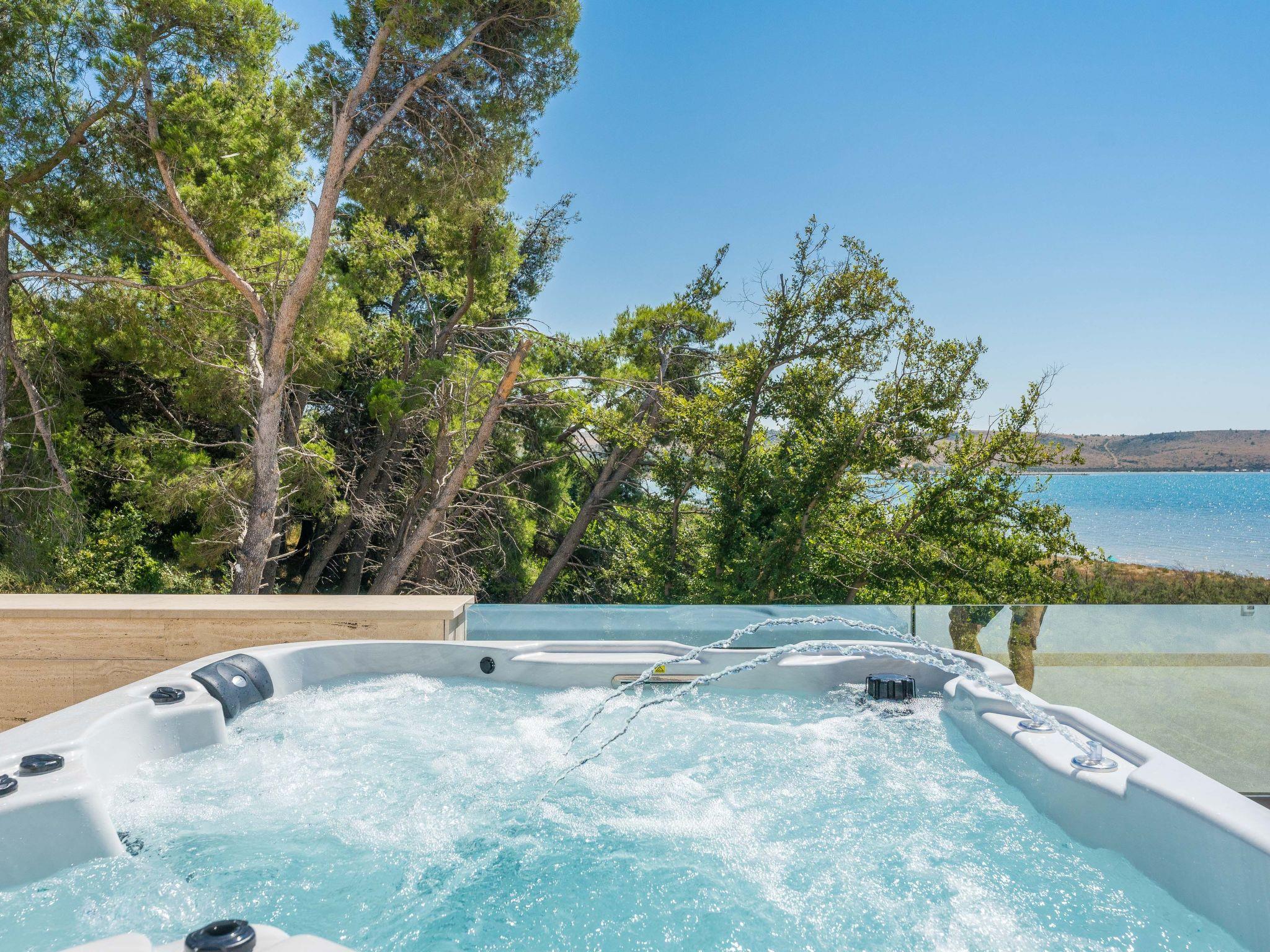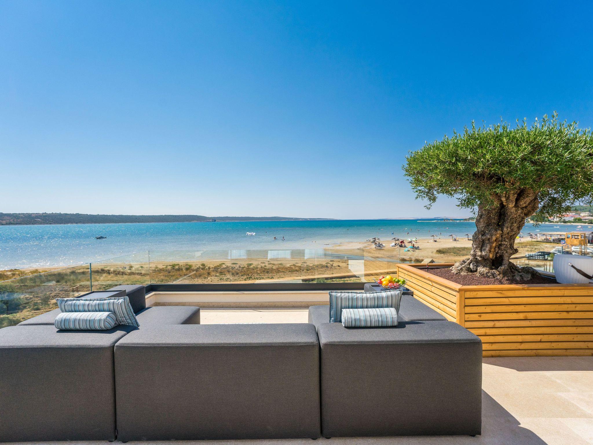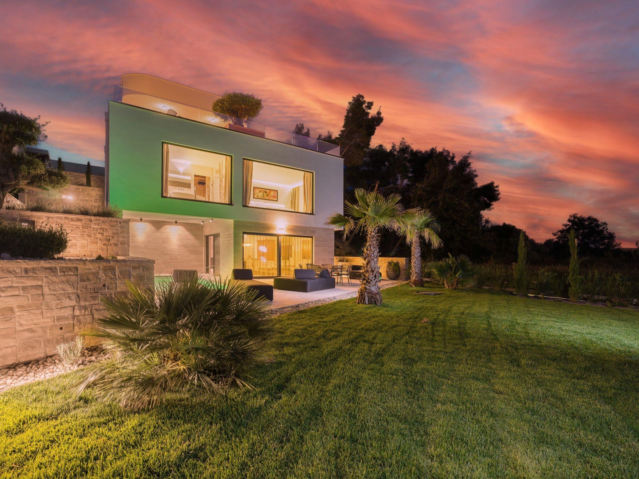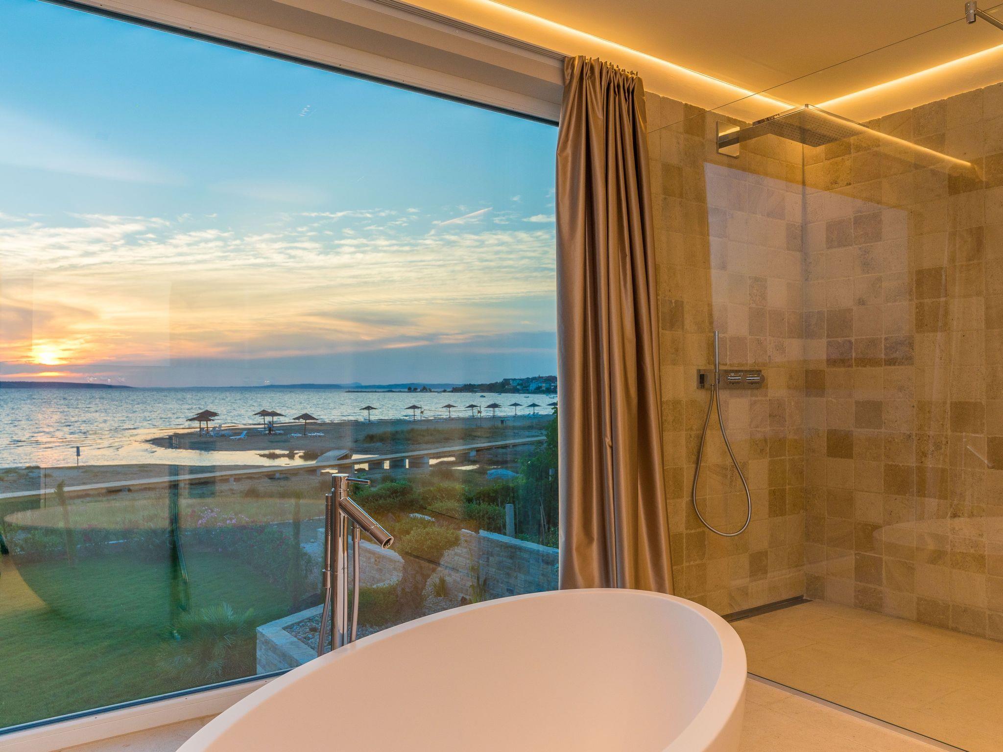 On the first floor, in addition to a wellness area with sauna, whirlpool, outdoor shower and luxurious lounge furniture, there is also an outdoor kitchen with a dining area for 10 people; from there (9 metres high) you have a unique view of the Velebit Mountains and the sea. A Bluetooth sound system adds to the holiday atmosphere.