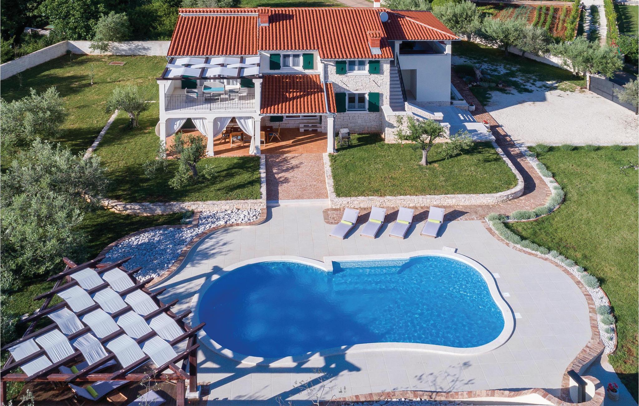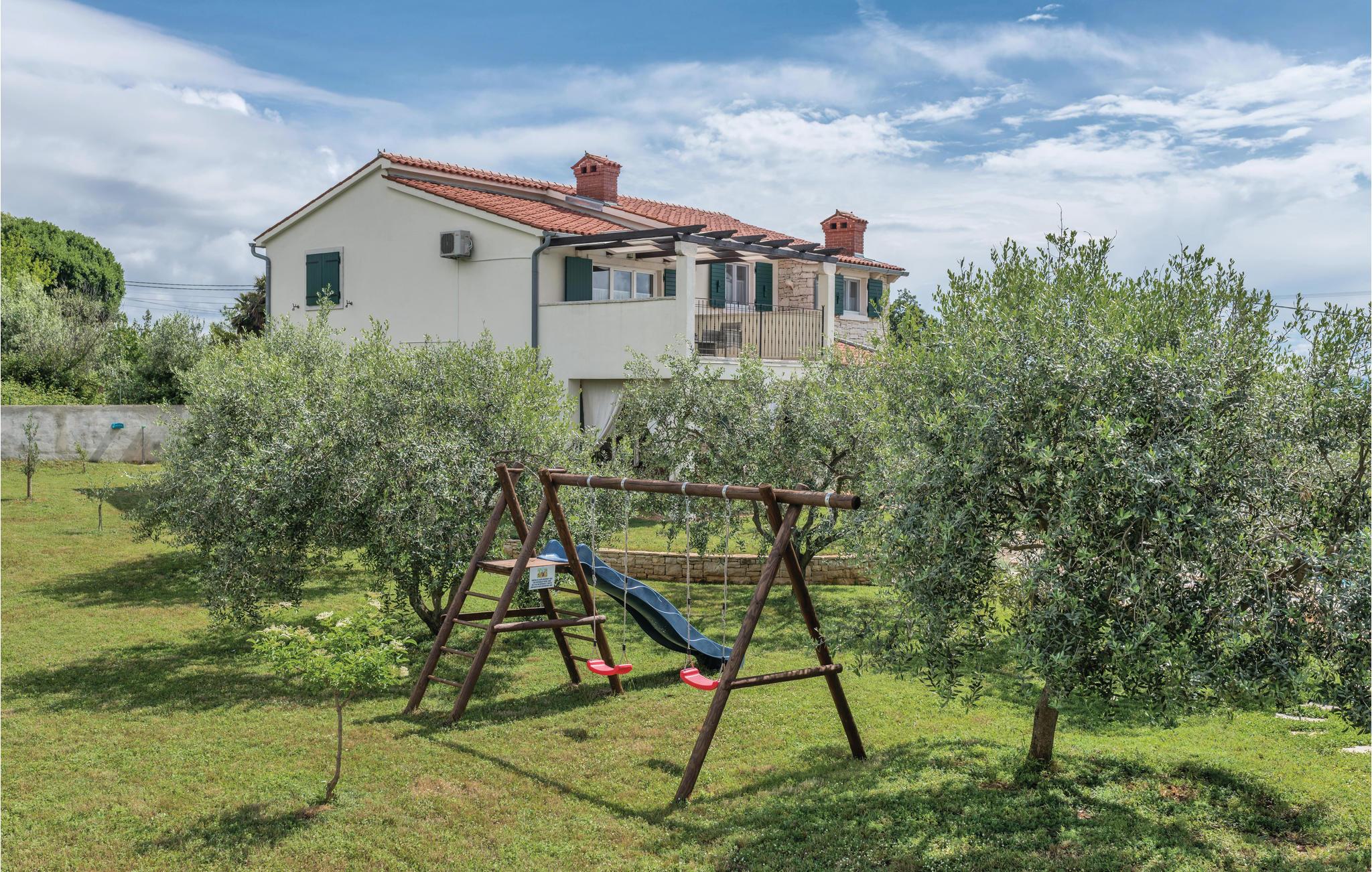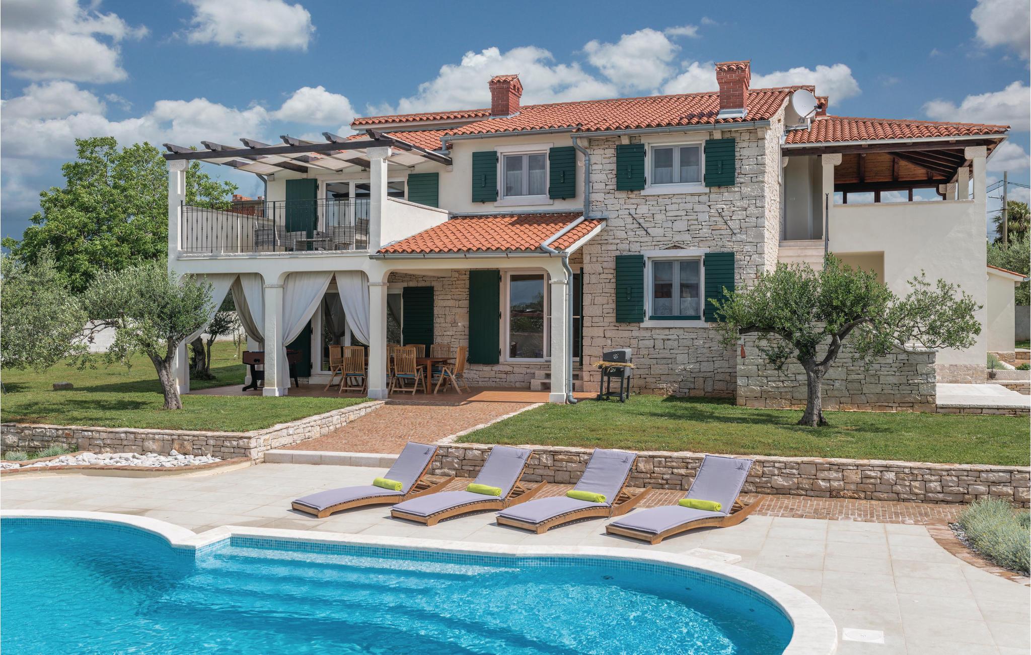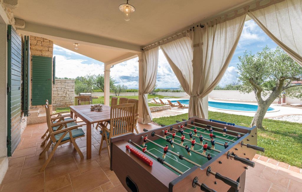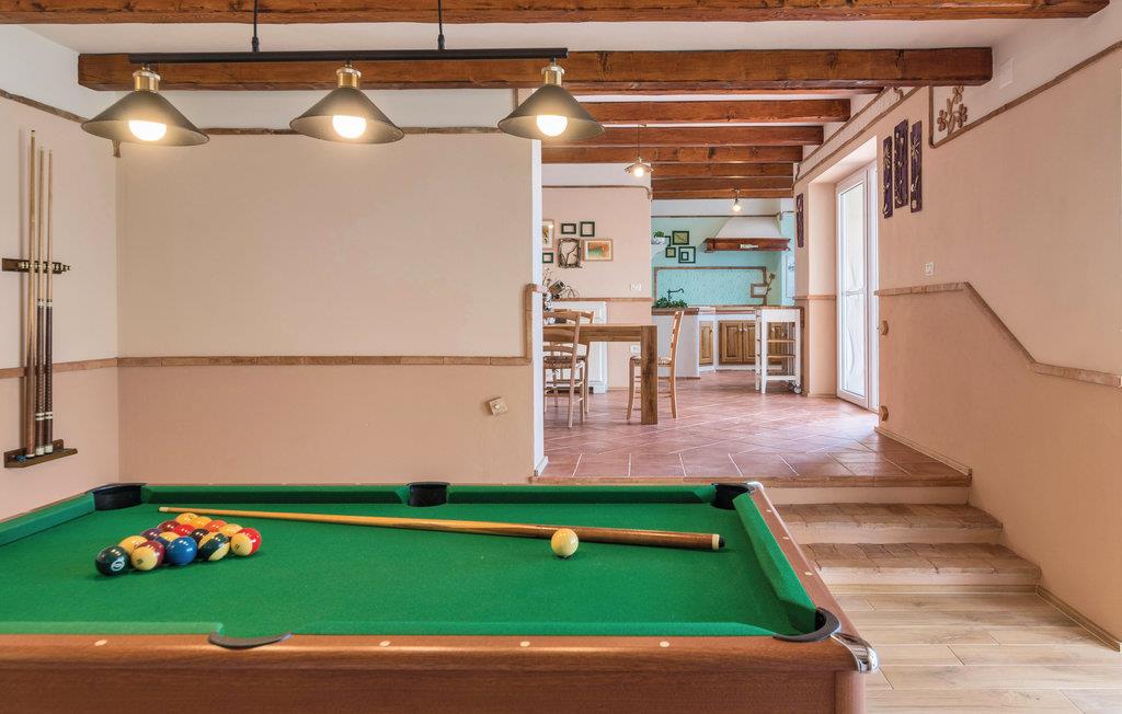 Dette vakre steinhuset ligger i den lille landsbyen Iii, hvor det bare er noen få hus, og hvor du kan nyte privatlivet i de fredelige omgivelsene. Den store og inngjerdede hagen med oliventrær domineres av et svømmebasseng som gir forfriskninger om sommeren. Nyt utsikten over øyene i Kvarnerbukta fra den overbygde terrassen, eller slapp av med et slag biljard. Interiøret er fordelt over to etasjer med utvendige trapper. I andre etasje finner du en stue med kjøkken og spiseplass samt tre soverom, mens det i første etasje er enda et soverom og et ekstra kjøkken samt et lekerom. Herfra har du også tilgang til den overbygde terrassen, hvor det er en grill.