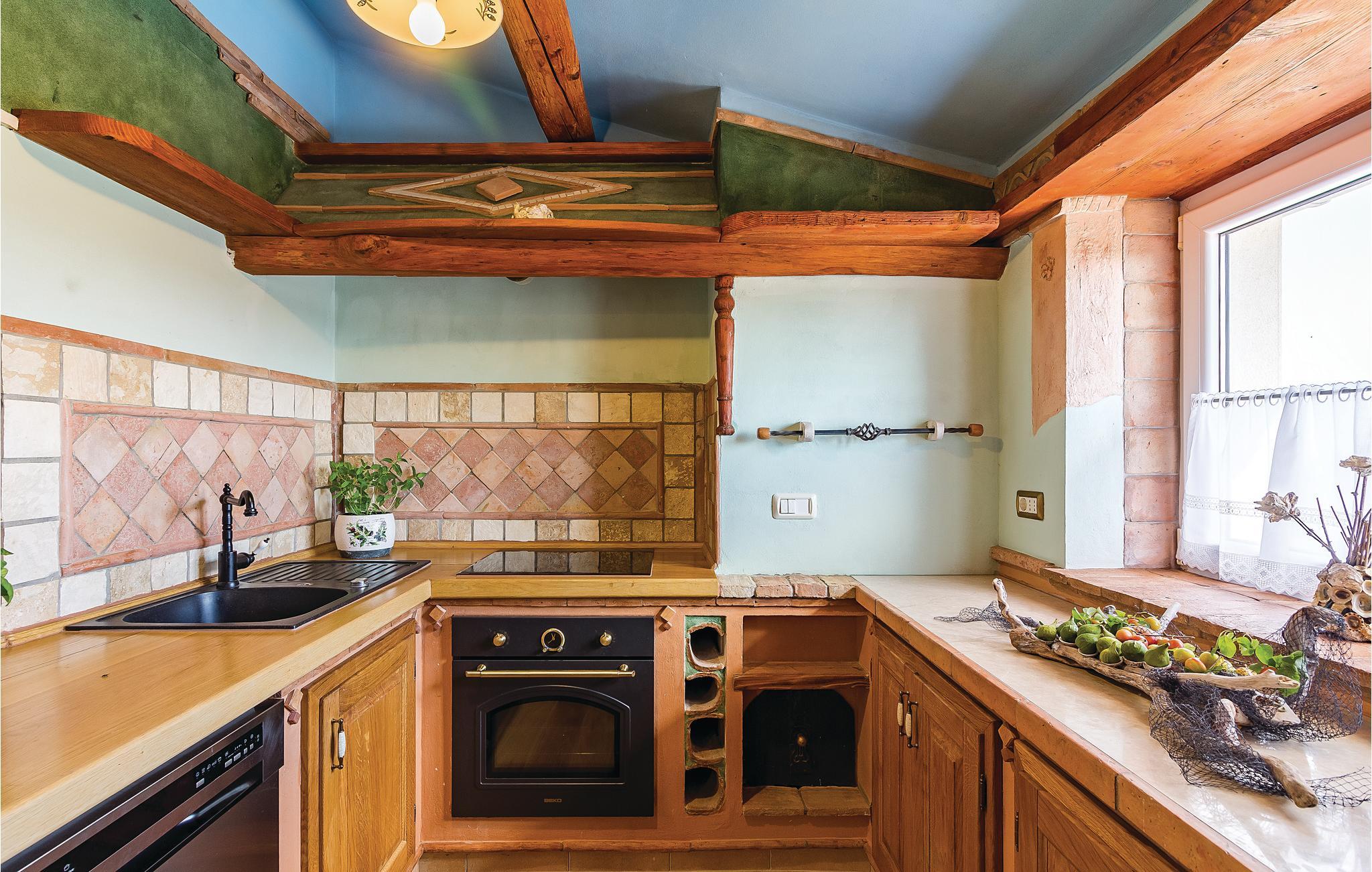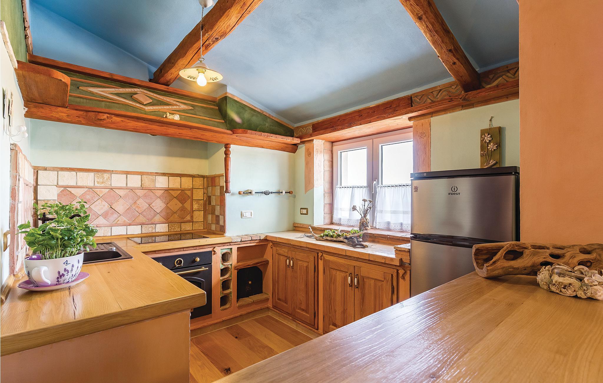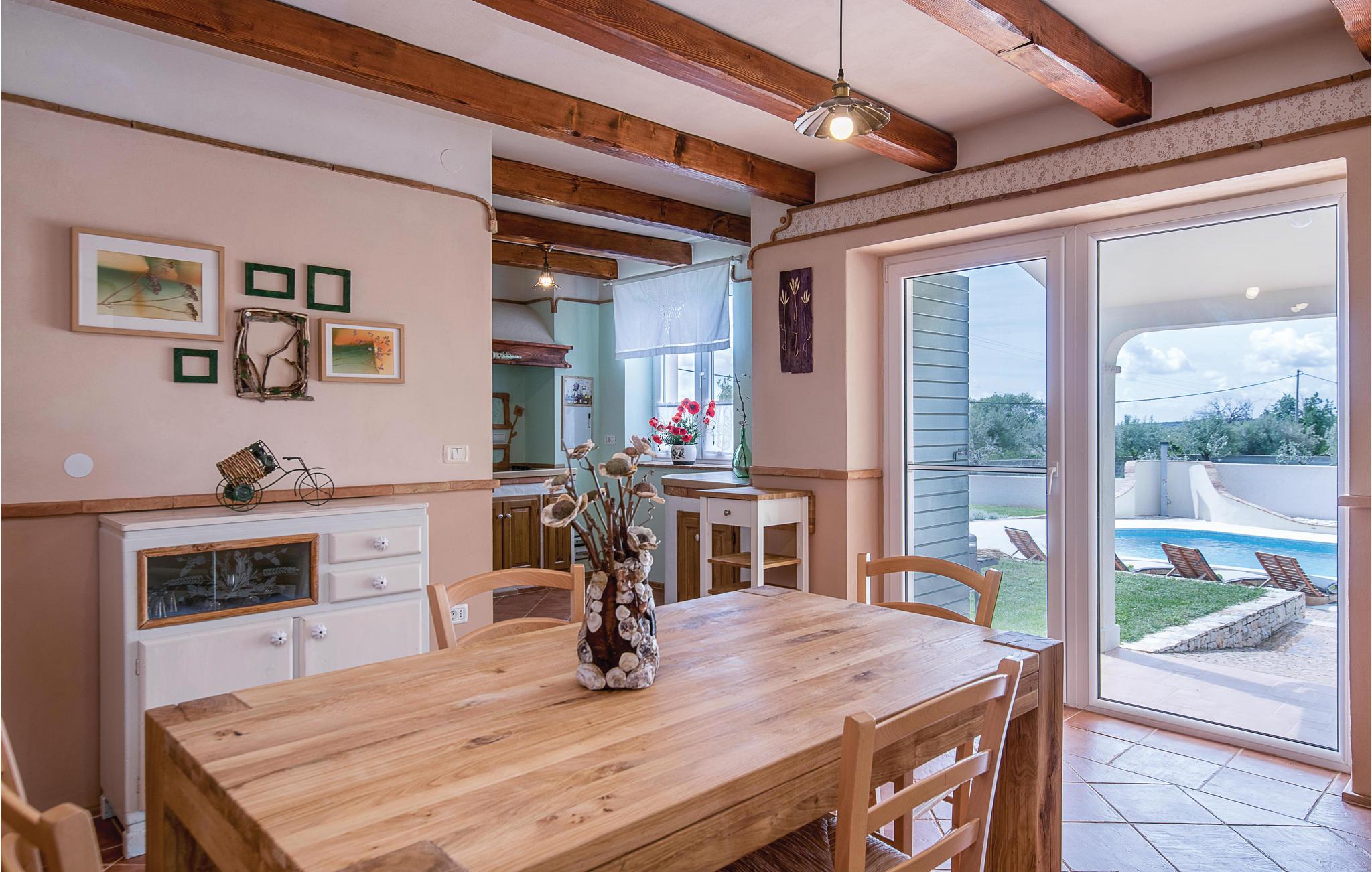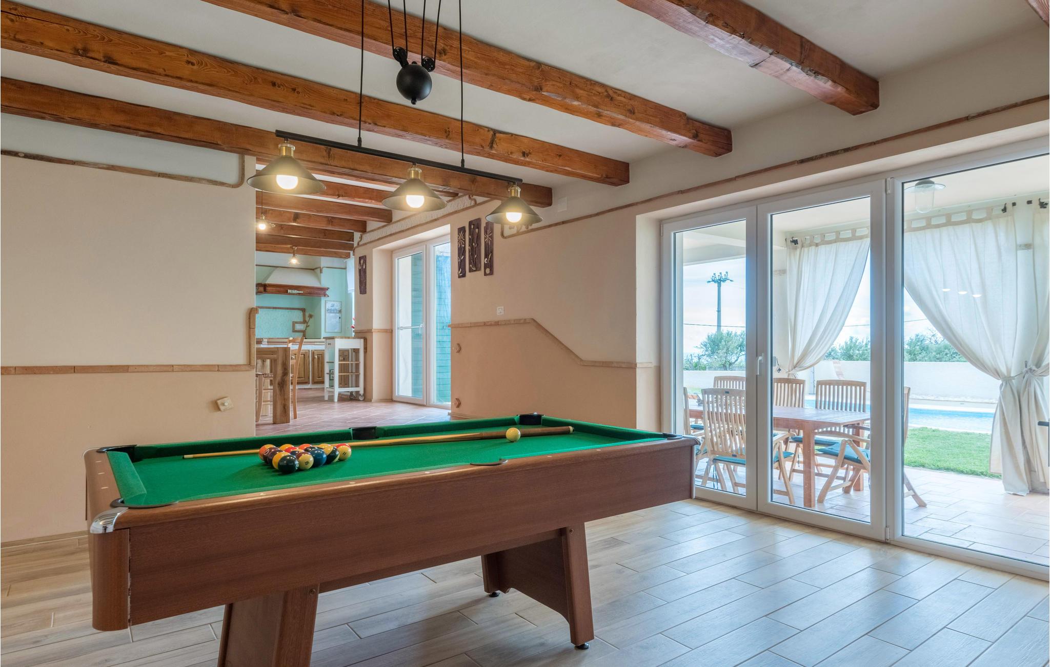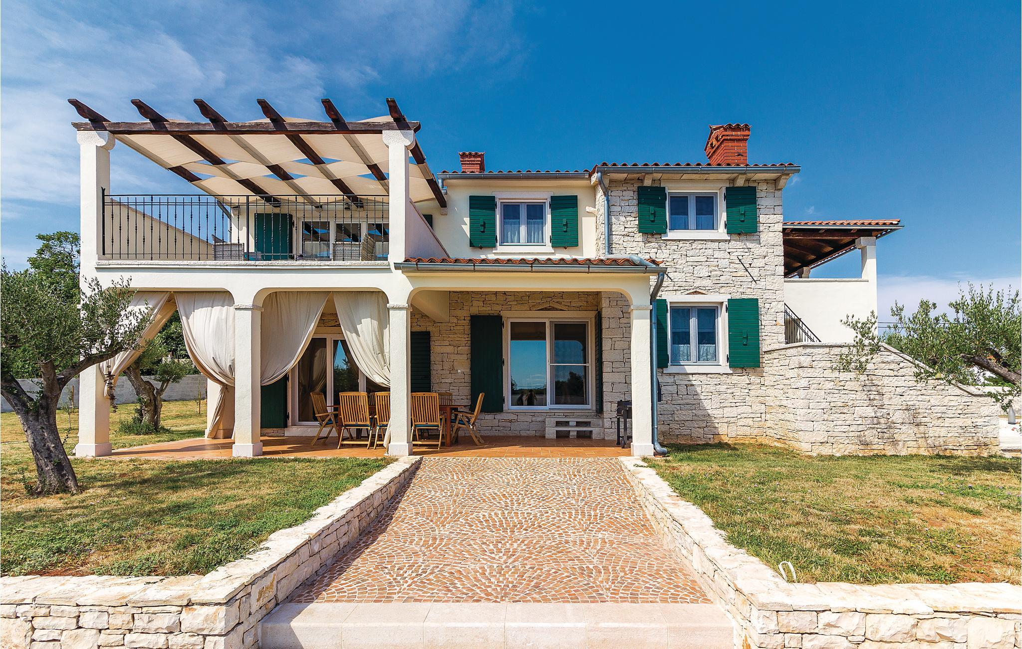 Dette vakre steinhuset ligger i den lille landsbyen Iii, hvor det bare er noen få hus, og hvor du kan nyte privatlivet i de fredelige omgivelsene. Den store og inngjerdede hagen med oliventrær domineres av et svømmebasseng som gir forfriskninger om sommeren. Nyt utsikten over øyene i Kvarnerbukta fra den overbygde terrassen, eller slapp av med et slag biljard. Interiøret er fordelt over to etasjer med utvendige trapper. I andre etasje finner du en stue med kjøkken og spiseplass samt tre soverom, mens det i første etasje er enda et soverom og et ekstra kjøkken samt et lekerom. Herfra har du også tilgang til den overbygde terrassen, hvor det er en grill.