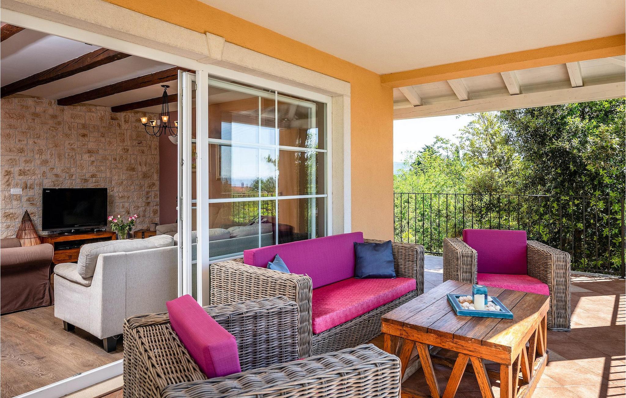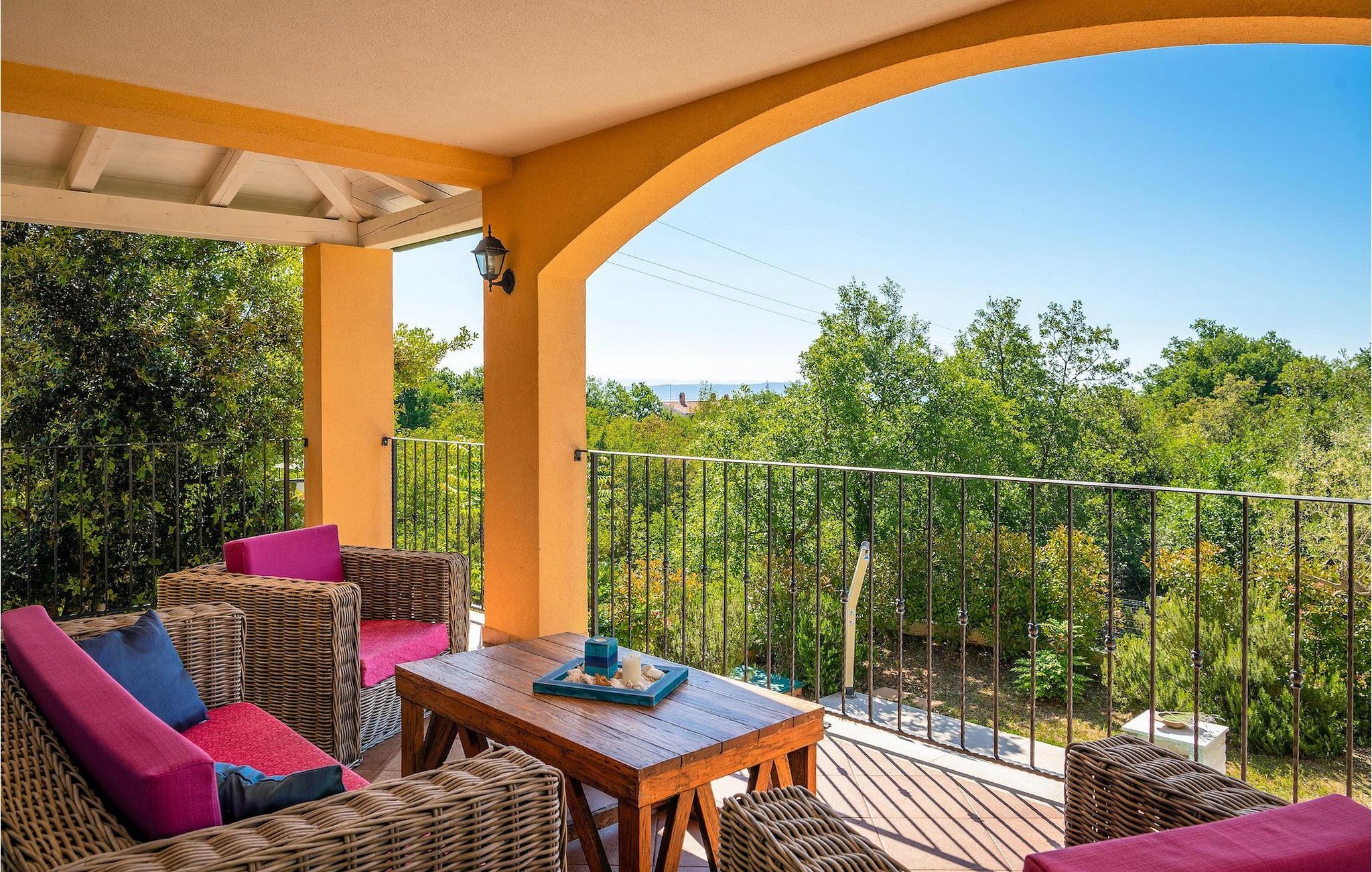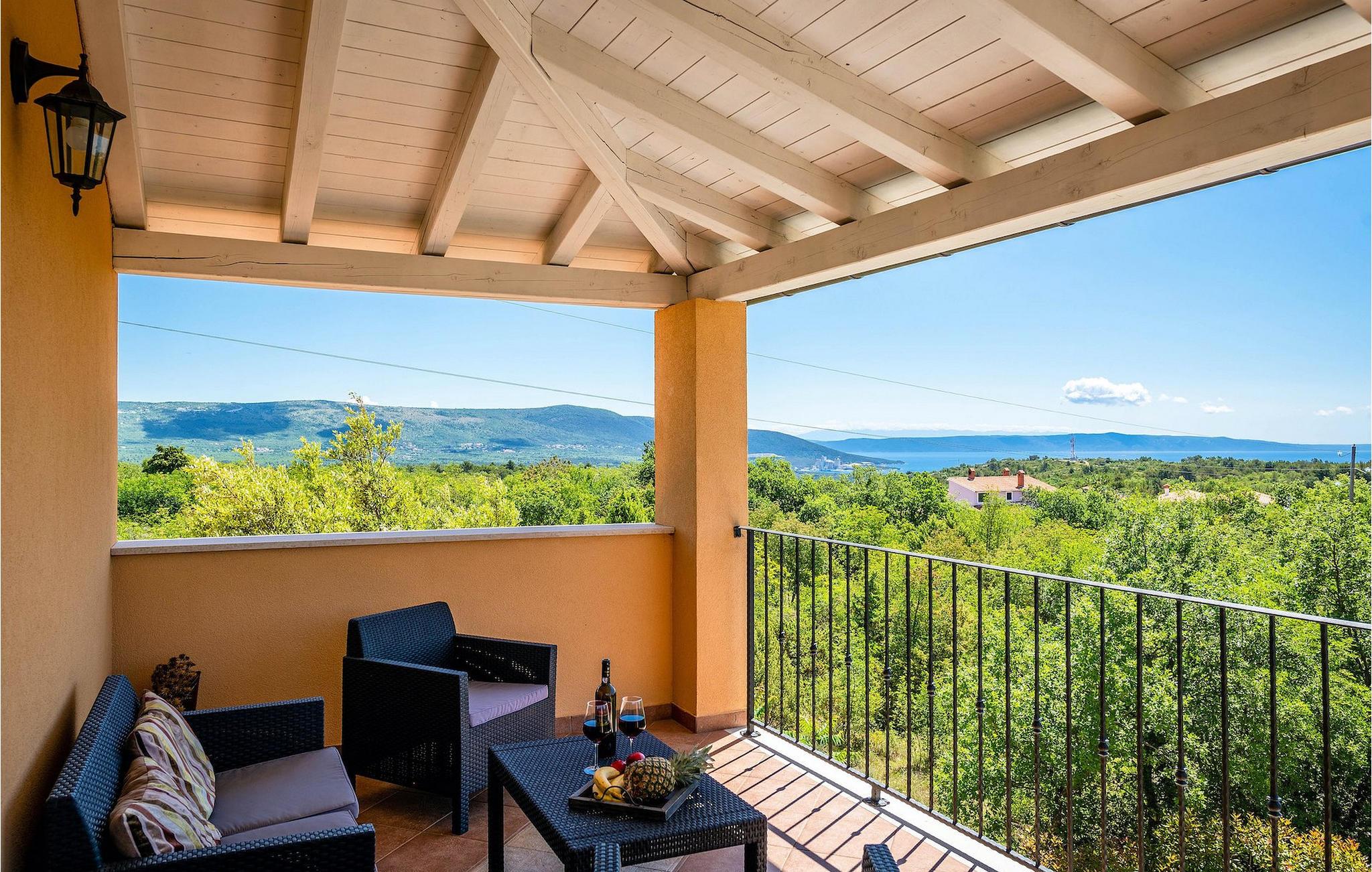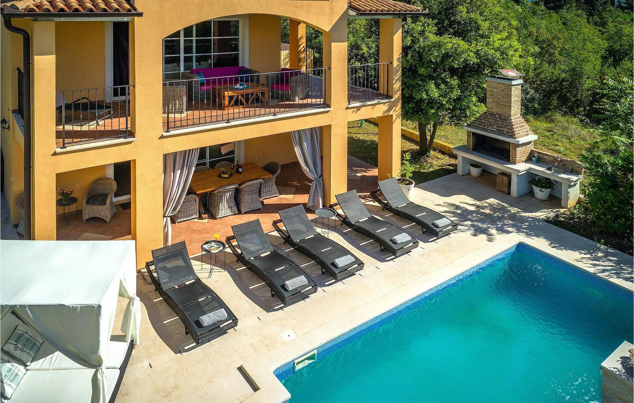 Uteområdet består av en fullt inngjerdet grønn hage med basseng hvor du kan slappe av og nyte solen. På terrassen er det en uteservering med kullgrill. Fra terrassen kan du nyte vakker havutsikt over Kvarnerbukten.