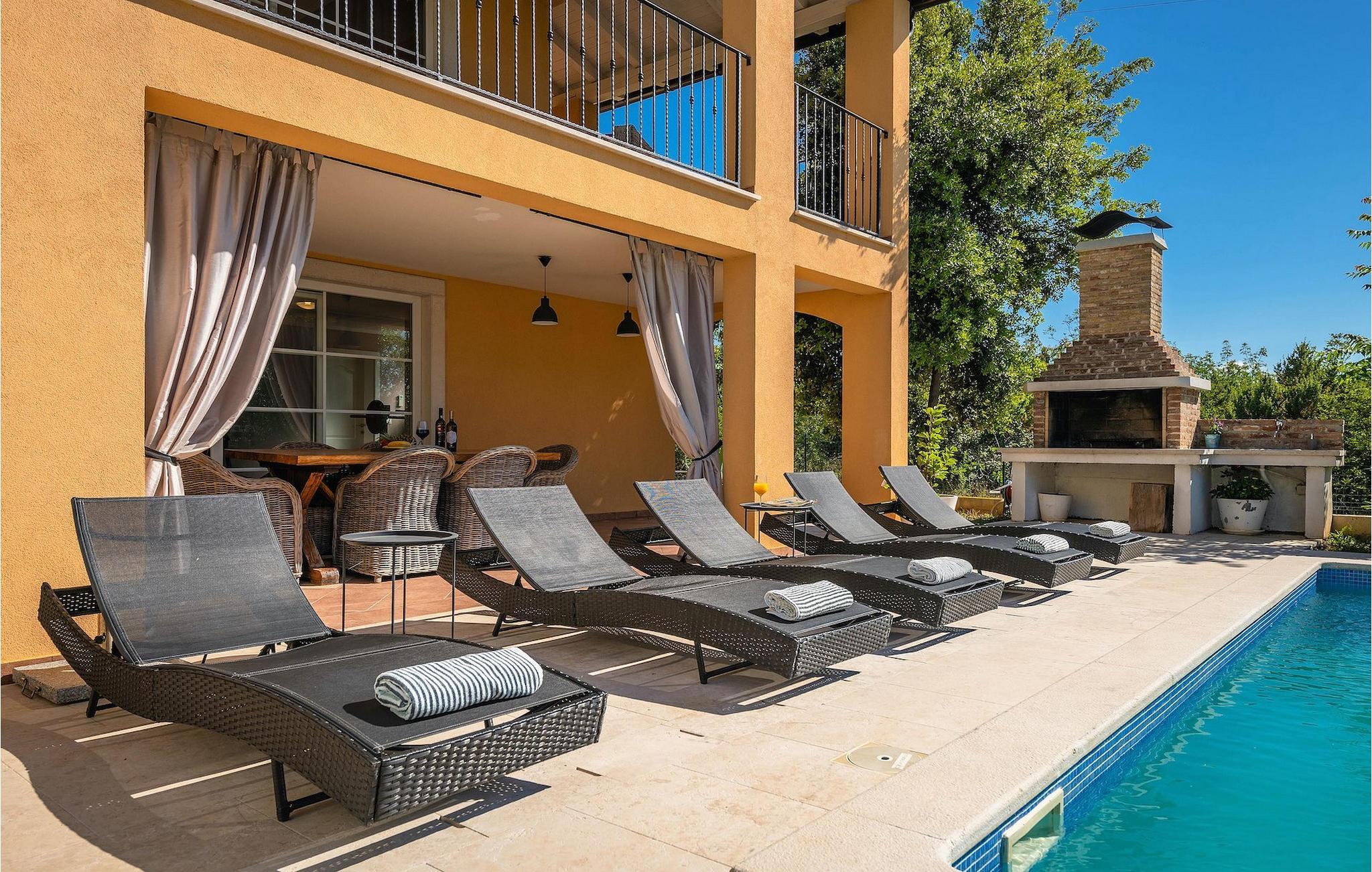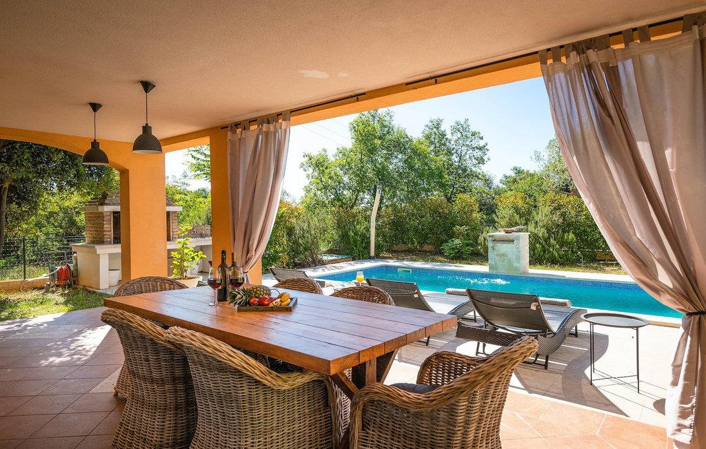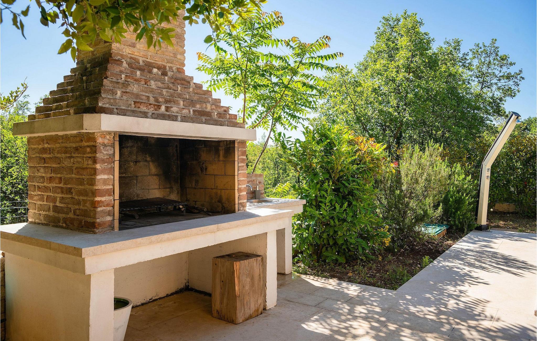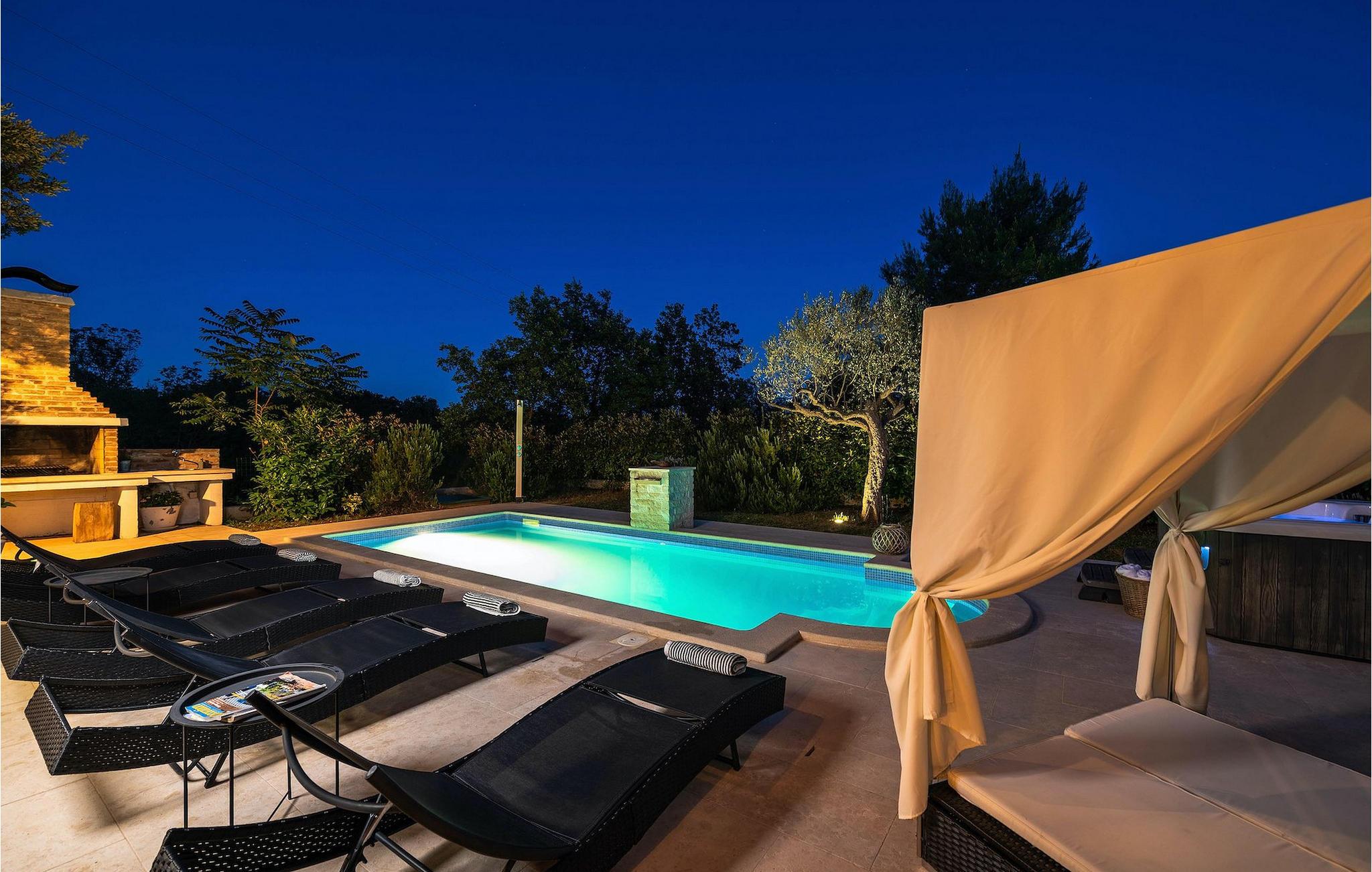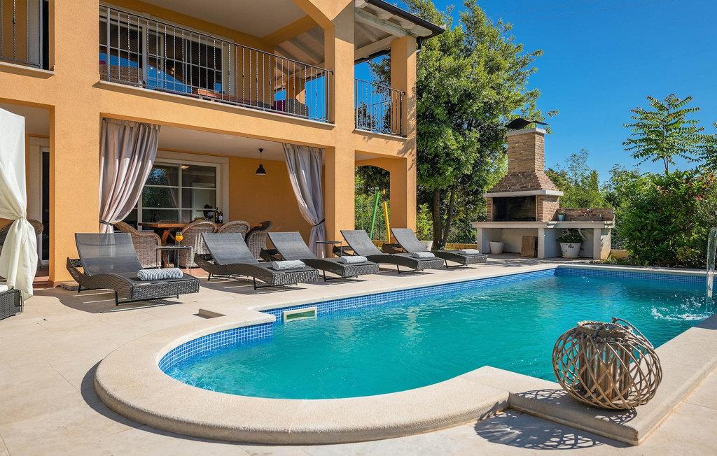Uteområdet består av en fullt inngjerdet grønn hage med basseng hvor du kan slappe av og nyte solen. På terrassen er det en uteservering med kullgrill. Fra terrassen kan du nyte vakker havutsikt over Kvarnerbukten.