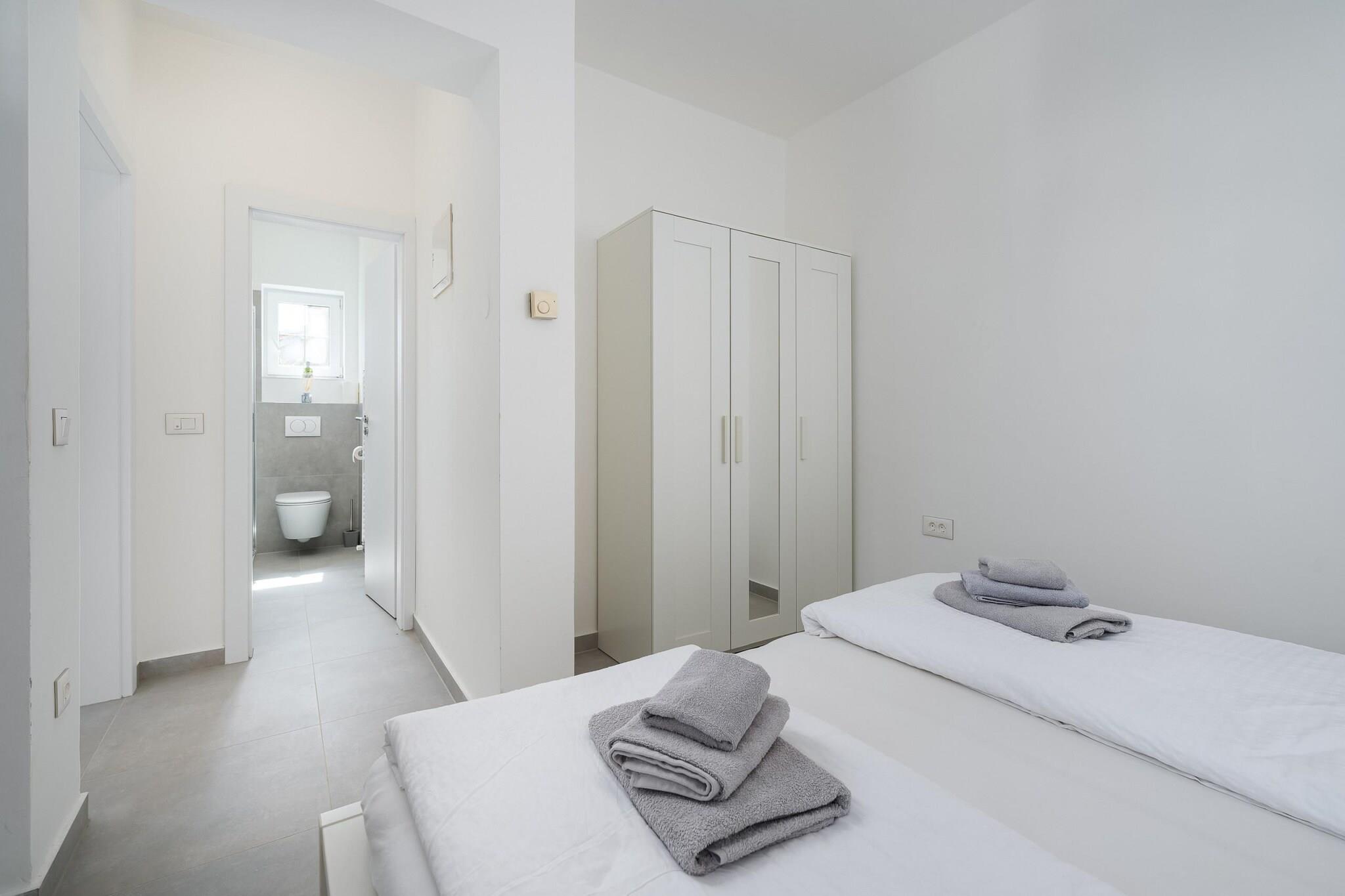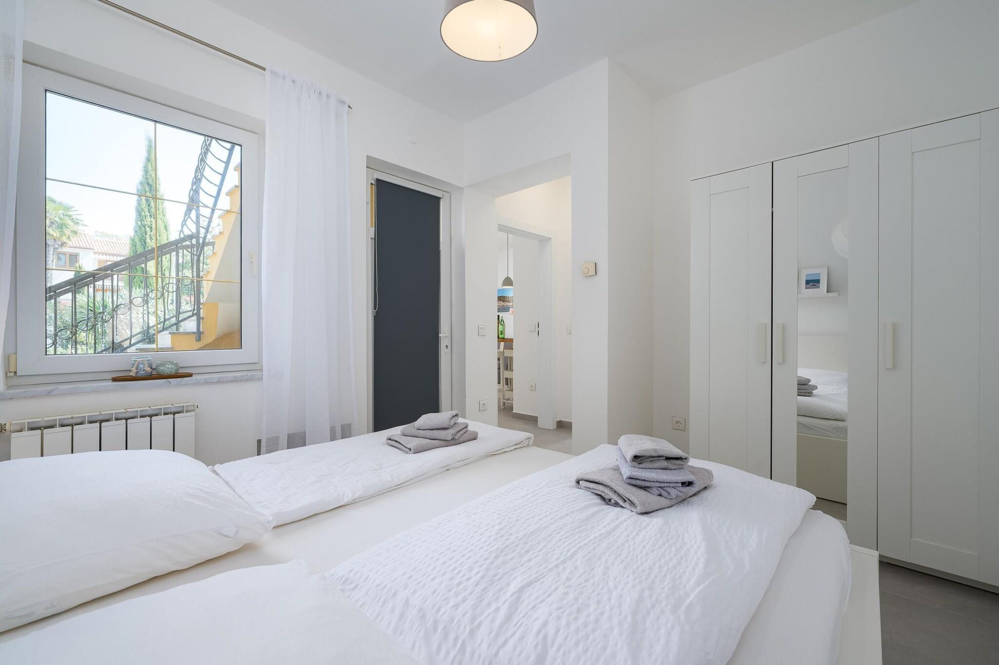 Leiligheten, sammen med sin moderne og veldesignede planløsning, tilbyr en ett-roms plass med kapasitet for opptil tre gjester. Den har en hage med utemøbler, en 15 m² stor terrasse og en grillplass for utendørs servering. Gjestene kan nyte det felles svømmebassenget, perfekt for å slappe av i solen. Leiligheten har klimaanlegg og en varmepumpe for helårskomfort. Ytterligere fasiliteter inkluderer Wi-Fi, en TV med satellittkanaler på engelsk og tysk, og utendørs parkering i samme bygning. Leiligheten ligger i Kukci, et familievennlig område, og tilbyr fredelige omgivelser samtidig som den er nær flere attraksjoner. Den nærliggende stranden og lokale restauranter ligger innen kort kjøretur, med Porec sentrum kun 5 km unna, og tilbyr shopping, spisesteder og kulturelle opplevelser. Gjester kan også besøke nærliggende vannparker og fornøyelsesparker, inkludert "Aquacolors Porec" (8 km) og "Dino Park Funtana" (12 km), noe som gjør dette til et flott alternativ for familier. Leilighetens åpne kjøkken med åpen planløsning er utstyrt med moderne induksjonsapparater, inkludert kjøleskap, mikrobølgeovn, fryser, oppvaskmaskin, kaffetrakter, brødrister og vannkoker. Den leveres også med alt nødvendig kjøkkenutstyr, servise og bestikk for å lage måltider. praktisk og enkel Med sin kombinasjon av praktiske fasiliteter og et avslappende miljø, er leiligheten et ideelt valg for par eller små familier som søker en komfortabel base for oppholdet i Istria-regionen.