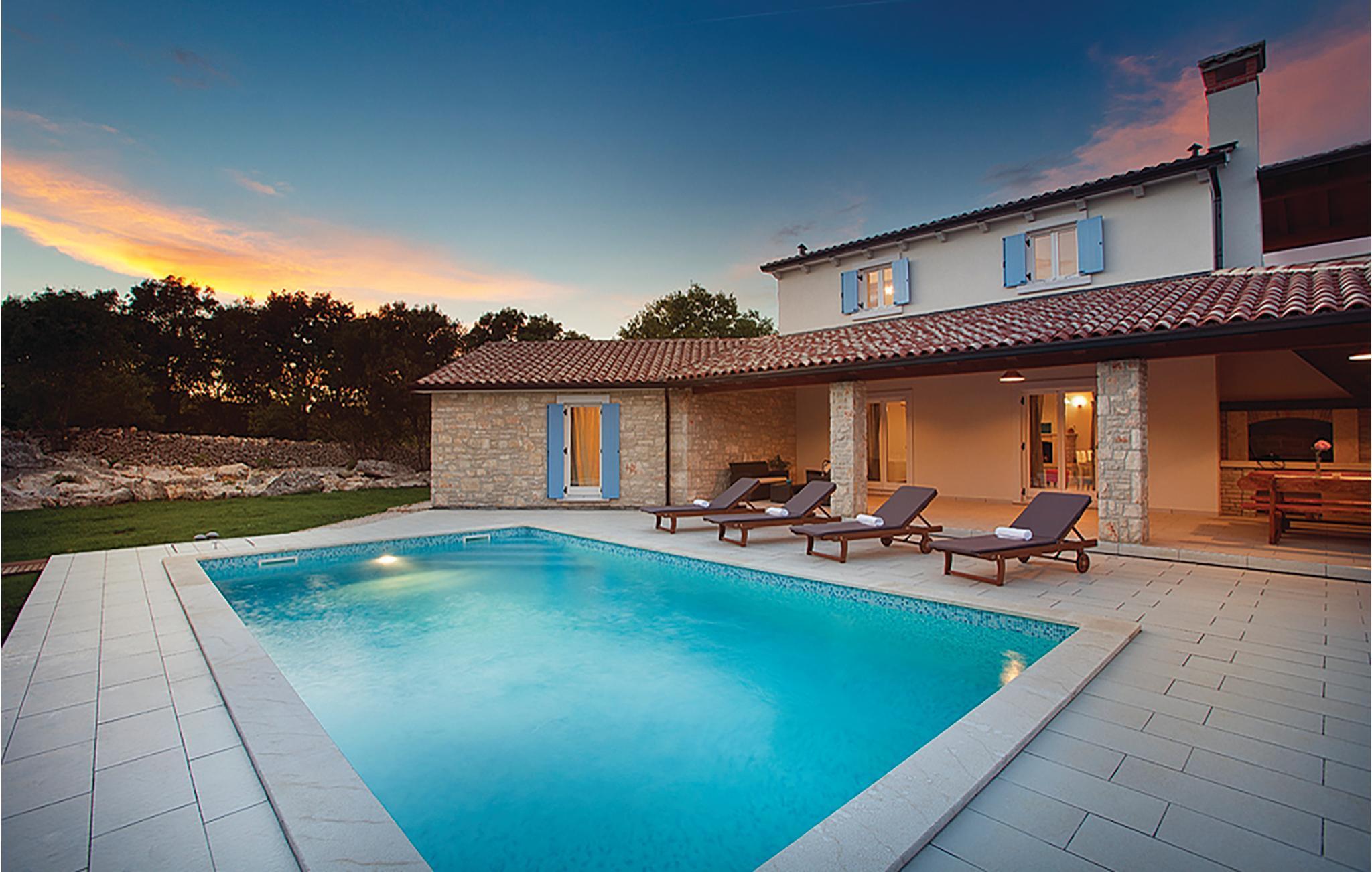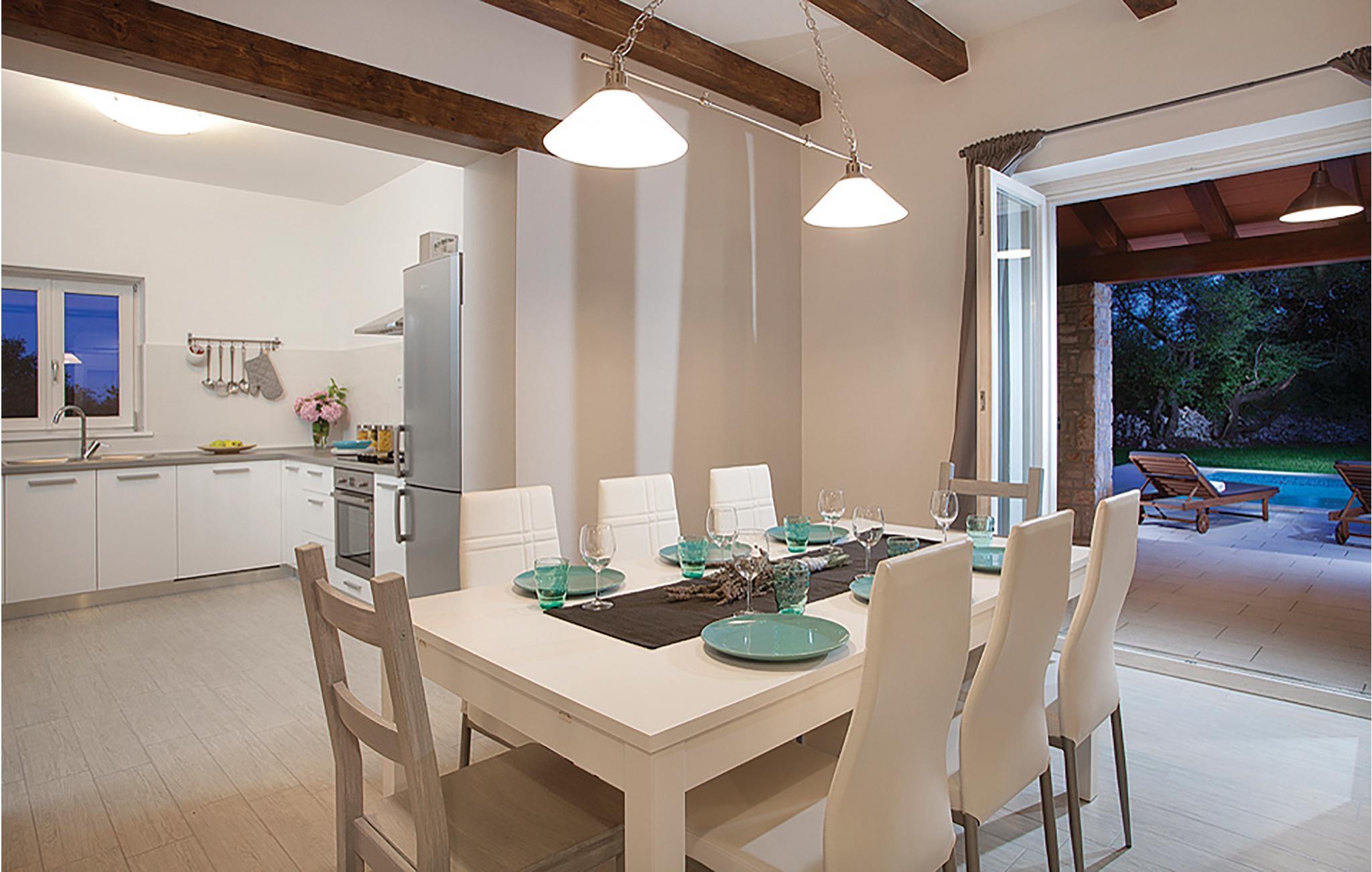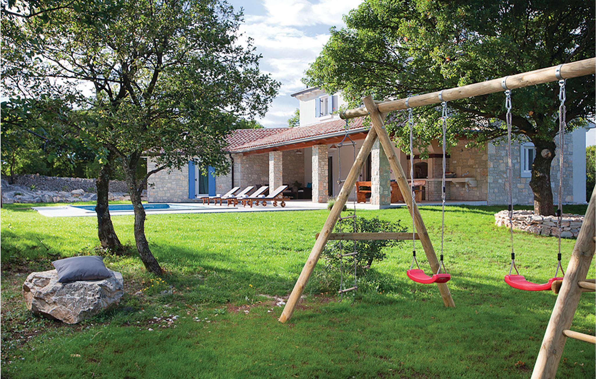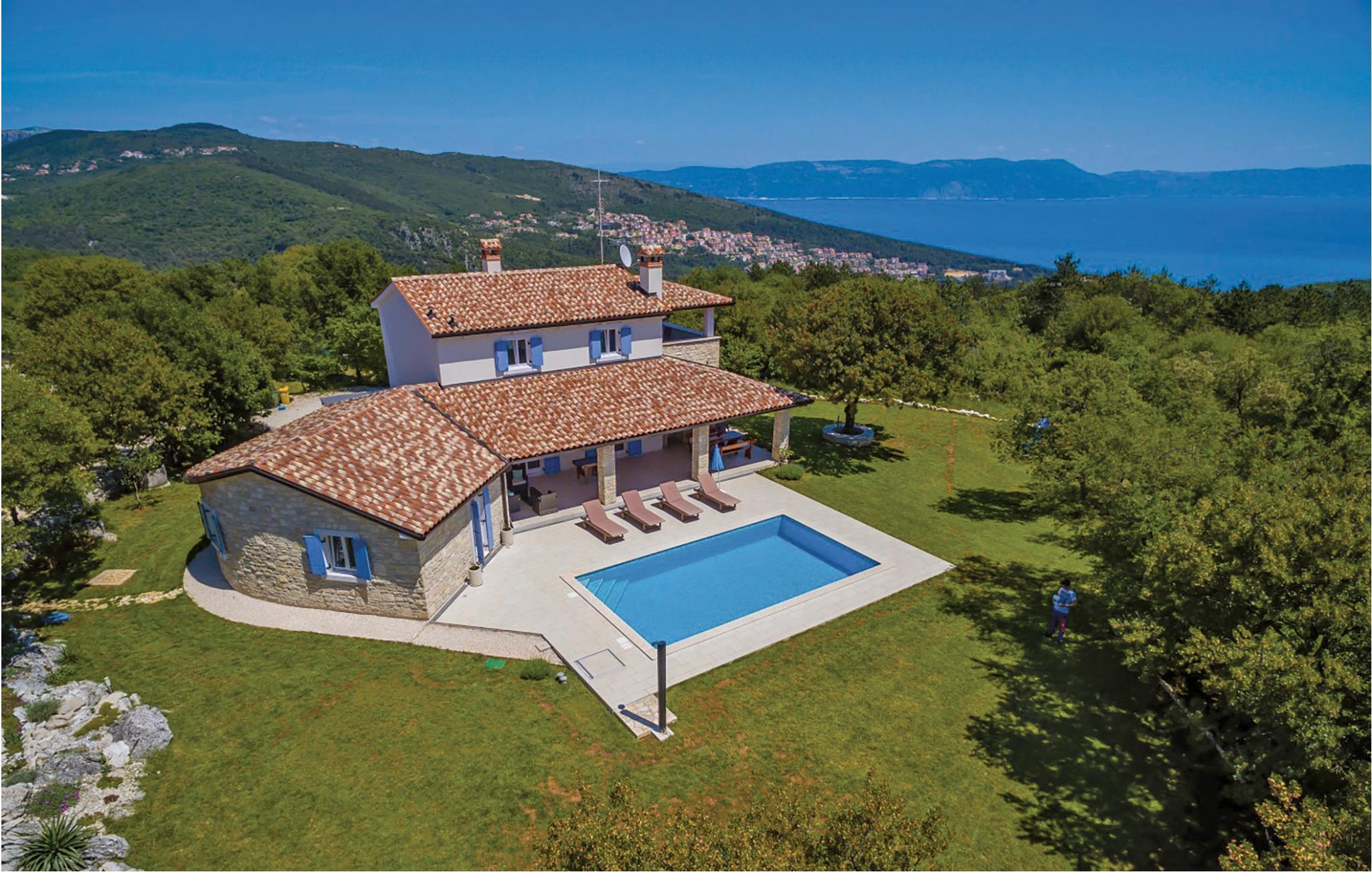 Dette feriehuset ved Middelhavet ligger i nærheten av de vakreste strendene (10 minutters kjøretur). Det er ideelt for å slappe av i de grønne omgivelsene. Fra terrassen i 1. etasje kan du se havet og Kvarnerbukten. Hagen domineres av et vakkert basseng hvor du kan slappe av i en intim atmosfære. På terrassen gir en grill og biljardbordet variasjon. Bortsett fra den vakre stuen med peis, er det to soverom med bad og et ekstra toalett i første etasje. Ovenpå er det to soverom med bad og terrasse. Huset har aircondition, utstyrt med gulvvarme og hvert soverom har egen TV. På omtrent 20 minutter kan du gå til Labin, hvor det er mange kulturelle arrangementer om sommeren. Et multifunksjonelt treningsutstyr er også tilgjengelig.