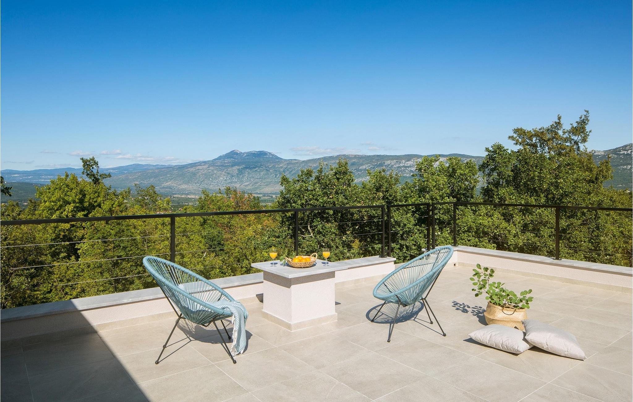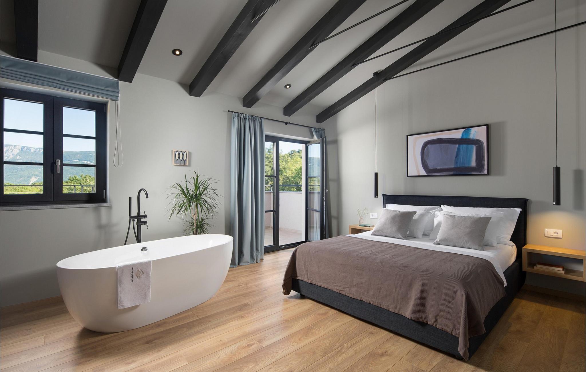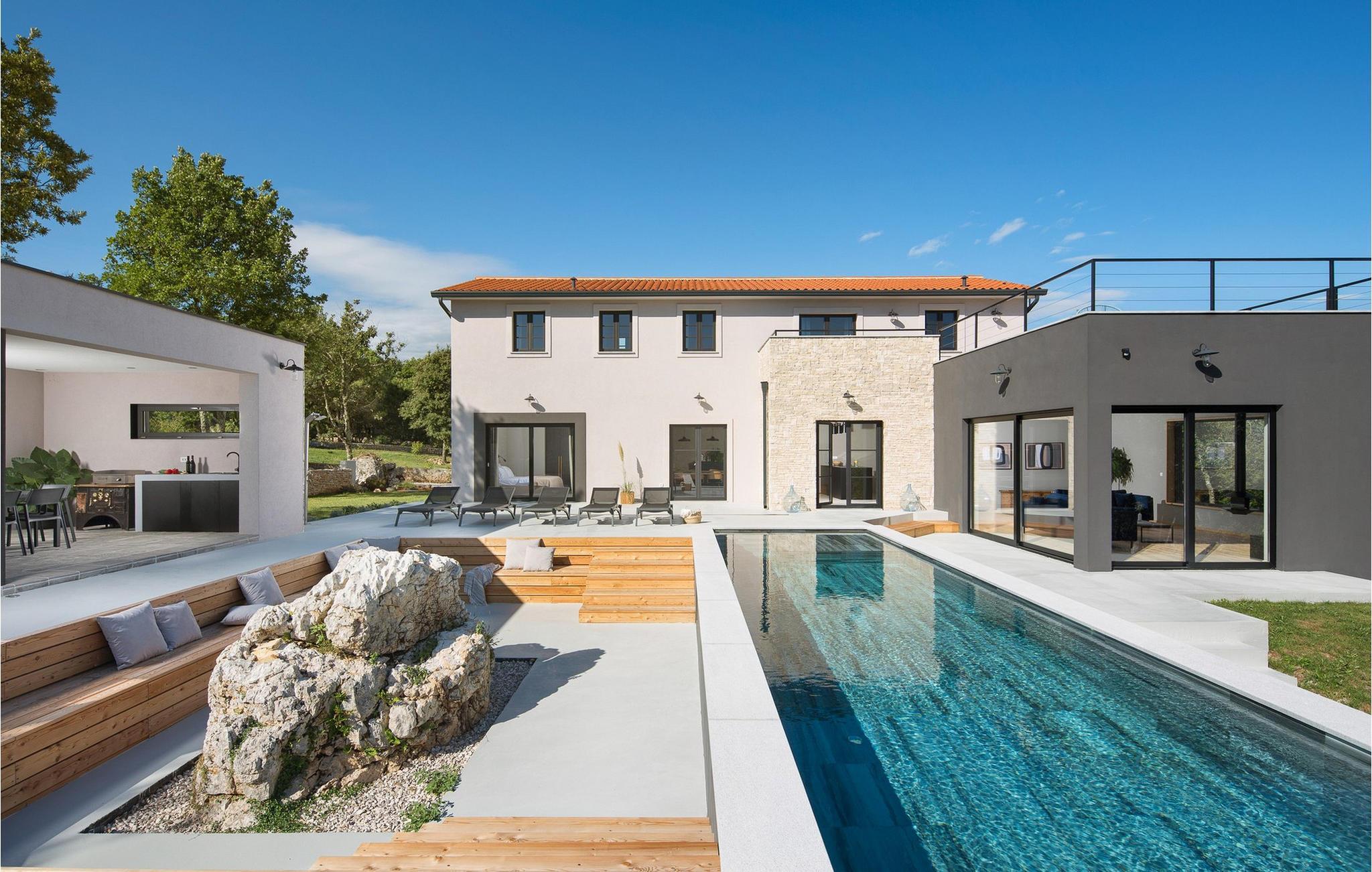 Den luksuriøse Villa Mons Caldera vil glede deg med sin moderne arkitektoniske stil, moderne eksteriør og vakre interiør. Det ligger i Kran i Istria, som har en rik historisk og kulturell arv som går tilbake til 1000-tallet. Villa Mons Caldera tilbyr deg mange muligheter for moro, men også muligheten til å prøve ut kulturelle eller sportslige aktiviteter som du kan finne i umiddelbar nærhet av Kran. Villa Mons Caldera har 2700 m2 plass, har plass til maksimalt 10 personer og garanterer deg en fantastisk ferie du alltid har drømt om. Villaen har fem soverom, hvorav to ligger i første etasje, ett med eget bad med badekar og det andre med bad med dusj. De resterende 3 soverommene ligger i øverste etasje og har eget bad med dusj. Ett av de nevnte rommene har 2 enkeltsenger, mens de andre rommene har dobbeltsenger. Villaen har 1 separat toalett, og i et separat rom er det vaskemaskin og strykejern. I første etasje av villaen, i tillegg til soverommene nevnt ovenfor, er det en stue med 2 sofaer, bord, TV og peis, hvor du kan nyte en avslappende panoramautsikt over den uberørte naturen som omgir villaen. Det moderne utstyrte kjøkkenet og spisestuen med plass til 10 personer er det ideelle stedet for å prøve ut dine matlagingsevner. Villaen er fullt utstyrt og har alle nødvendige fasiliteter som kjøkkenutstyr, en utendørs elektrisk grill, Wi-Fi, en utendørsterrasse og et luksuriøst basseng, slik at du kan slappe av enten du reiser med en gruppe venner eller sammen med din egen familie. På terrassen kan du også svømme i det forfriskende bassenget på 40 m² eller sole deg på 10 solsenger og lese favorittboken din. Ved bassenget er det et lekeområde, og takket være den åpne hagen kan barna ha det gøy i det grønne området uten bekymringer. Et utendørs spisebord med plass til 10 gjester, ved siden av et sittegruppe med salongbord på den ene siden og en utendørs grill på den andre, er et flott sted og en mulighet til å nyte kvelden helt privat. Det er 4 private parkeringsplasser i hagen. For gjester som allerede har besøkt Kran, er det et sted som utstråler en innbydende og vakker natur og fremfor alt en ro som er vanskelig å finne i disse dager. Smak på deilige retter som vil vekke alle sansene dine, utforsk de omkringliggende istriske landsbyene, lei sykler eller ta del i vin- og olivenoljeturer. Her kan du også leie båt med skipper, besøke vakre strender hvor du kan dykke eller fiske, og for de som er ute etter en adrenalinferie, finnes det fotturer og vannsport. Crane er definitivt et sted du alltid vil ønske å komme tilbake til, og det er også den perfekte muligheten til å skape minner som du vil ta med deg videre! * Det er ikke tillatt å arrangere fester i villaen, men personer over 28 år har lov til å bo her!