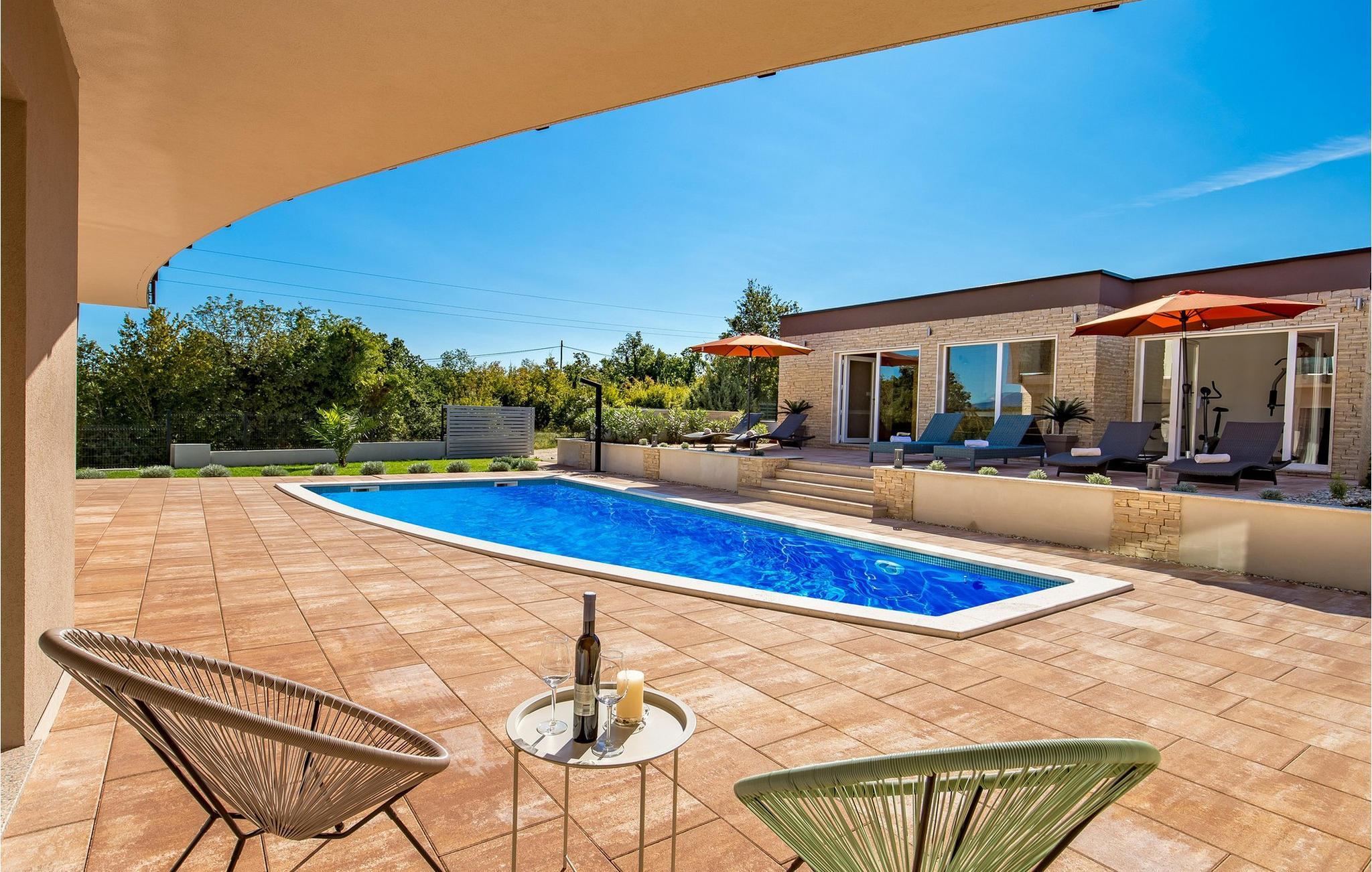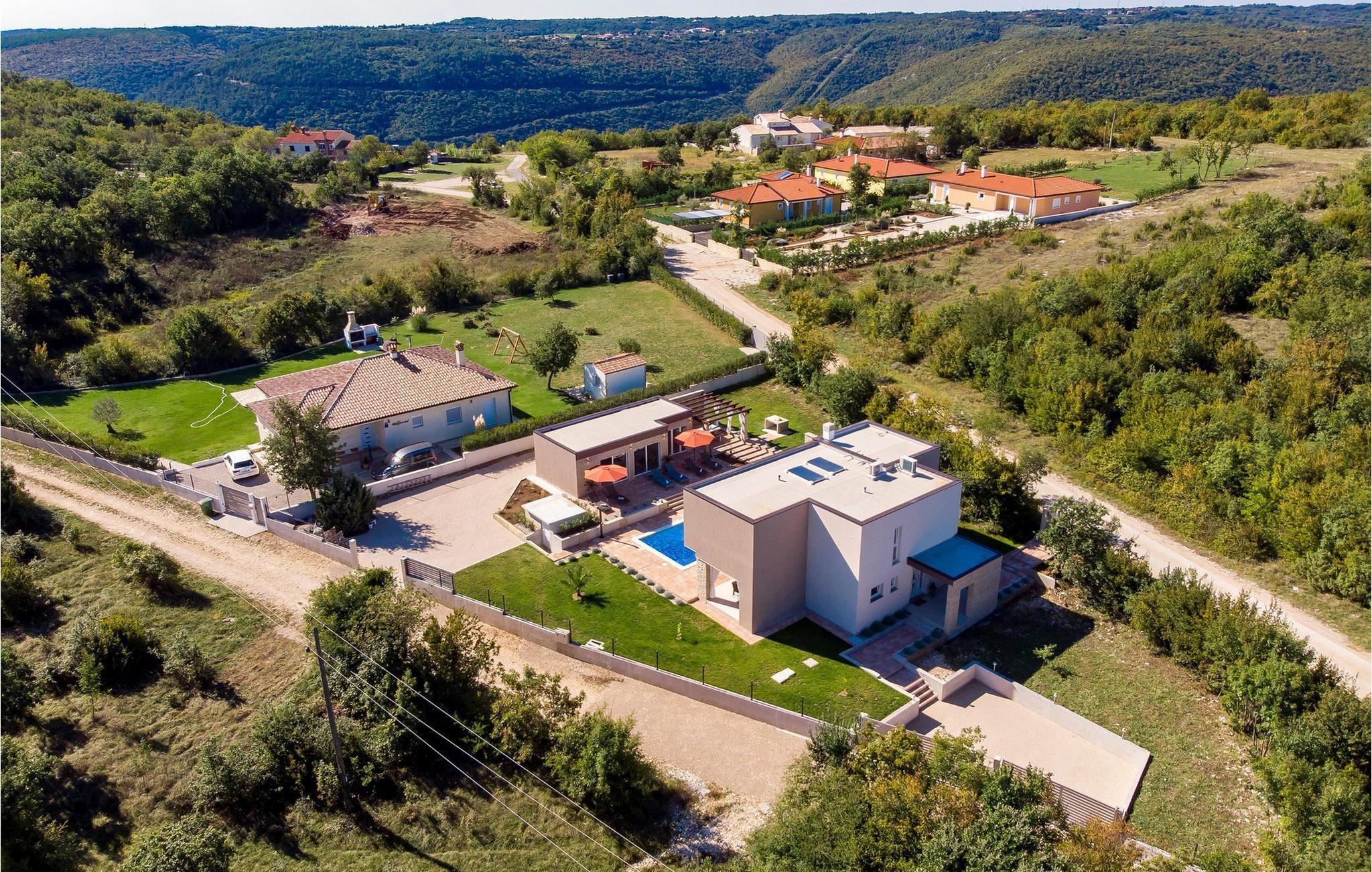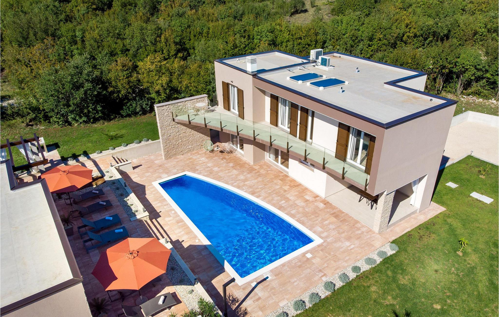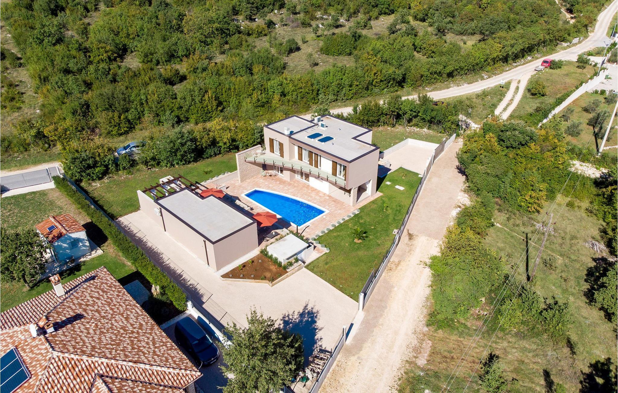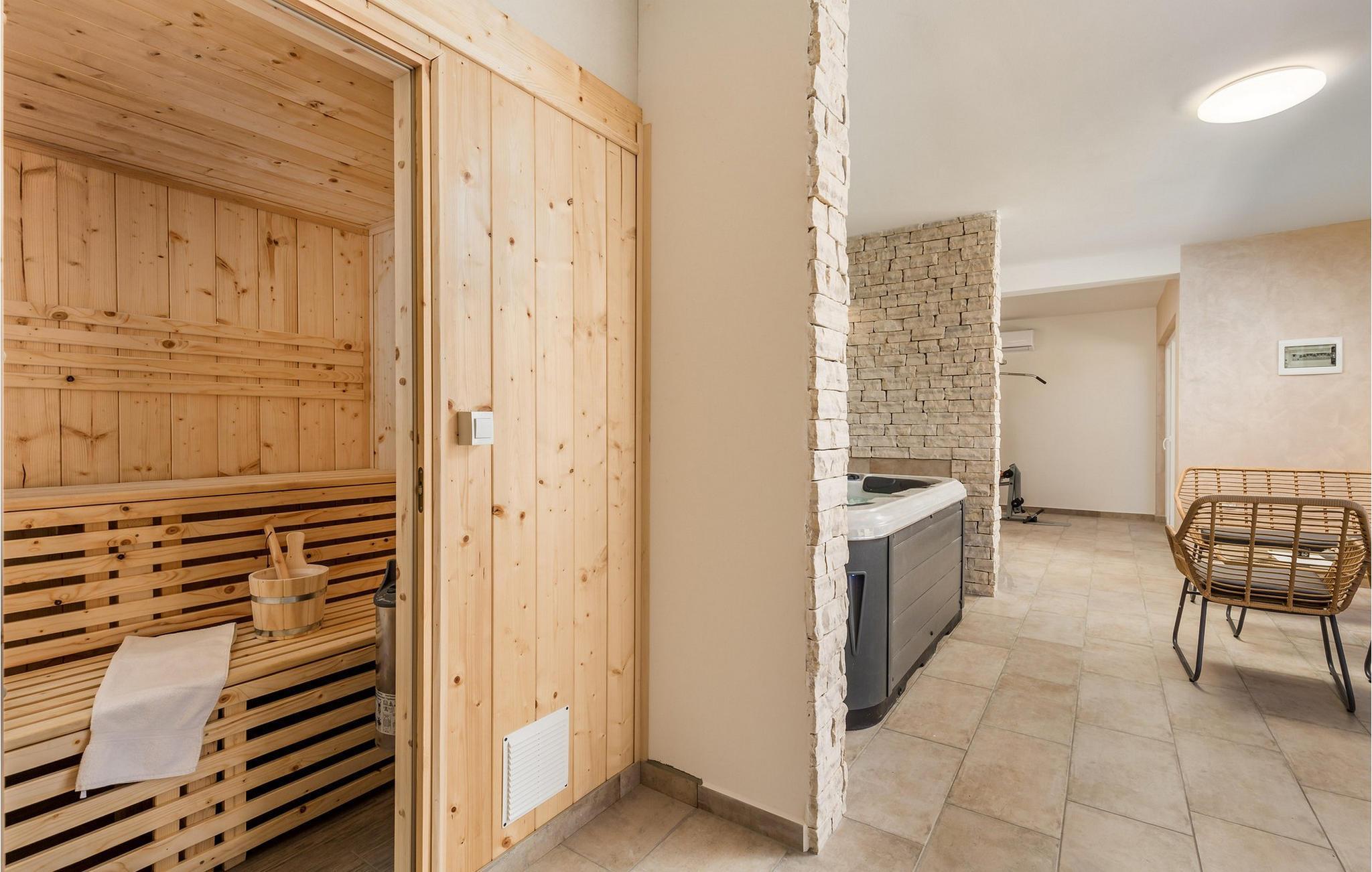Luksusvilla Kunj ligger i landsbyen Kunj i Istria. Villa Kunj er det rette valget for deg som ønsker å tilbringe ferien i fred og ro og samtidig nyte det absolutte privatlivet og luksusen i denne vakre villaen. Villa Kunj er innredet i rustikk-moderne stil og har plass til maksimalt 6 personer. Den har klimaanlegg og er på totalt 208 m2. Villaen er omgitt av uberørt natur og fortryllende grøntområder, og tilbyr alt du noensinne har drømt om. Ovenpå er det 3 soverom med tre dobbeltsenger (180x200) og 3 bad med dusj. I villaens første etasje er det en stue med sofa, toseter, lenestol og TV. Det vakkert innredede kjøkkenet har alt du trenger for å tilberede dine favorittretter, som kokekar, stekeovn, brødrister, kaffetrakter og vinkjøleskap. Kjøkkenet har også en liten bar med plass til 2 personer. I nærheten av kjøkkenet er det en spisestue med et bord med plass til 6 personer, og ved siden av er det utgang til utendørsterrassen. Leiligheten har også vaskemaskin, tørketrommel og strykejern, og villaen har separat toalett. Vil du virkelig føle deg luksuriøs, kan du benytte deg av badstuen, treningsstudioet og boblebadet, som ligger overfor villaen i en separat bygning og deles med bassenget. Hvis du reiser med barn, kan du benytte deg av materen og barnesengen. Bassenget er 38 m² stort, og her kan du forfriske deg i fred og ro både dag og natt. Ved siden av bassenget er det 6 solsenger, omgitt av en åpen hage og rikelig med plass til barnelek, og barna kan også boltre seg på huskene. Ved siden av det overbygde utendørs spisebordet med plass til 6 personer står en grill som kan fyres med kull eller ved. Du kan benytte 4 private parkeringsplasser i hagen. Kunj er en liten landsby ikke langt fra byen Labin og Istrias kyst med vakre strender og klart hav. Istria-halvøya byr på mange attraksjoner og fasiliteter som er verdt et besøk. Det vakre landskapet og det solfylte middelhavsklimaet byr på morsomme og interessante dagsturer med familien eller vennegjengen. I byen Labin bør du besøke Labin-gruven, som tidligere var en viktig del av Labin-regionen. En morsom og luksuriøs ferie er garantert! Velkommen til Villa Kunj! Vær oppmerksom på at dette overnattingsstedet ikke tar imot ungdomsgrupper eller utdrikningslag. En ungdomsgruppe på dette overnattingsstedet består av personer under 30 år. Ikke bestill dette overnattingsstedet hvis du er en ungdomsgruppe eller et utdrikningslag, da bestillingen din vil bli avvist etter bestilling, noe som også kan være tilfelle ved ankomst til overnattingsstedet eller under oppholdet, og du vil ikke få refusjon.