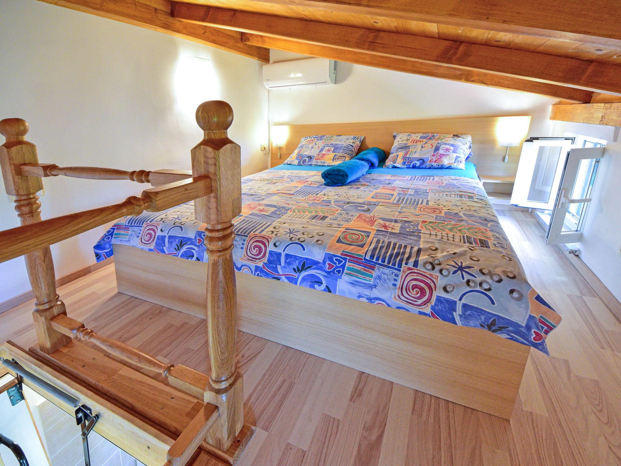 2-room bungalow 18 m2 on 2 levels, south facing position. Living/dining room, ceiling height 190 cm with satellite TV (flat screen). Open kitchen (2 ceramic glass hob hotplates, microwave, electric coffee machine), ceiling height 190 cm. Shower/WC. Top floor: (steep stair), 1 room with sloping ceilings, ceiling height 97 - 178 cm with 1 double bed (2 x 90 cm, length 200 cm), air conditioning. No heating option. Facilities: Internet (WiFi, free). Maximum 1 pet/ dog allowed. Low placed windows in the bedrooom with sloping ceilings.