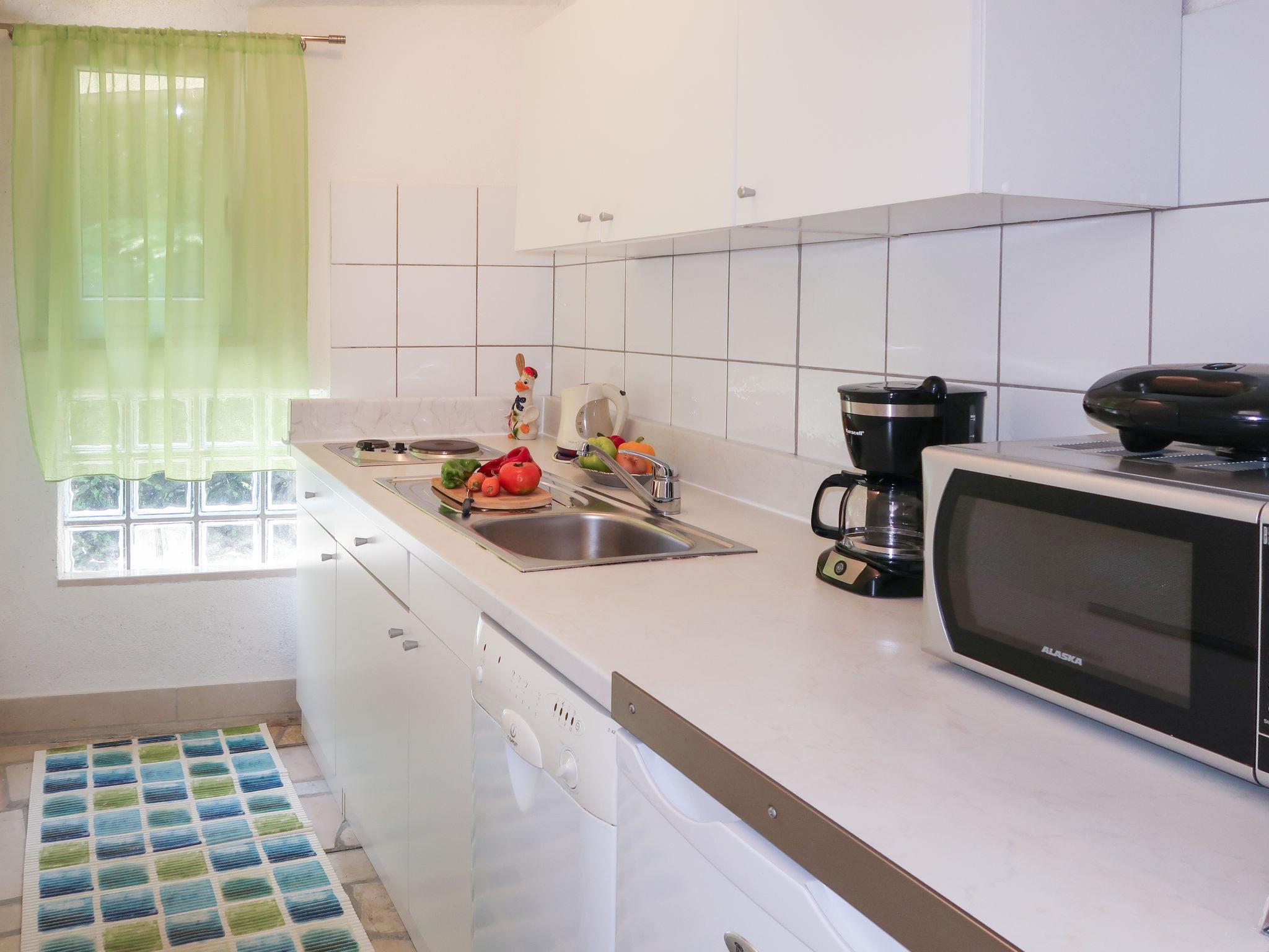 "Karin", 2-room house 50 m2 on 2 levels. Living/dining room with 1 double sofabed (160 cm, length 200 cm), satellite TV (flat screen). Exit to the terrace. Kitchen (2 hot plates, dishwasher, toaster, kettle, microwave, electric coffee machine). Shower/WC. No heating option. Upper floor: entrance hall with air conditioning. 1 room with 1 bed (90 cm, length 190 cm), 1 french bed (160 cm, length 200 cm). Air-conditioning (extra). No heating option. Terrace 10 m2. Terrace furniture, deck chairs (2). Facilities: Internet (WiFi, free). Please note: non-smoking house.