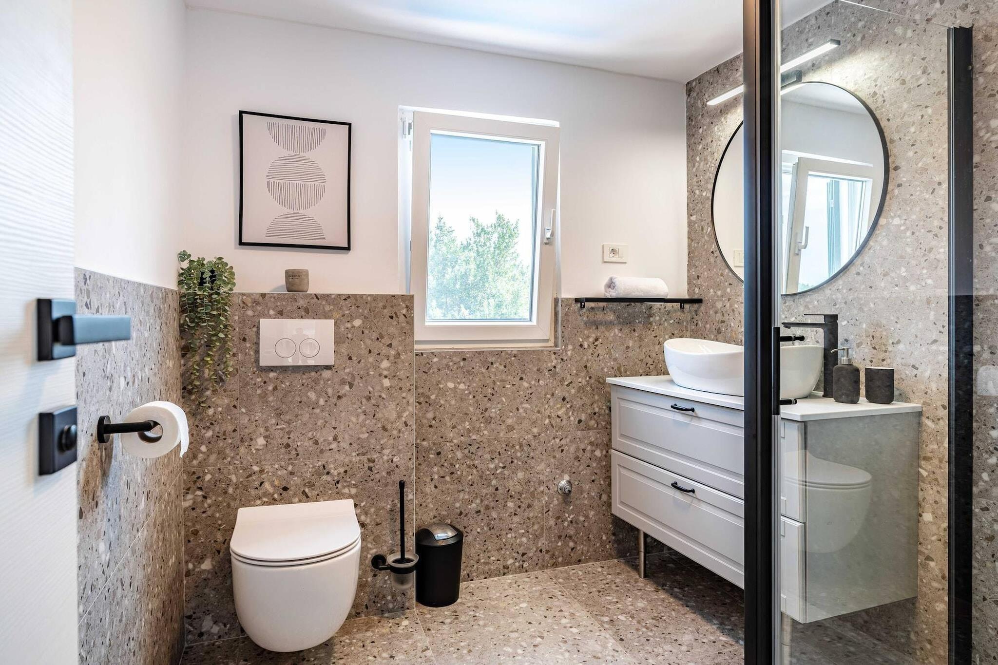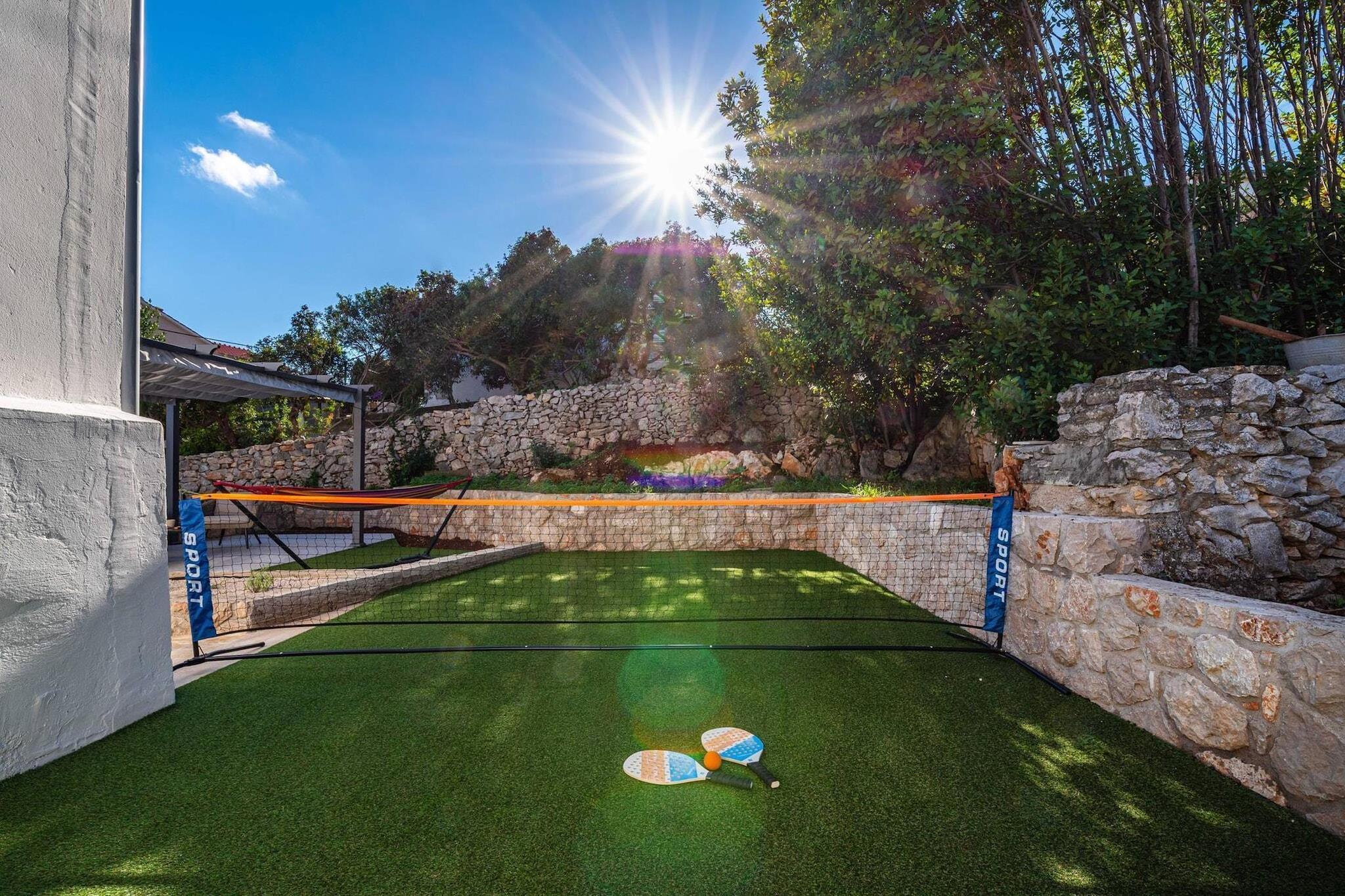 Denne moderne villaen har en perfekt beliggenhet i den fredelige kystbyen Lukoran på øya Ugljan, bare 300 meter fra stranden. Den er designet for komfort og stil, og tilbyr privat svømmebasseng, panoramautsikt over havet og et avslappende miljø som er ideelt for opptil åtte gjester. Den er valgt for sine utmerkede fasiliteter og imøtekommende vert, og gir den perfekte balansen mellom ro og enkel tilgang til havet. Villaen har en lys åpen stue og spisestue med fullt utstyrt kjøkken, tre soverom med aircondition og to moderne bad. Hvert soverom har smart-TV med Netflix, som sikrer underholdning for alle. Ute kan gjestene nyte et privat svømmebasseng med motstrømsystem, volleyball- og basketballmuligheter og en overbygd terrasse med grill og stort spisebord med utsikt over Adriaterhavet. En salong og bordtennis bidrar til moroa, mens solsenger og dusj ved bassenget gir rom for avslapning. Eiendommen ligger bare en kort kjøretur fra Preko og har praktiske fergeforbindelser til Zadar, som gir enkel tilgang til restauranter, butikker og attraksjoner. Den nærmeste stein- og sandstranden med gratis solsenger og dusjer ligger bare noen få minutter unna. Med sin kombinasjon av komfort, utsikt og flott beliggenhet er denne villaen et ideelt valg for familier eller venner som ønsker en avslappende øyferie med mange utendørsaktiviteter.