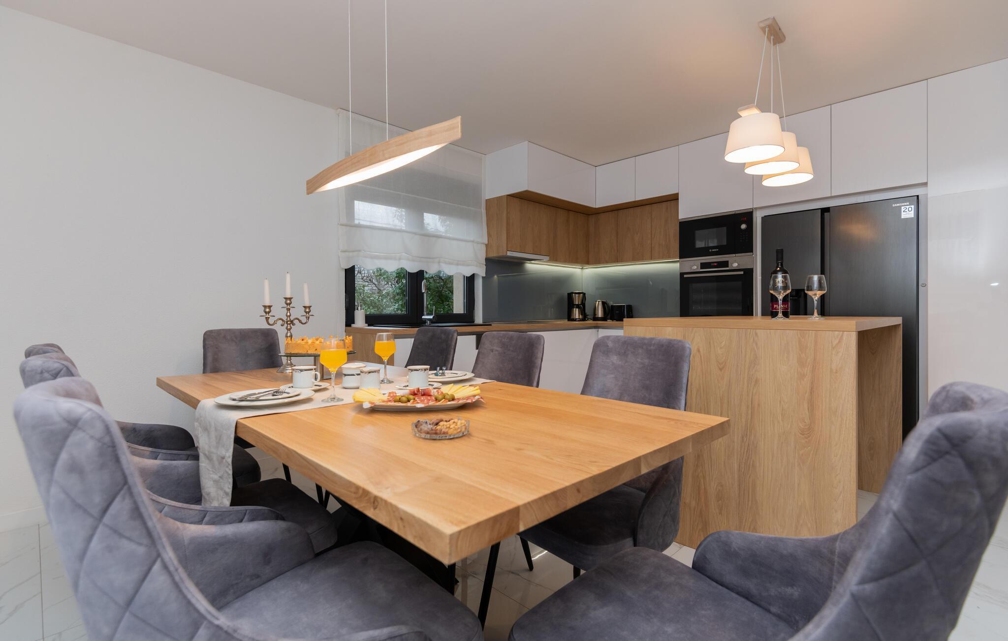 Tilbring ferien i dette innbydende feriehuset i Makarska-Kamenmost. Atmosfæren kombinerer moderne komfort med tradisjonell sjarm, ideelt for en avslappende ferie. Den smakfulle innredningen gir deg alt du trenger, fra romslige soverom til en stilfull stue hvor du kan slappe av. Nyt måltidene på det fullt utstyrte kjøkkenet eller slapp av på den romslige terrassen med utsikt over bassenget. Uteområdet med basseng innbyr til familiehygge og avslapning. Se barna løpe rundt på den private lekeplassen mens du slapper av på solsengen.