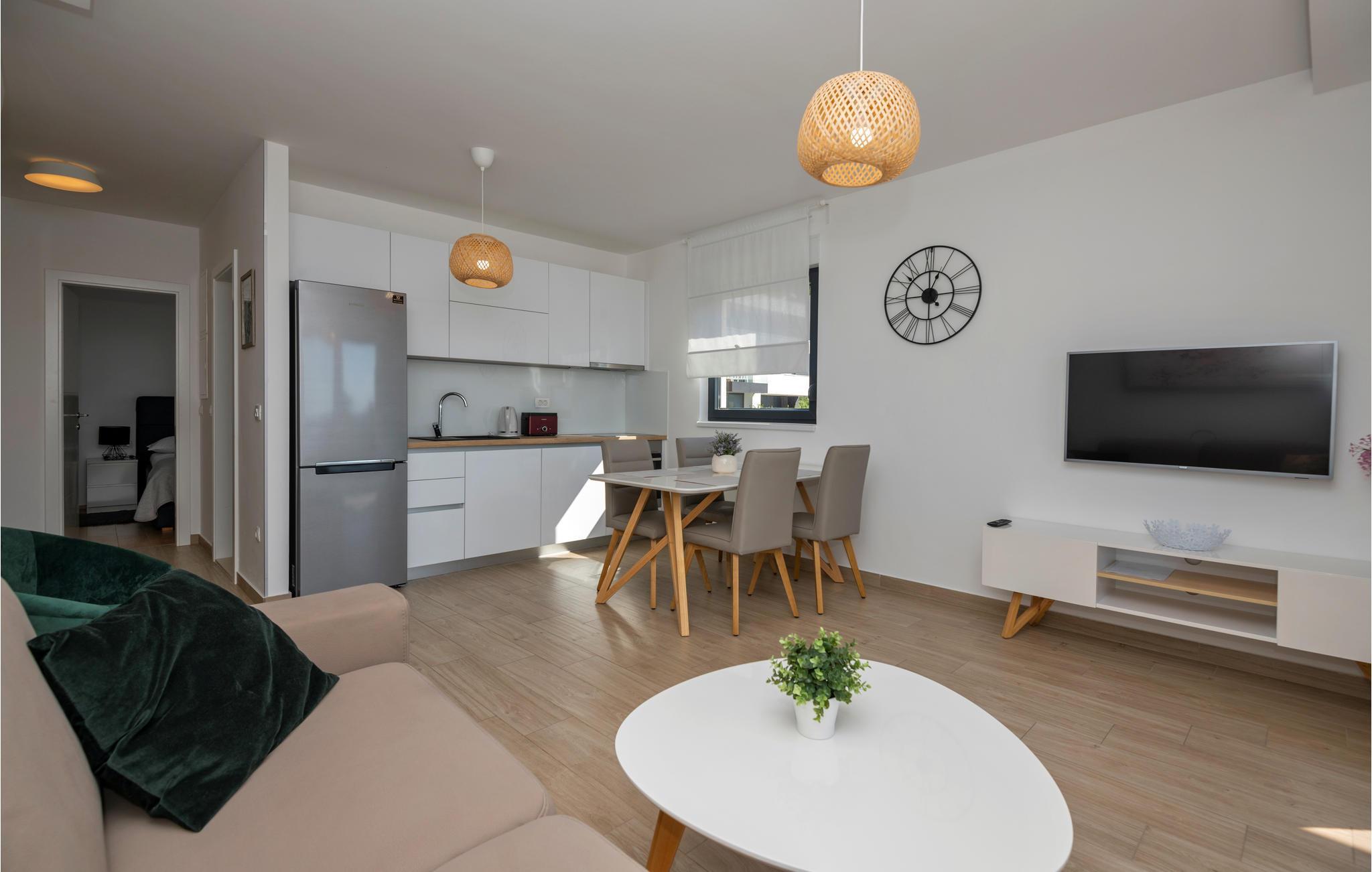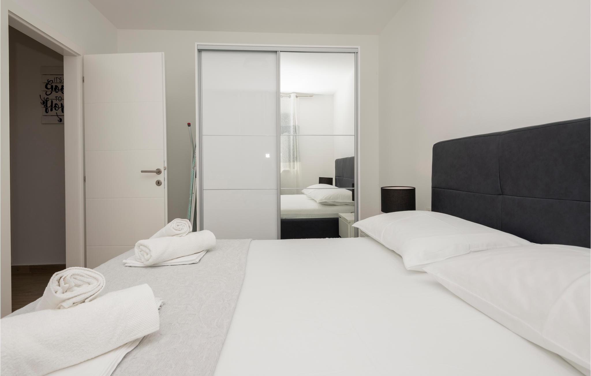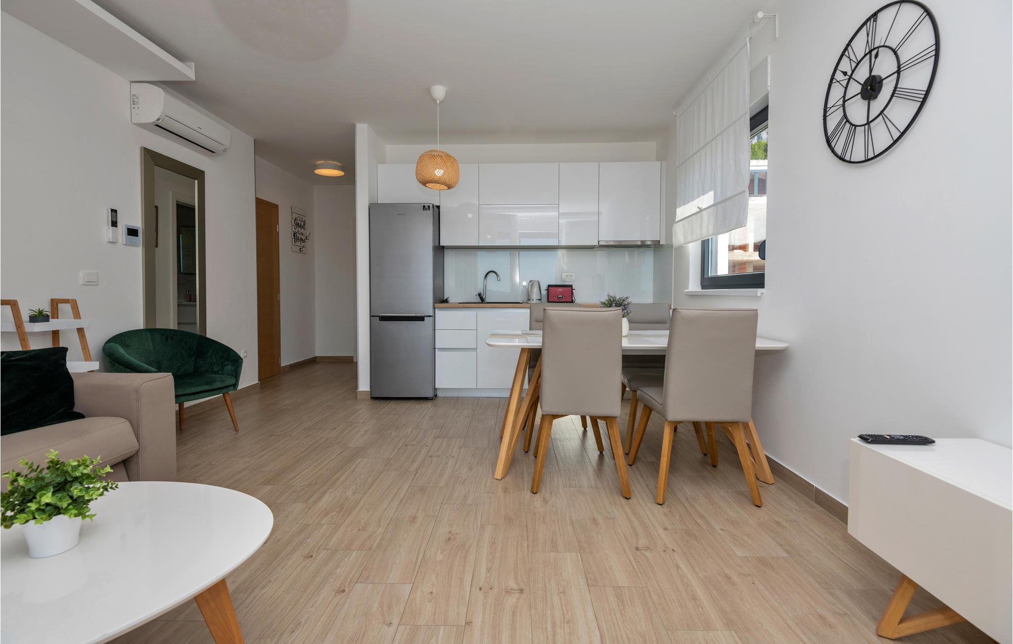 Denne herlige ferieleiligheten er komfortabelt og funksjonelt utstyrt for en hyggelig ferie. Her kan du tilbringe mange herlige timer i og rundt det felles oppvarmede bassenget mens du nyter det fantastiske været ved Adriaterhavet. Ved siden av bassenget er det en felles grill og plass til sosialt samvær og grilling.