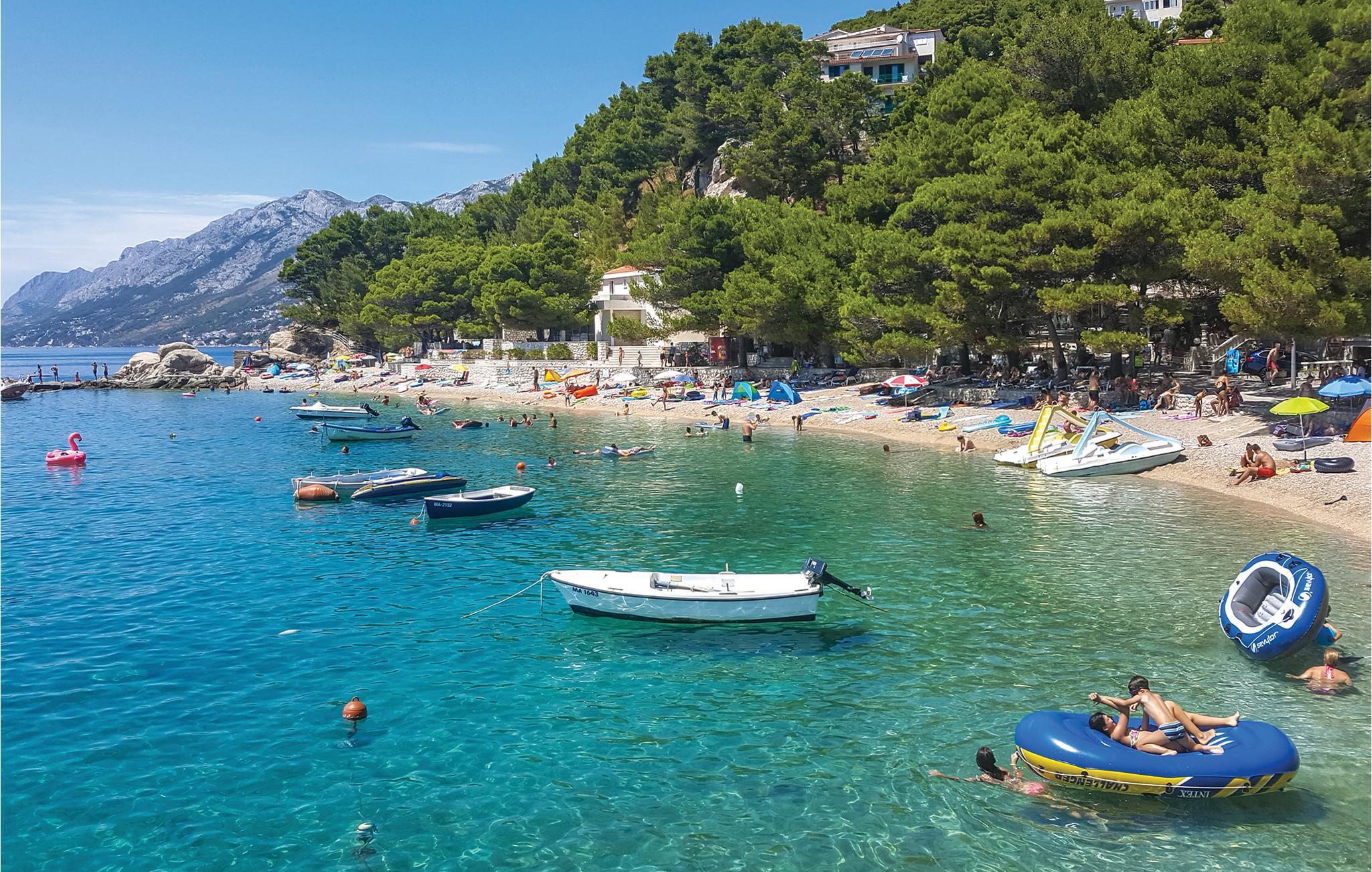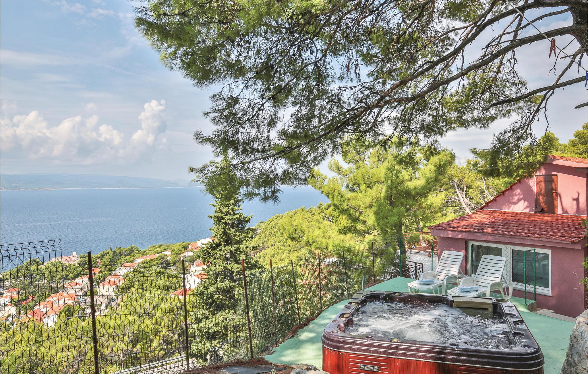 Dette vakre feriehuset ligger over sentrum av Brela, ikke langt fra Makarska og en av perlene i Dalmatia. Huset består av to etasjer forbundet med en utvendig trapp. I første etasje er det en romslig terrasse med fantastisk utsikt over havet og øyene, hvor du kan sitte komfortabelt med et glass vin eller en kopp kaffe og nyte utsikten. Et utendørsbasseng er installert på terrassen for avslapning. Bratte trapper fører til innkvarteringen i åssiden, og en vei med trafikk går ved siden av huset. De vakre rullesteinstrendene og andre fritidsaktiviteter kan nås med bil.