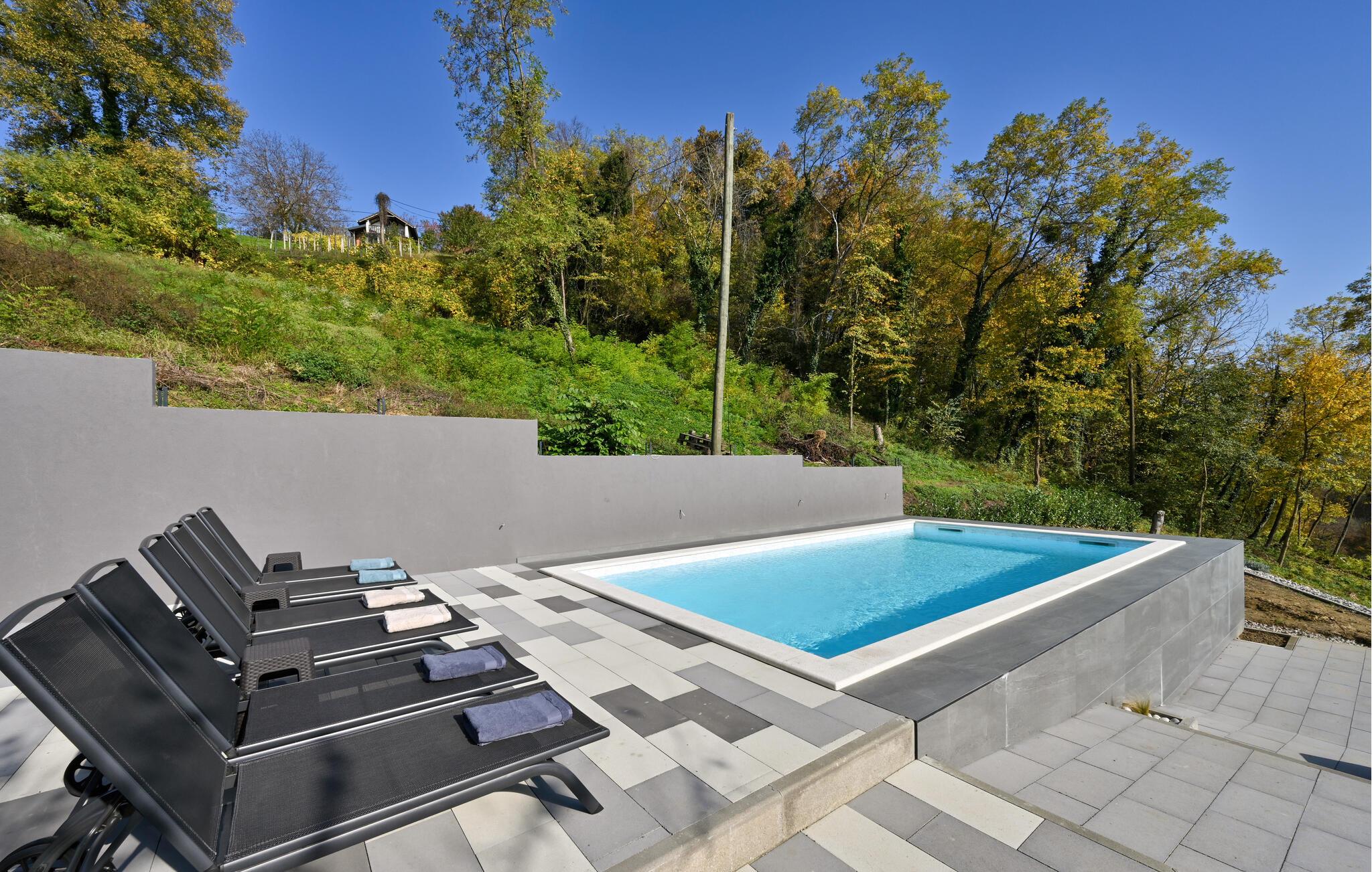 Velkommen til dette stilfulle og lyse feriehuset på en høyde i nærheten av pilegrimskirken Marija Bistrica. Den smakfulle innredningen og de romslige rommene er ideelle for par eller store familier. Nyt rolige timer i det oppvarmede utendørsbassenget med hydromassasje, eller slapp av med den fantastiske utsikten over dalen og de omkringliggende vinmarkene og åsene. En koselig grillplass og terrassen innbyr til hyggelige kvelder i det fri, omgitt av frisk luft og beroligende fuglekvitter.