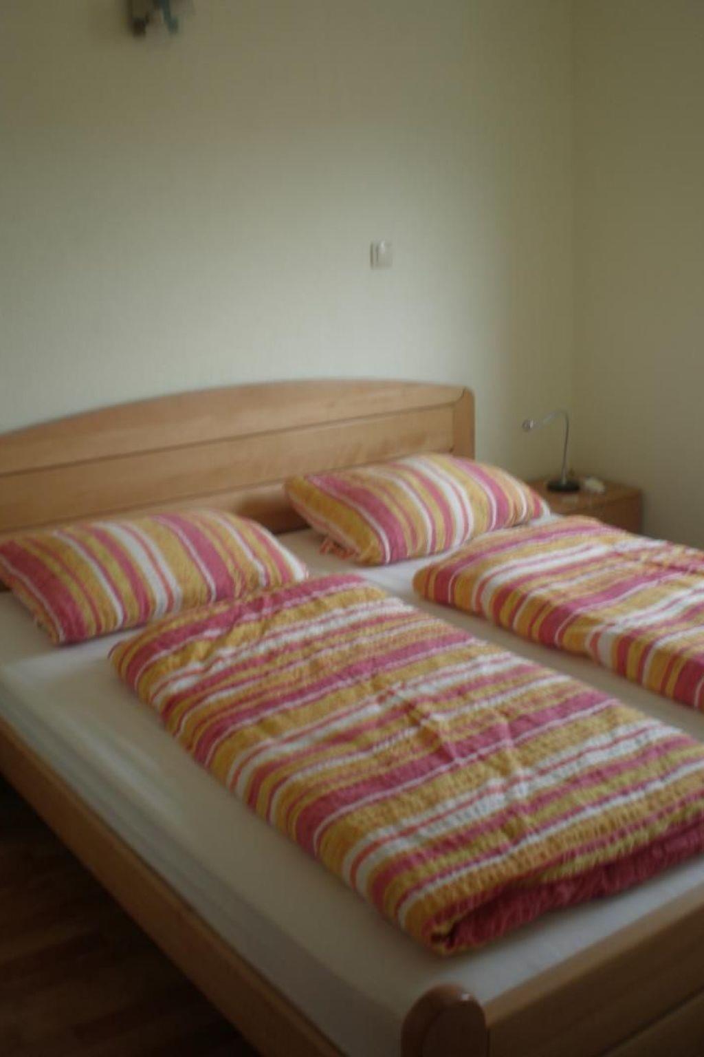 The flat is approx. 45m² in size and is suitable for up to three people. A TV with international programmes, as well as air conditioning from Inverter (with heating function) and W-LAN are available. In addition to two bedrooms with a double bed and three single beds, there is a kitchen as a common room. A small cot can be added. The flat also has a bathroom with toilet, shower cubicle and washbasin, as well as a mirror cabinet and a fully equipped kitchen. In the kitchen there are electric and gas hobs, a fridge with freezer compartment, a microwave with baking function, coffee machine, kettle and cutlery and crockery. Bed linen, towels, drying towels, washing-up liquid and toilet paper are provided and our washing machine can also be used. Washing racks are available in the flat.