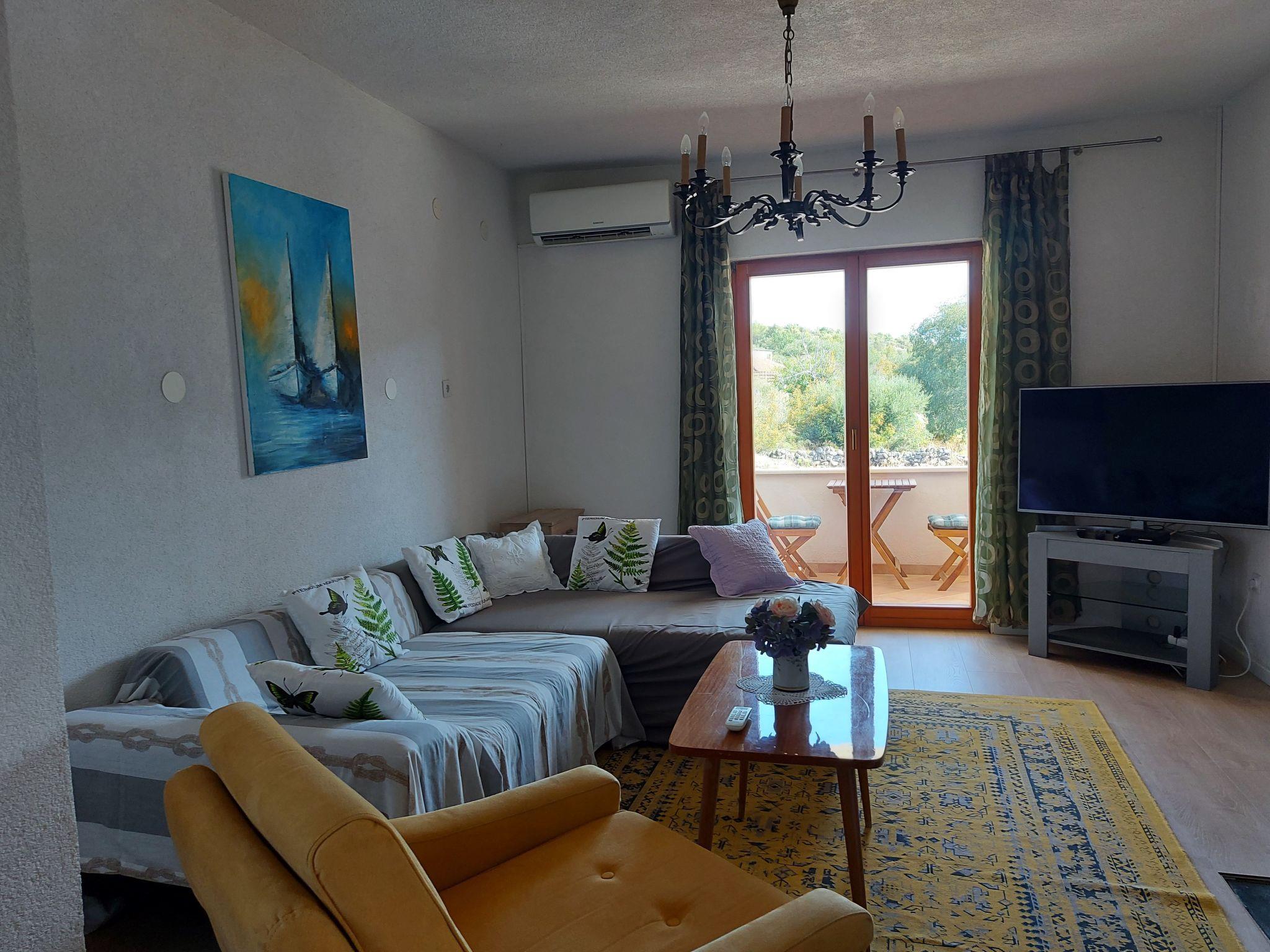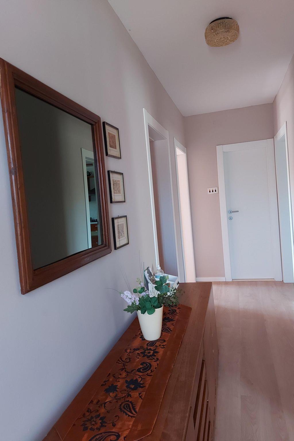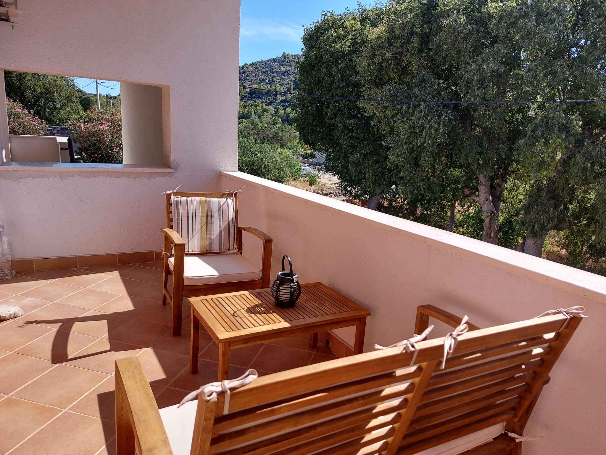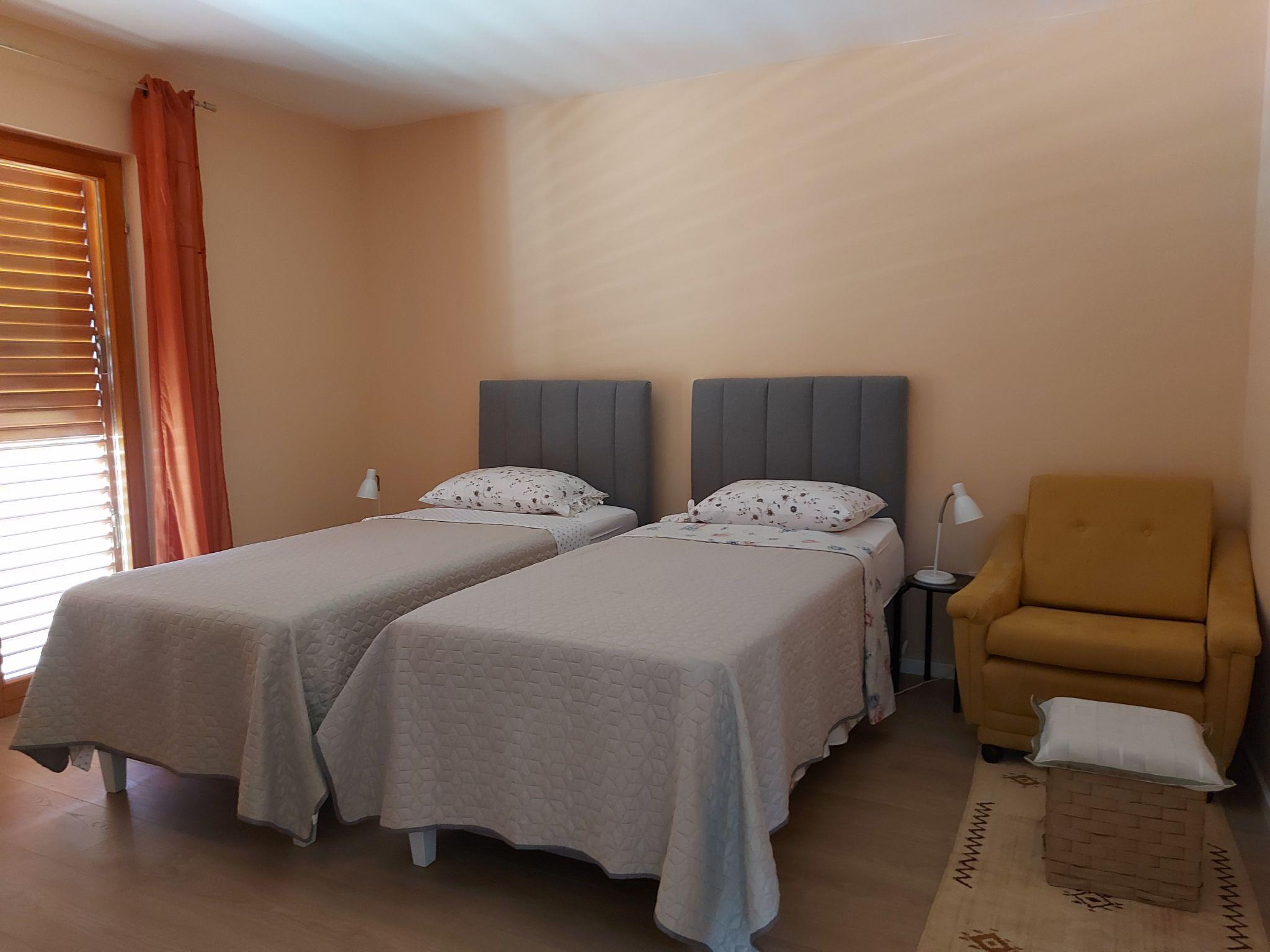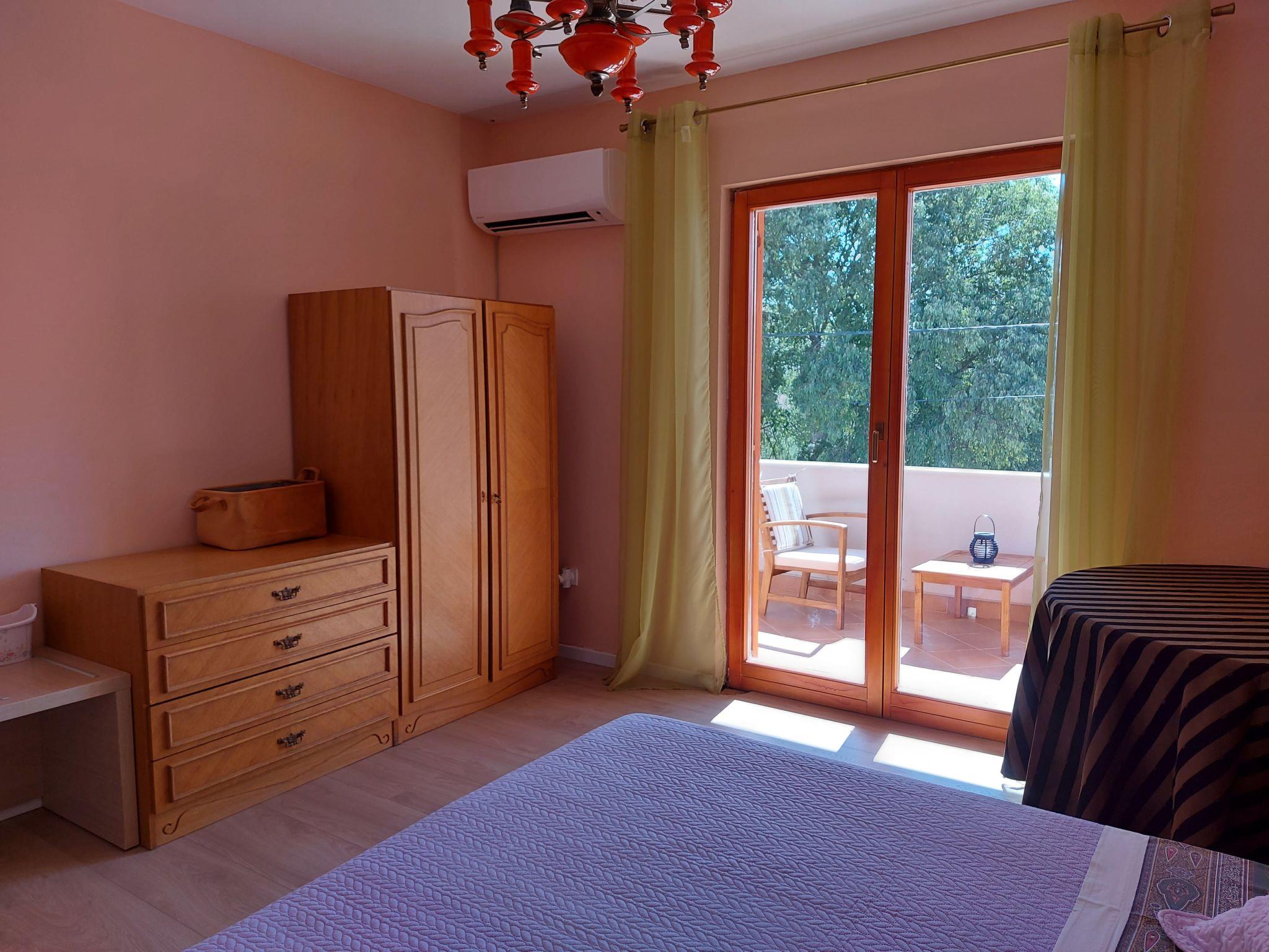 The apartment on the first floor is about 90m2 in size and comprises of the following rooms: Sleeping room 1, with own balcony and outdoor furniture, a king size double bed (1.80 m wide), and sleeping room 2, with one king size bed (1.80 m wide) which can be converted in two single beds. Living room with a sofa and a flat screen TV with satellite TV, in sleeping room 2 there is a fen, air-conditioning are in sleeping room 1, and in the living room.