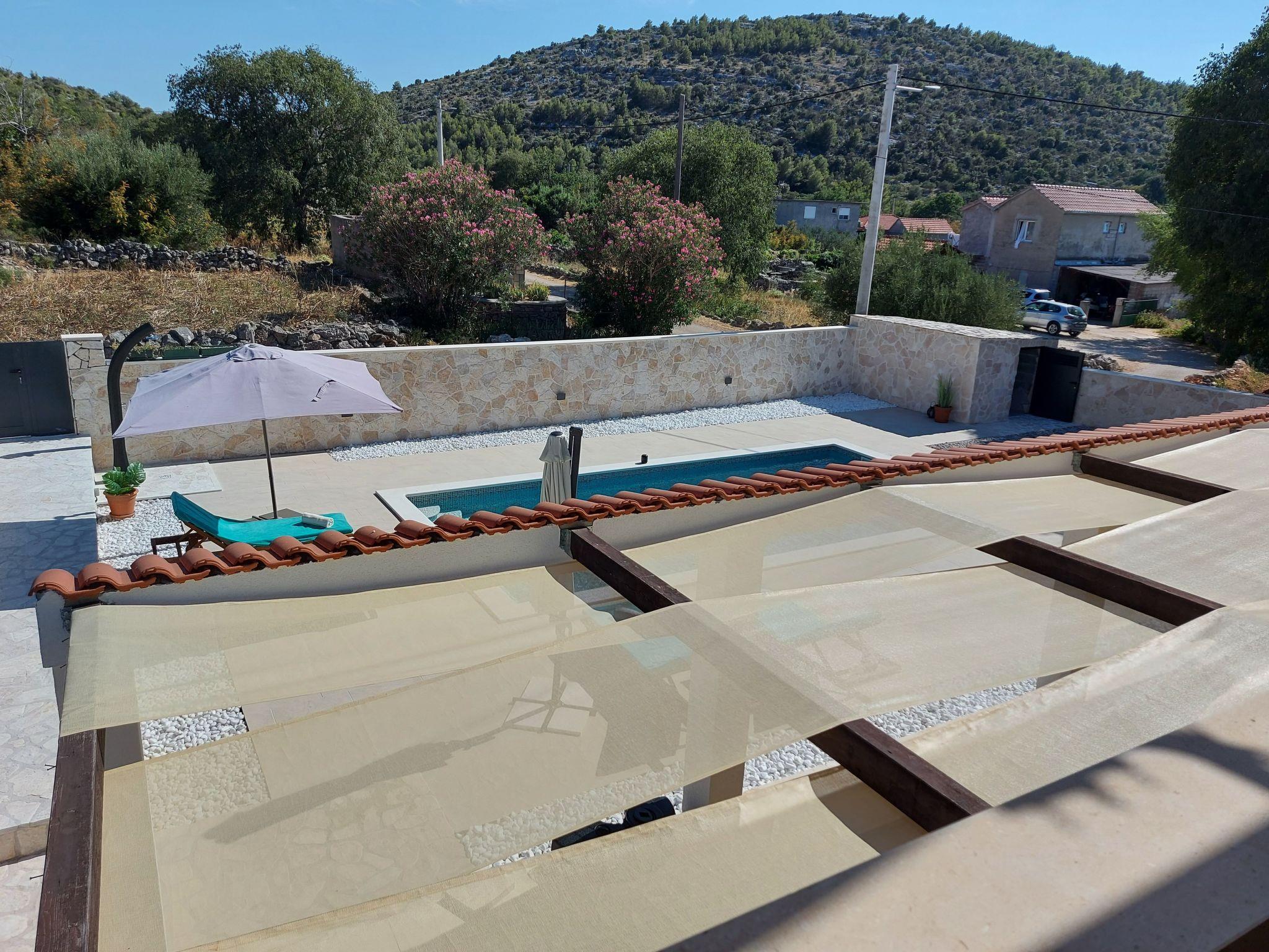 Outdoor with wood fired grill/barbecue, swimming pool with sun loungers a sunshade for sole use, parking places for two cars. Property is detached and fenced. Next to the pool is a small grassy garden where your pet can walk.
