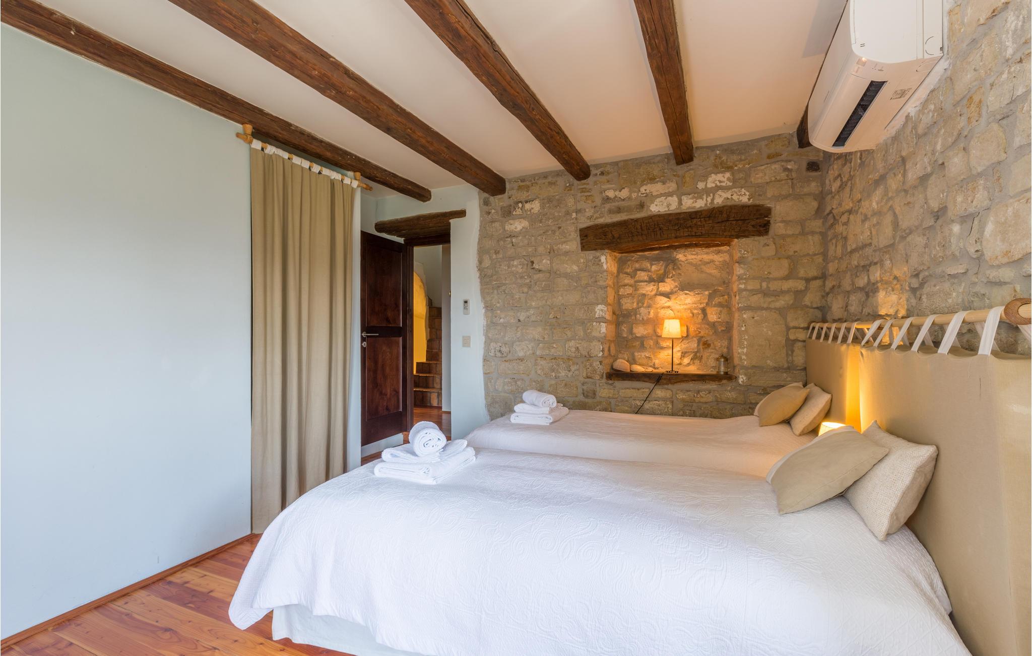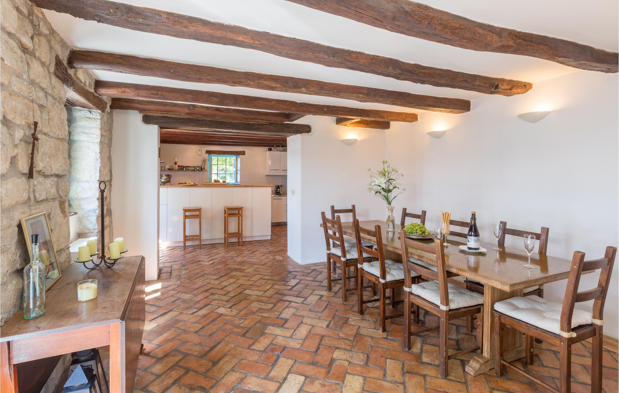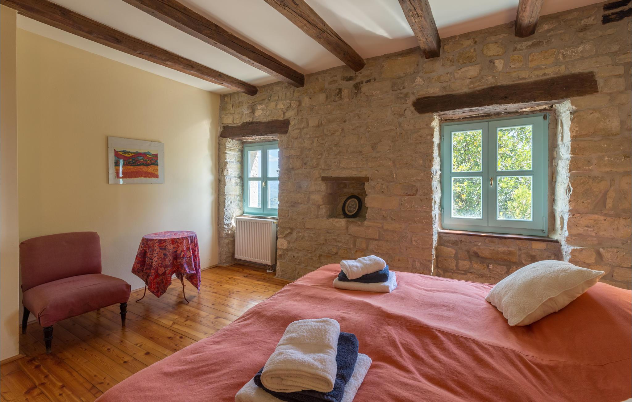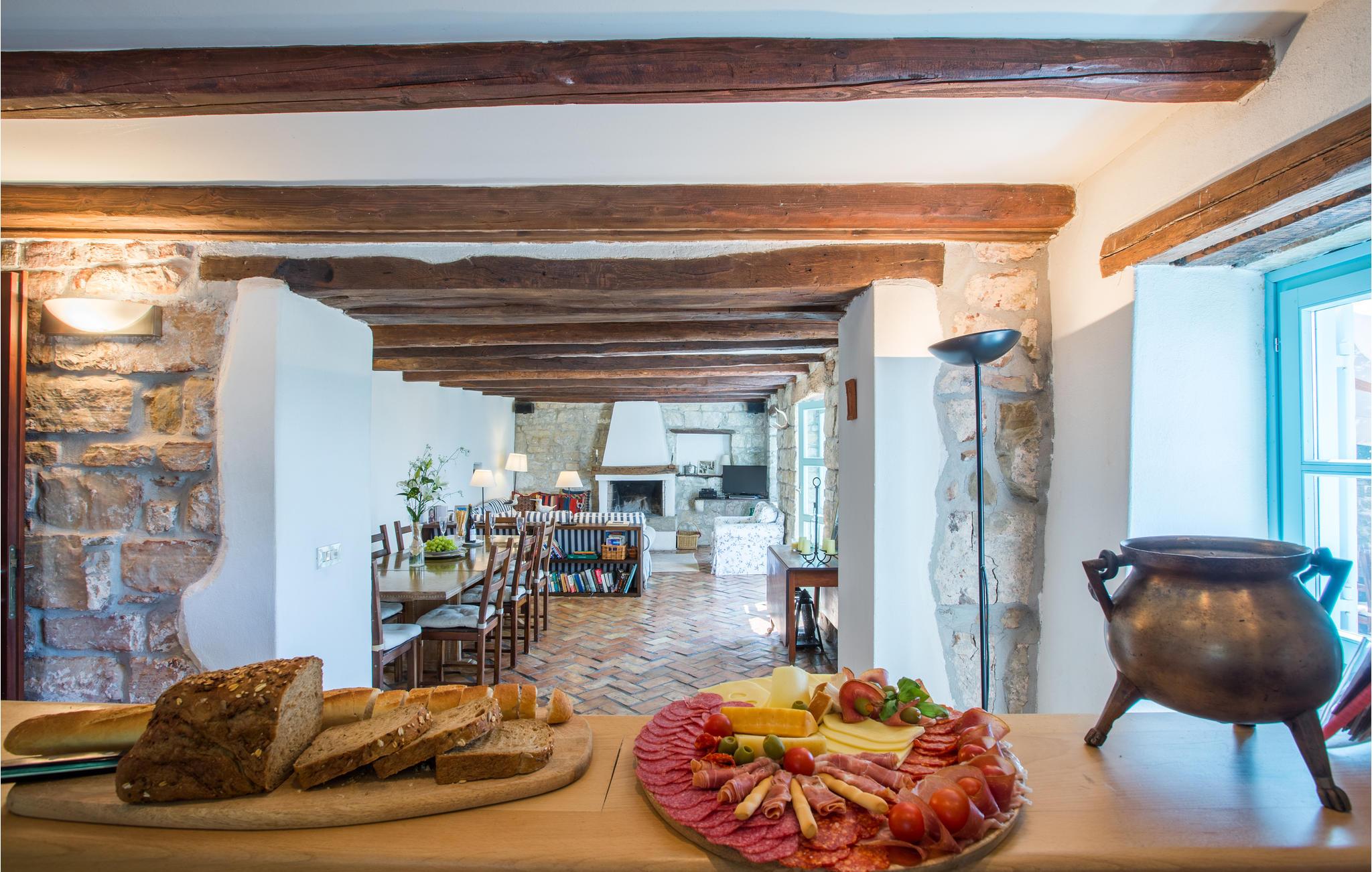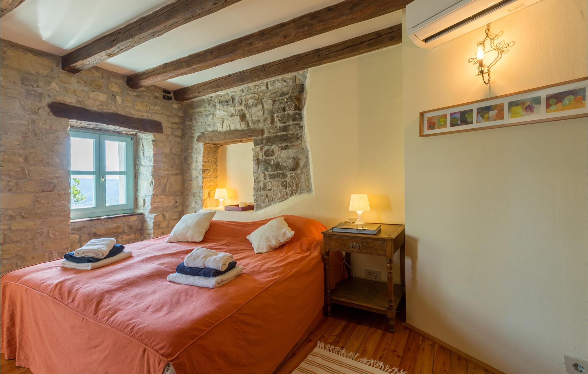 Her kan du føle deg som hjemme. I tre etasjer kan du nyte den flotte utsikten over landskapet i det nordlige Istria og sette deg godt til rette i huset. Frittliggende bjelker, lyse vegger og steinvegger gir det store huset sin tradisjonelle sjarm. Men også møblene og utstyret gir deg komfort og et flott miljø.