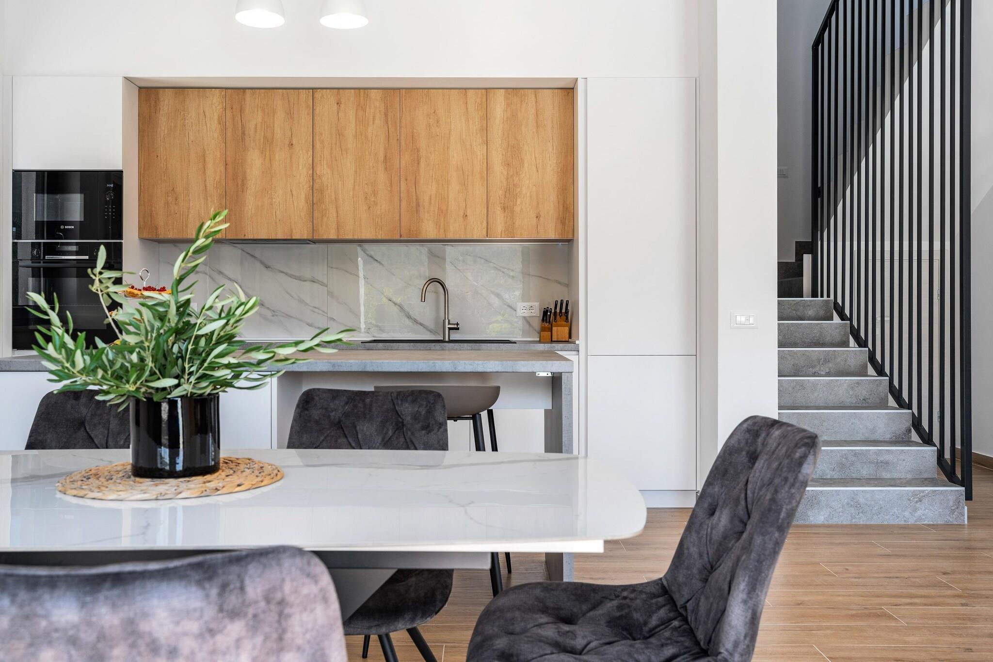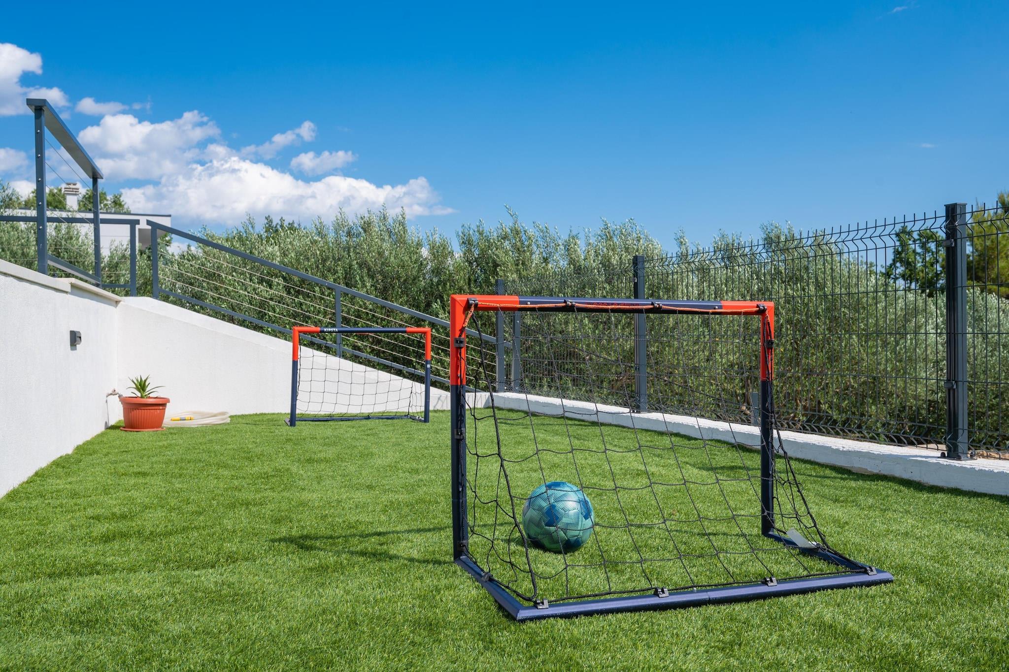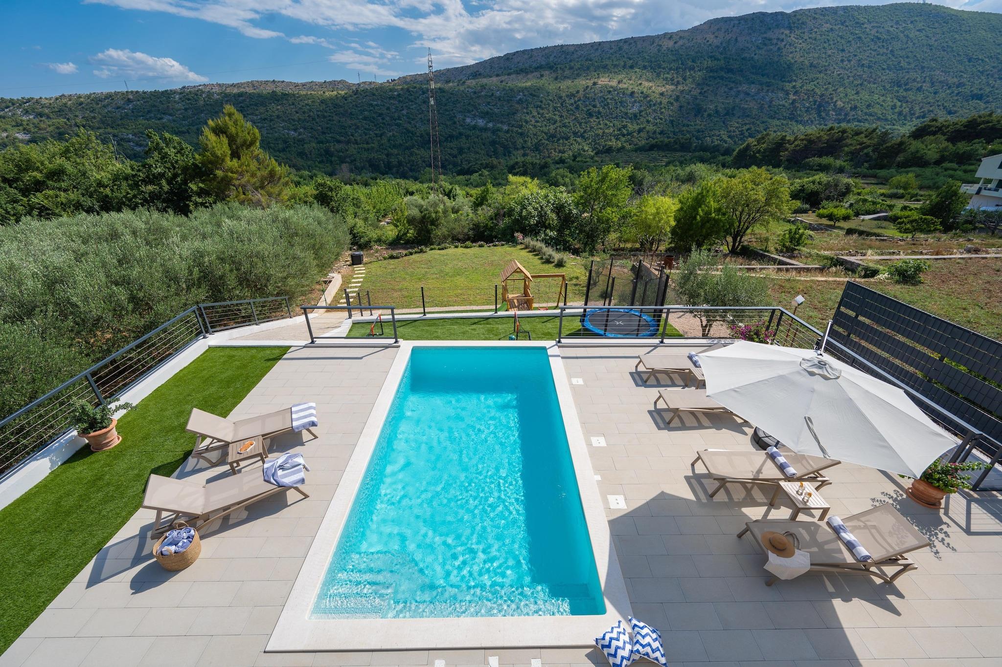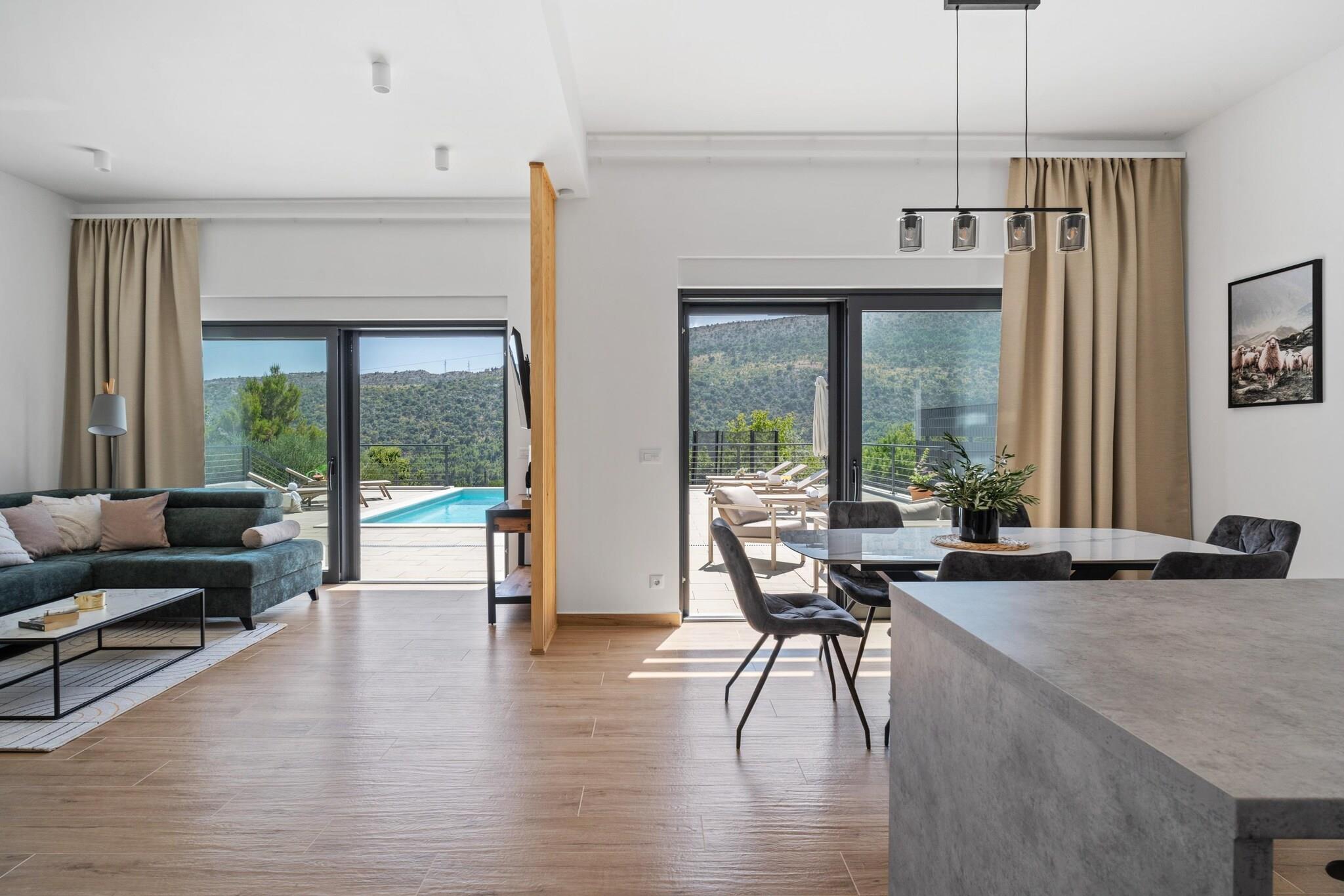 I den rolige landsbyen Naklice, like innover i landet fra kysten nær Omiš, finner du denne fantastiske Villa Nacle – designet for familier som ønsker plass, privatliv og enkel tilgang til både natur og sjø. Denne villaen med klimaanlegg for seks gjester er spredt over 160 m² på en 1000 m² stor privat tomt, og gjør at hverdagen føles avslappet og komfortabel. Innvendig er huset sentrert rundt en lys, åpen stue hvor stue, spisestue og fullt utstyrt kjøkken flyter naturlig sammen. Foreldre kan slappe av mens barna ser på TV, spiller spill på PS eller samles rundt bordet for felles måltider, og et bad for ekstra komfort. Ovenpå finner du tre velutstyrte soverom, hvert med TV, som gir alle sin egen rolige plass på slutten av dagen med et felles bad. Høyhastighets Wi-Fi, vaskemaskin og tørketrommel, og gjennomtenkt oppbevaringsplass støtter lengre familieopphold med letthet. Utenfor blir den virkelige familiens lekeplass. Det private oppvarmede bassenget ligger med fri utsikt fra det overbygde sitteområdet. En trampoline, et skyggefullt loungehjørne, en solterrasse og et utendørs spiseområde skaper fleksible soner for lek, hvile og måltider. Grillen forvandler måltidene til en utendørs piknik, mens barna slapper av i nærheten. Daglige utflukter holder seg enkle. Strender, butikker og det historiske hjertet av Omiš ligger bare en kort kjøretur unna. Aktive familier kan utforske Cetina-elven for rafting og ziplining, mens kulturelle dagsturer til Split gir variasjon. En høydepunkt for familien inkluderer en båttur til Zlatni Rat på Brac. Villa Nacle passer best for familier som ønsker en trygg hjemmebase med et privat oppvarmet basseng, lekeplass for barn og rask tilgang til strender, natur og Dalmatias mest familievennlige eventyr – uten presset fra feriestedets folkemengder.