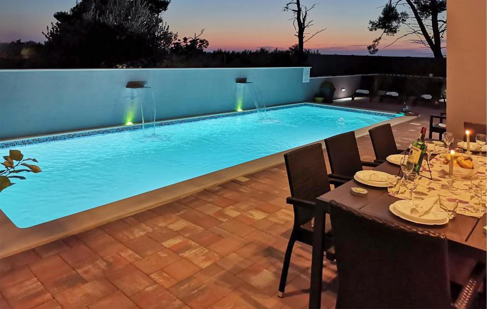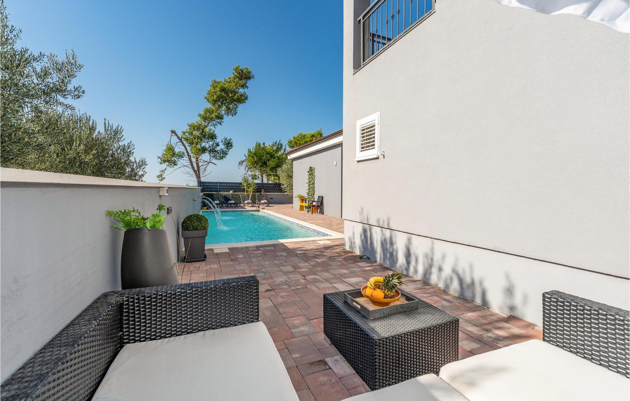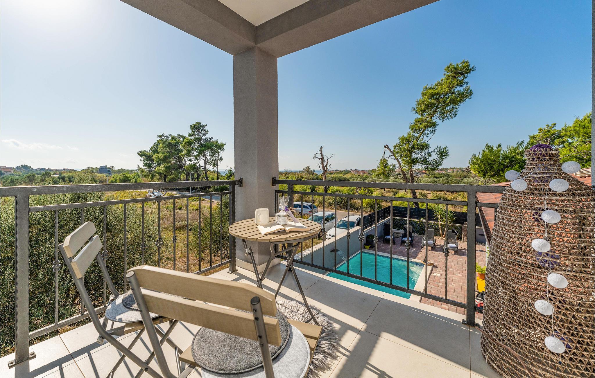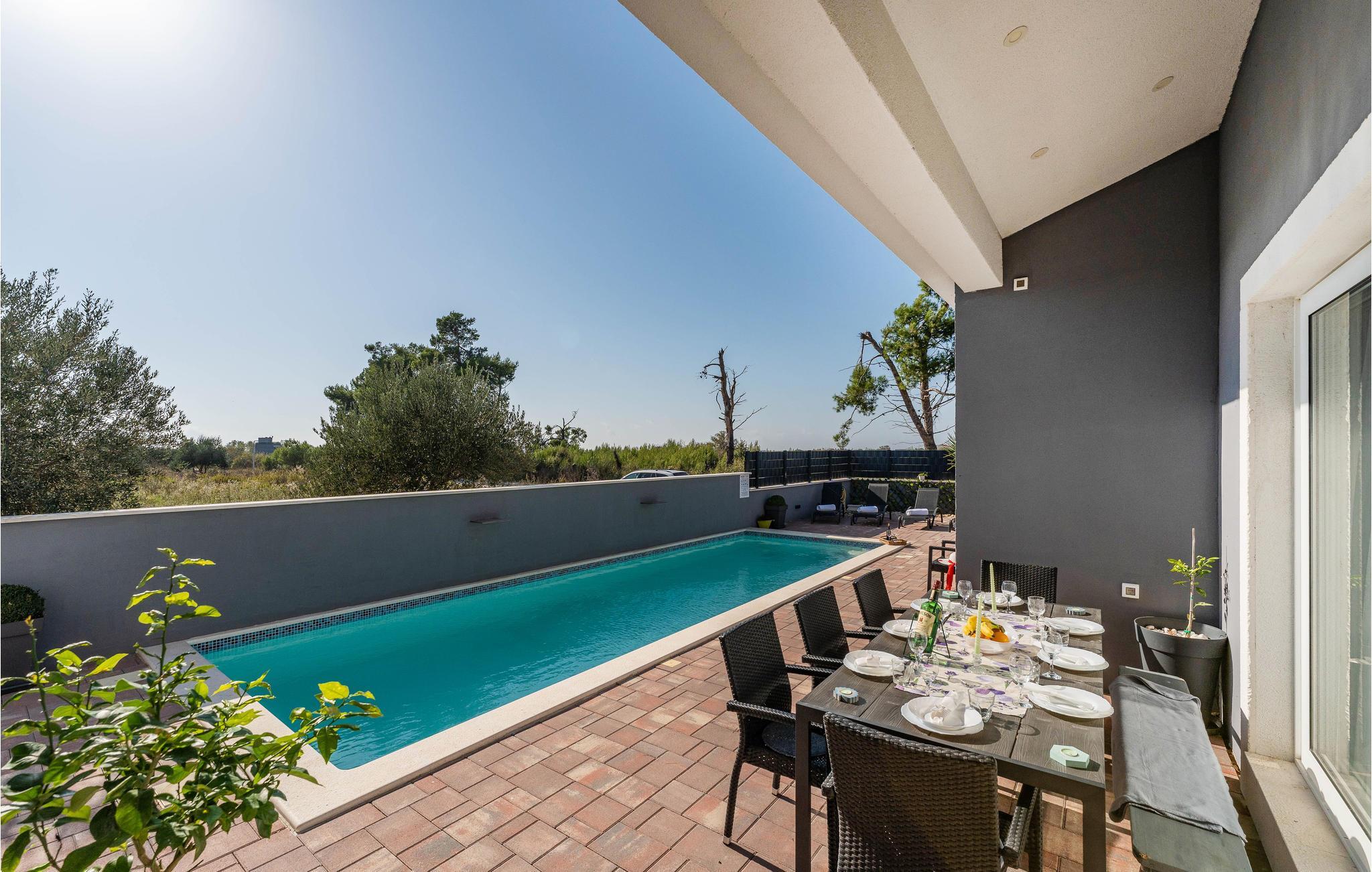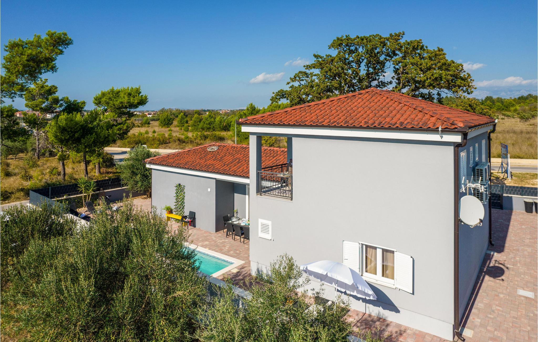 Mellom kystbyene Nin og Pivlaka ligger dette store og hyggelige feriehuset med basseng. Her kan du nyte komforten og den harmoniske innredningen som skaper en herlig atmosfære. Sammen med det store terrassevinduet har stuen forbindelse til terrassen og hagen. Du kan også finne en rolig plass på balkongen i 1. etasje, hvorfra du kan se ut over havet. Svøm, sol deg, spis og grill utendørs, og gled deg til uforglemmelige timer i huset og hagen.