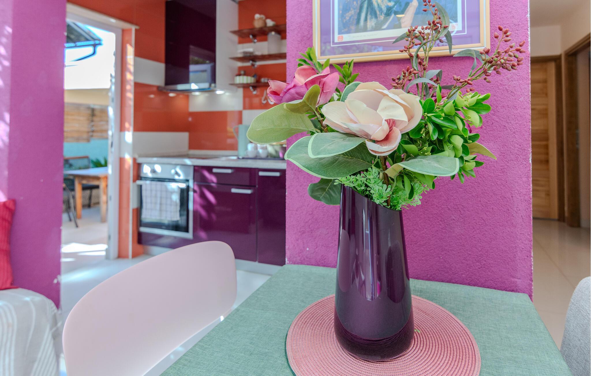 I denne vakkert innredede, kompakte ferieleiligheten med hage bor du ikke langt fra nærmeste sandstrand. Den fargerike atmosfæren innbyr til en bekymringsløs familieferie. Start morgenen med en nybrygget kopp kaffe og en frokost der hele familien samles ved spisebordet på terrassen under den store parasollen. Det er også koselig i sofaen i stuen, der du kan forberede deg til feriedagen i fred og ro. I hagen er det rikelig med plass til at barna kan løpe rundt. Her finner du også alt du trenger for en hyggelig grillkveld.
