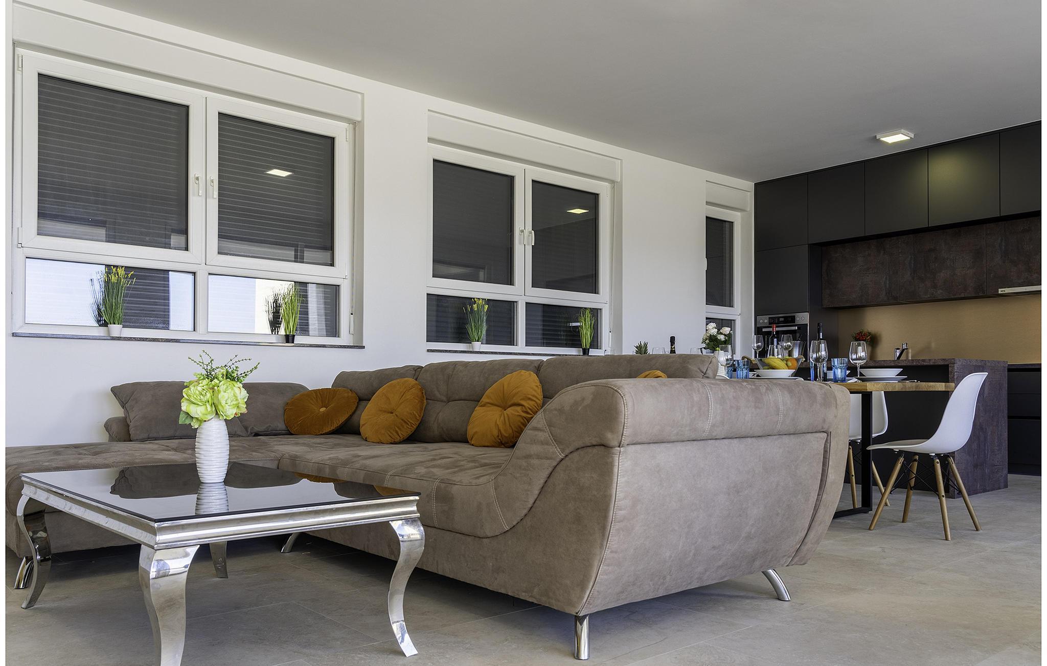 Så snart du kommer inn i den elegante Villa Nin 2, vil du føle en følelse av romslighet og komfort. Den stilfulle stuen med sin komfortable sofagruppe åpner opp mot de store panoramavinduene, slik at du kan nyte en fantastisk utsikt over naturen og havet. Varme farger, fine materialer og smakfulle detaljer gir rommet en hjemmekoselig atmosfære. Slå deg ned ved det store spisebordet og nyt sosiale kvelder med felles måltider eller morsomme brett- og kortspill.