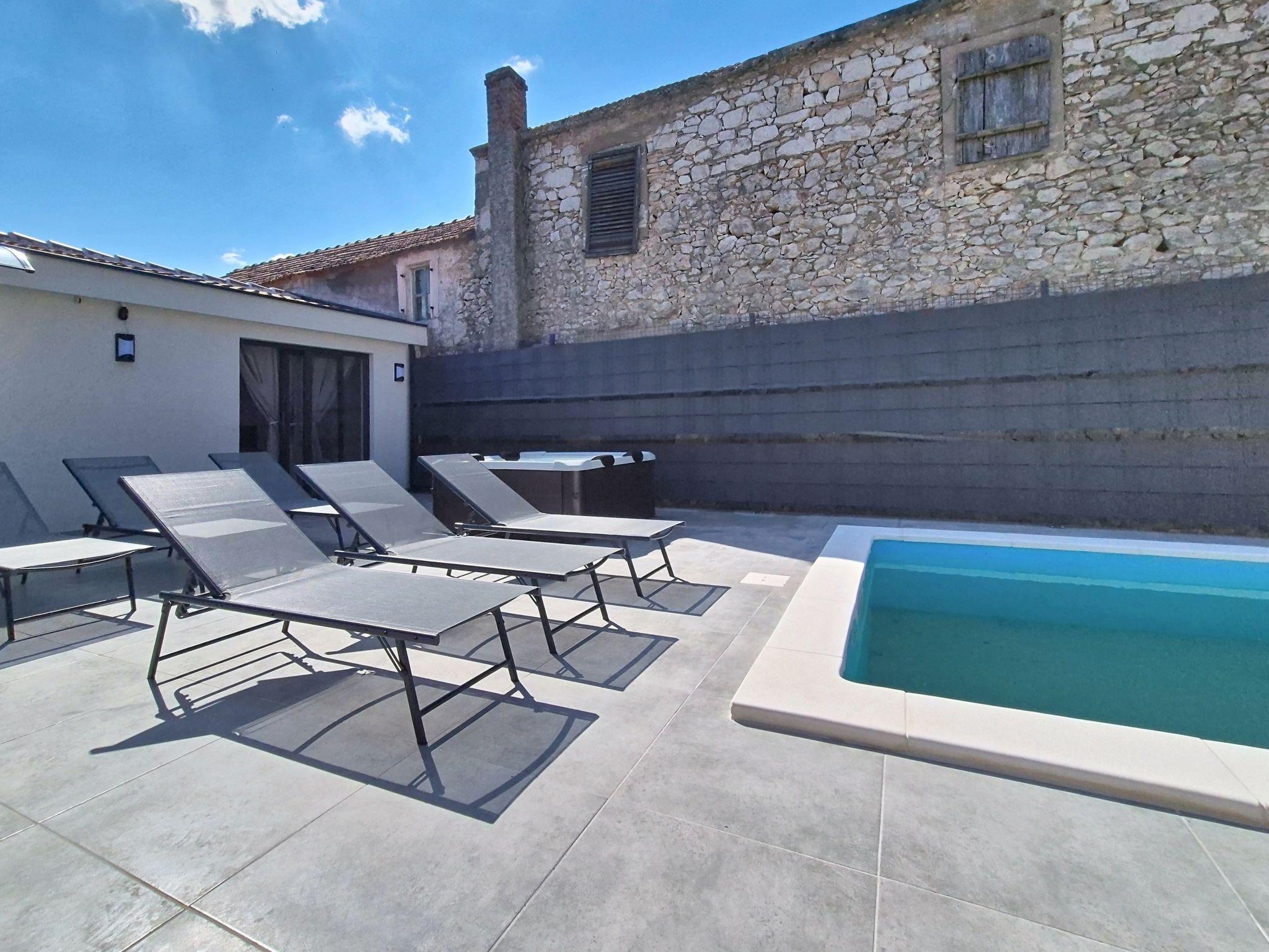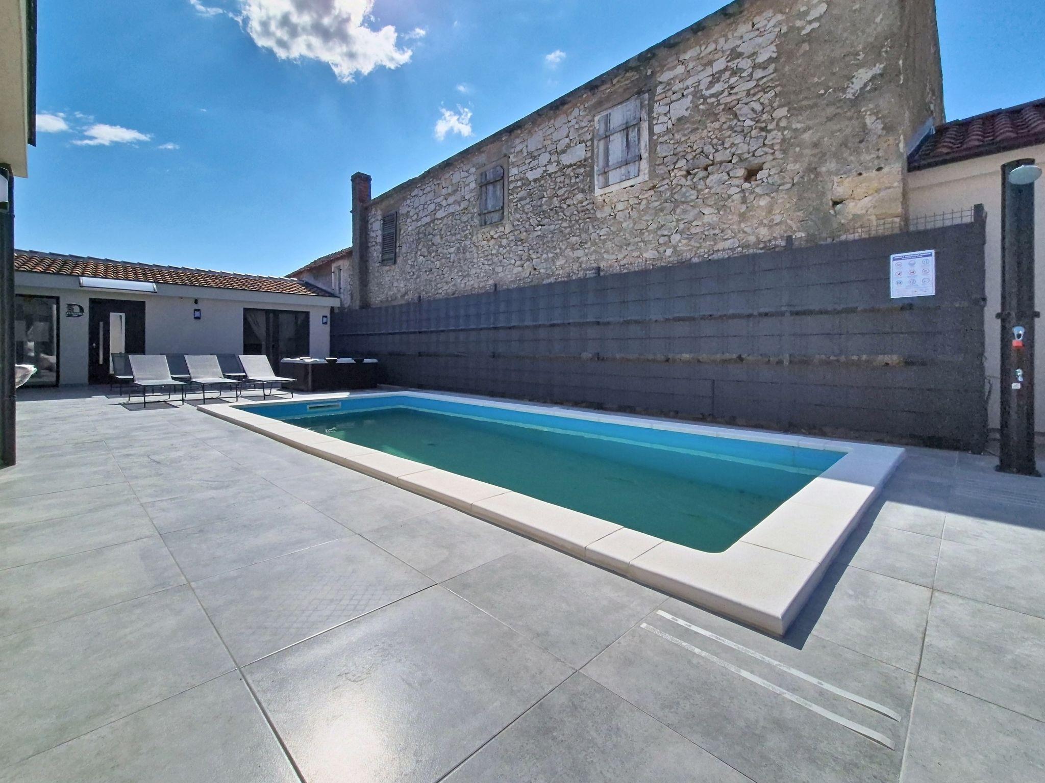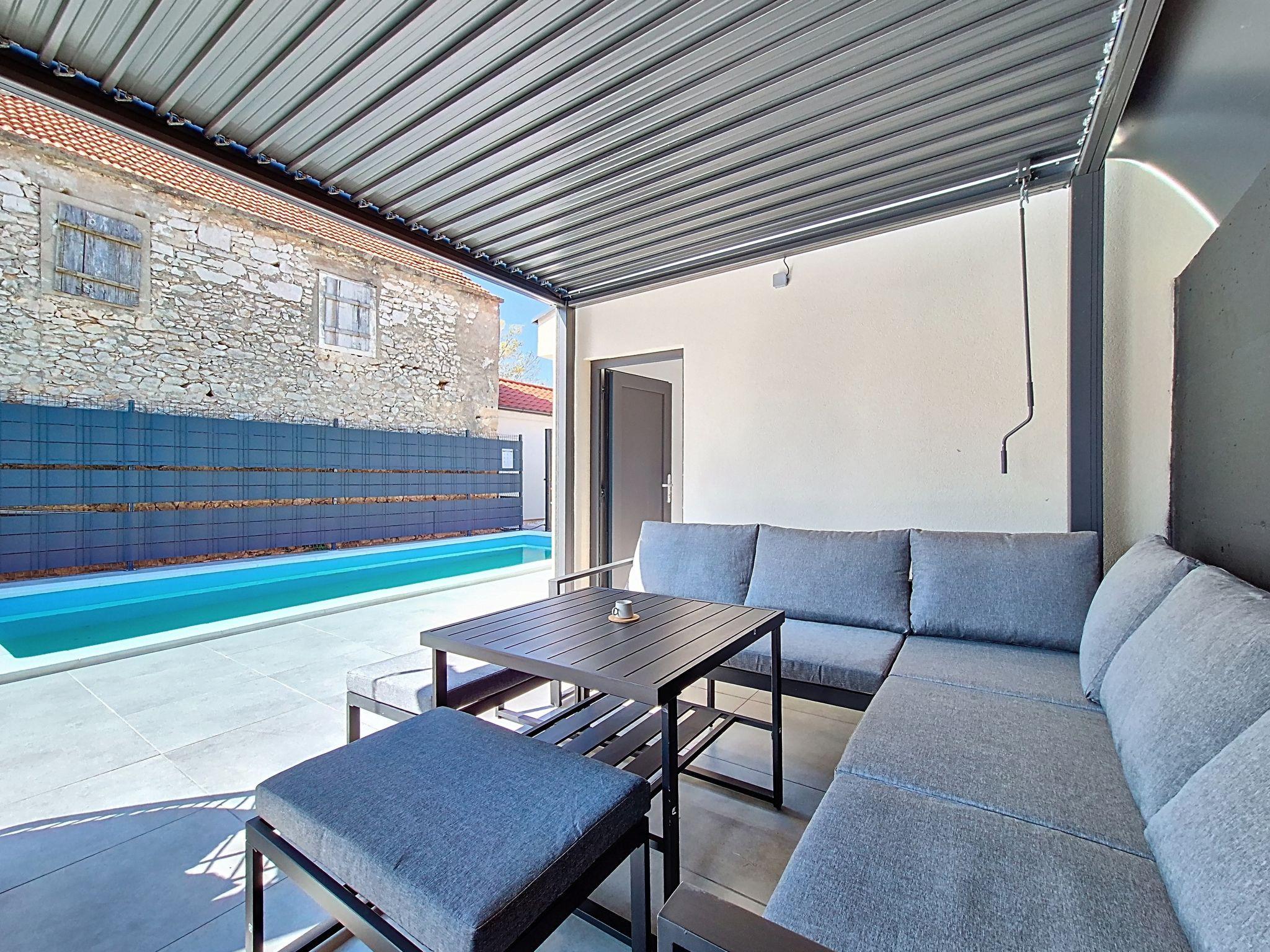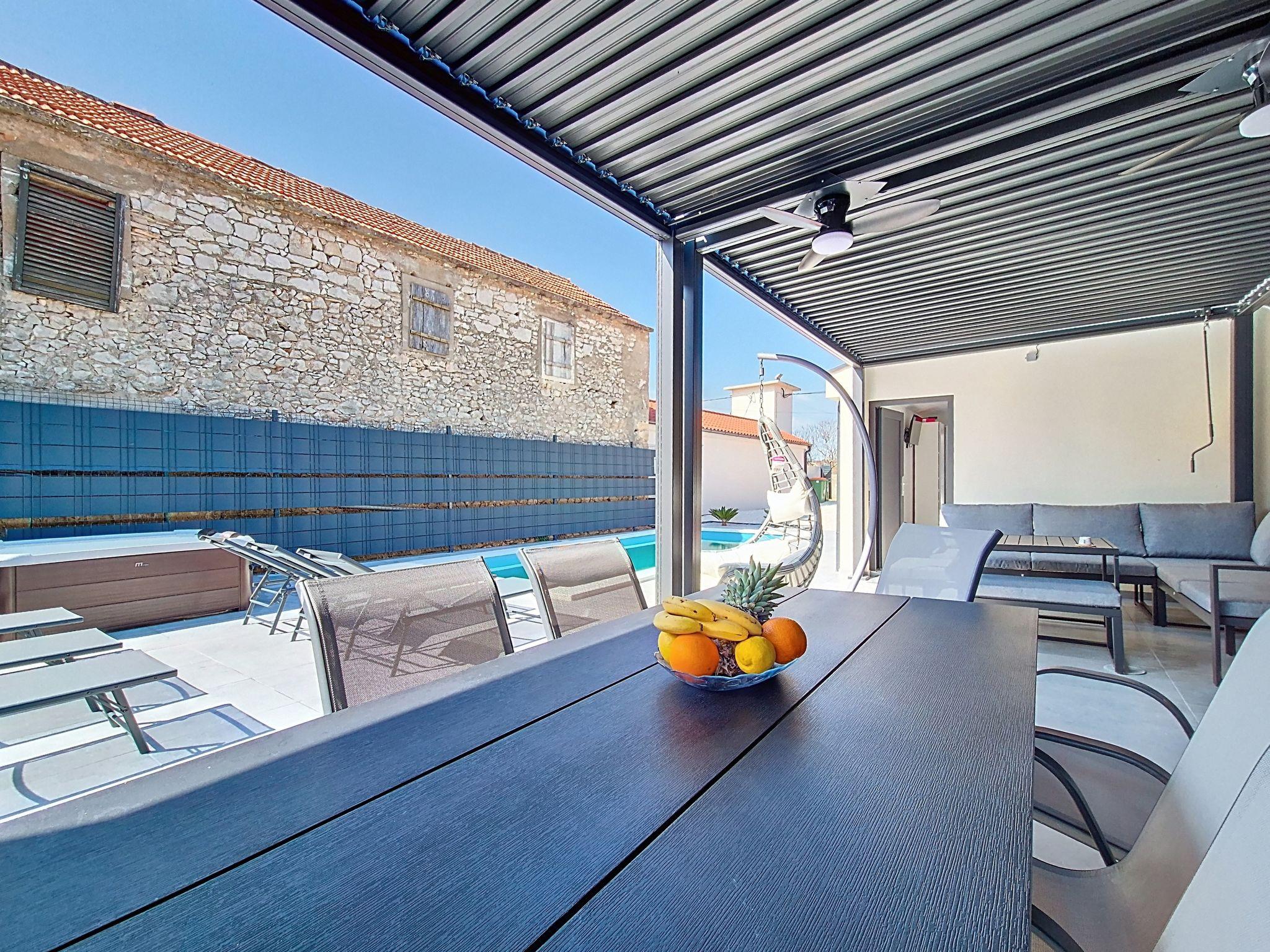 Single-family house "Danica", built in 2026. 8 km from the centre of Nin, in a quiet, sunny position, 8 m from the sea, 8 m from the beach. Private: property 300 m2 (fenced), swimming pool (7 x 3 m, depth 150 cm, seasonal availability: 01.May. - 01.Oct.). Outdoor shower, hot tub, pergola (30 m2), garden furniture, barbecue. In the house: internet access, washing machine. Parking at the house on the premises. Shop 1.5 km, restaurant 3 km, bus stop 2 km, sandy beach 8 km pebble beach 8 km. Tennis 12 km. Nearby attractions: aquapark 12 km.