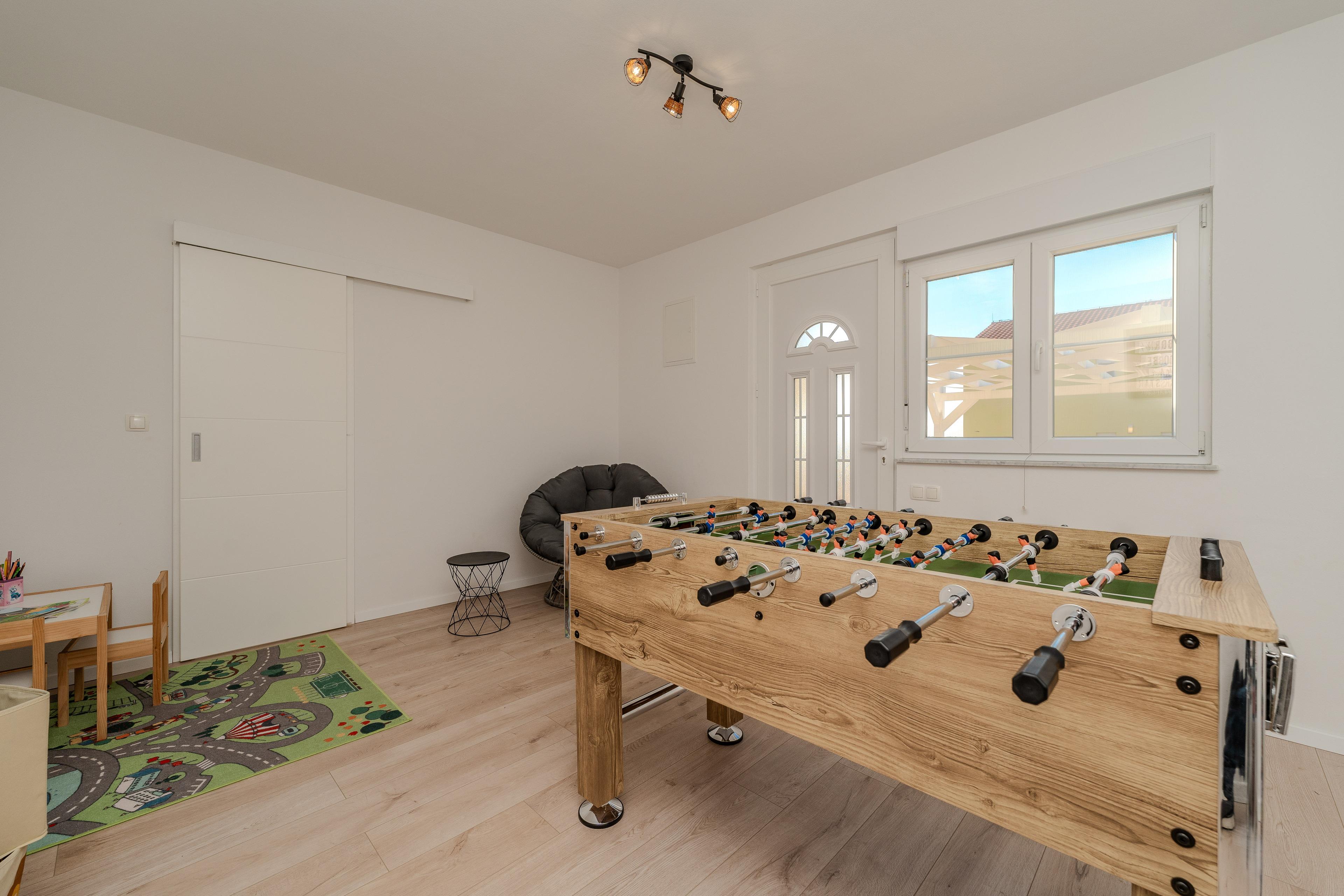 Im Erdgeschoss verteilt sich das Apartment auf ein Wohnzimmer mit voll ausgestatteter Küche und Esszimmer, ein Schlafzimmer mit Doppelbett und ein Schlafzimmer mit zwei Einzelbetten und ein Badezimmer mit Dusche. Das Wohnzimmer hat ein Schlafsofa für zwei Personen. Zu dem Apartment gehört eine 10 m² große, überdachte Terrasse mit Tisch und Stühlen. Im ersten Stock ist das Apartment ist ein Wohnzimmer mit voll ausgestatteter Küche und Esszimmer, ein Schlafzimmer mit Doppelbett und ein Schlafzimmer mit zwei Einzelbetten und ein Badezimmer mit Dusche. Apartment gehört ein 10 m² großer überdachter Balkon mit teilweise Meerblick, Tisch und Stühlen. Alle Zimmer sind klimatisiert. Auf der Rückseite des Grundstücks befindet sich ein Spielzimmer mit Darts, Tischfußball und einer Kinderecke und im Hof gibt es einen Basketballplatz, Fußball, Trampolin, Kinderspielplatz, Schaukel, Pavillon mit Tisch und Stühlen, Grill, Liegestühle und einen Sonnenschirm.